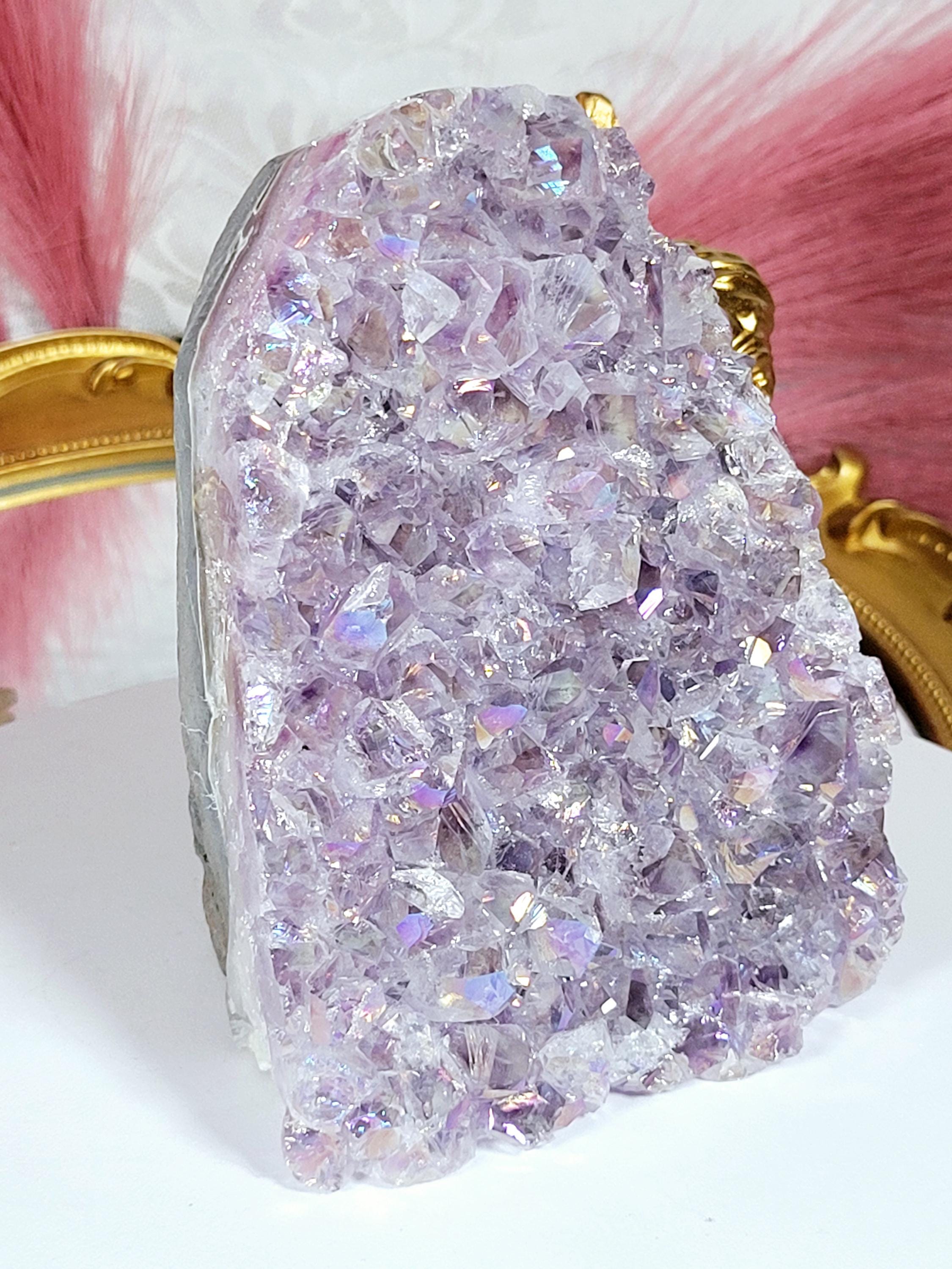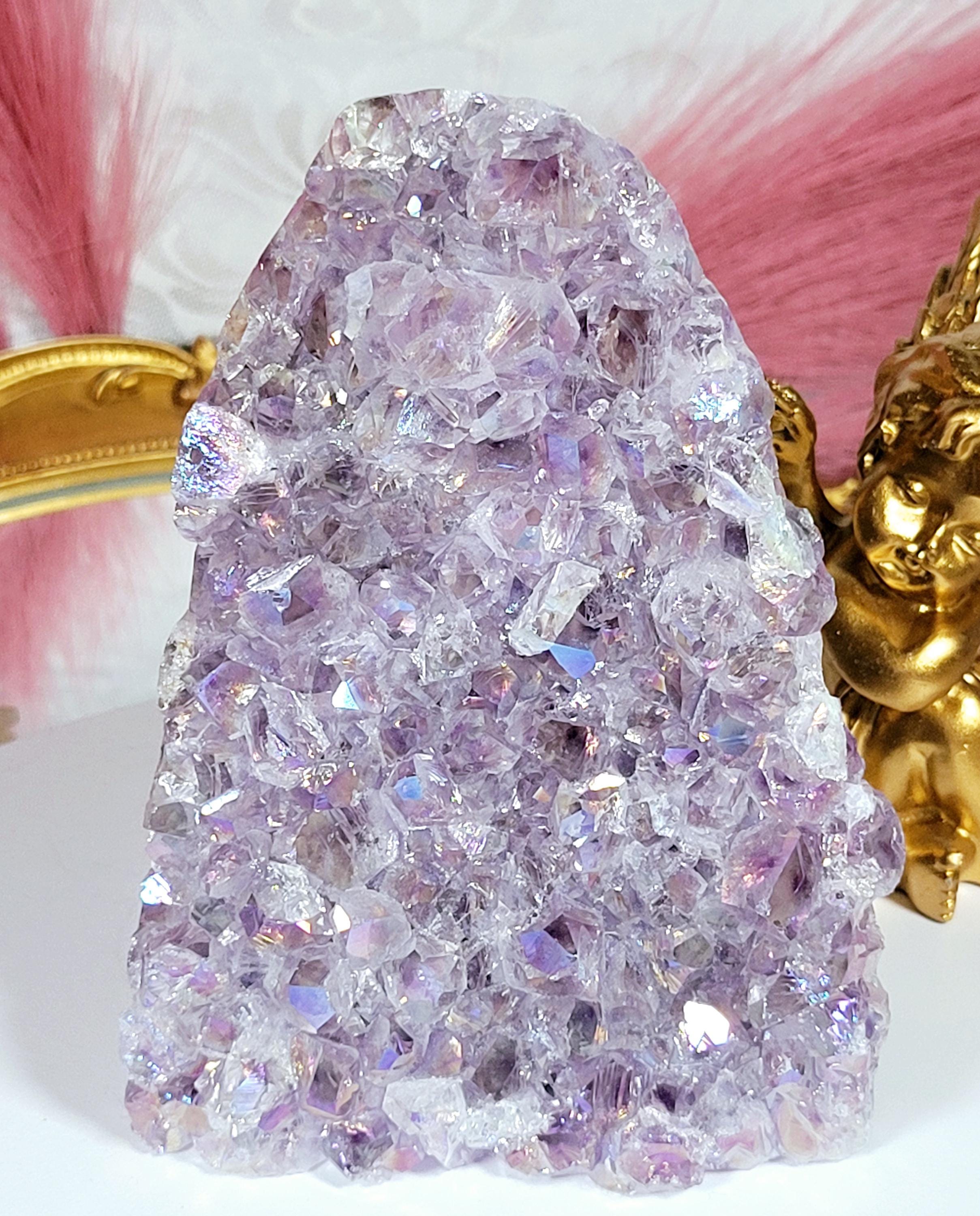 Angel Aura is a process of coating the crystal with platinum and/or gold to give the Aura its rainbow colors. This coating is said to enhance or amplify the crystal's natural benefits. The rainbow of Aura harmonizes all the chakras.