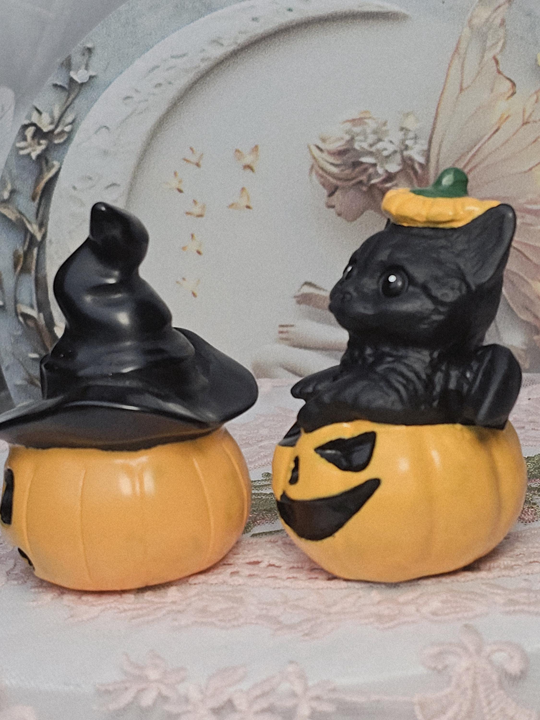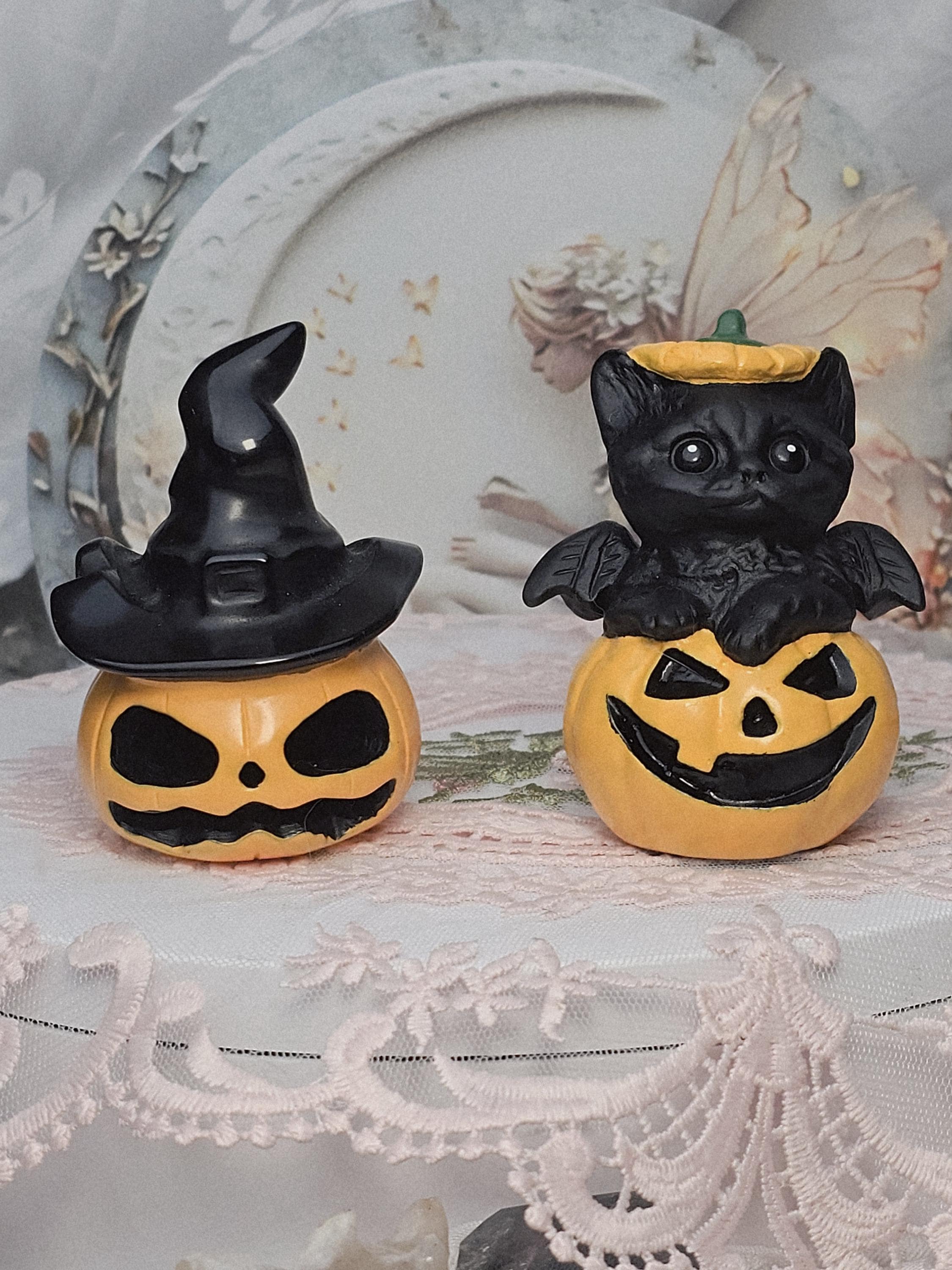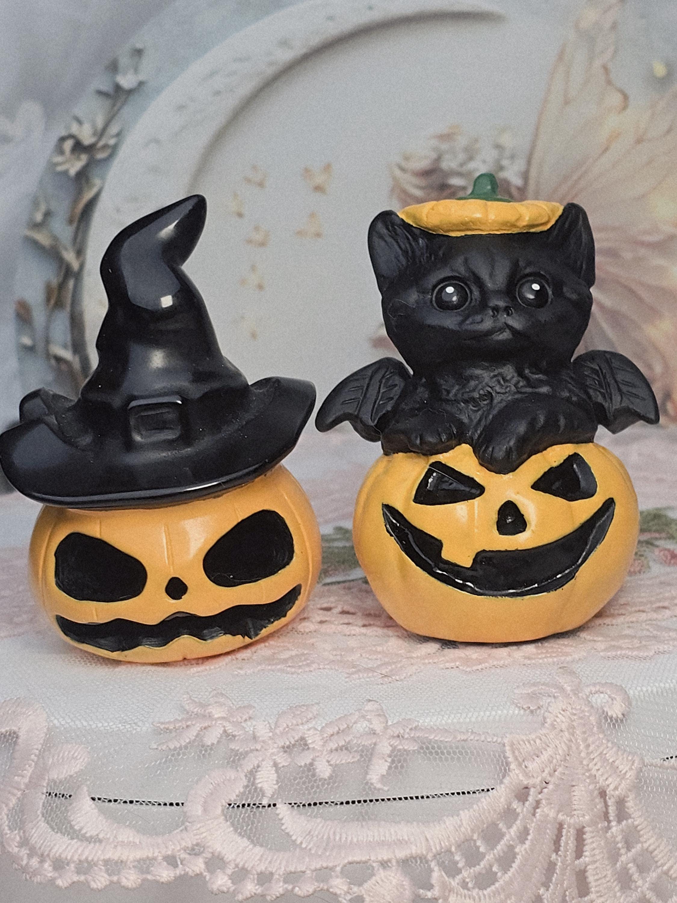Adorable Black Obsidian Halloween Set. The cat has the cutest face and has bat wings. It is a fun gift for Halloween . Anyone who loves animals will adore this cat sculpture. The Pumpkin is hollow to allow for a fairy light. The Obsidian Pumpkin is a cute tea lamp.