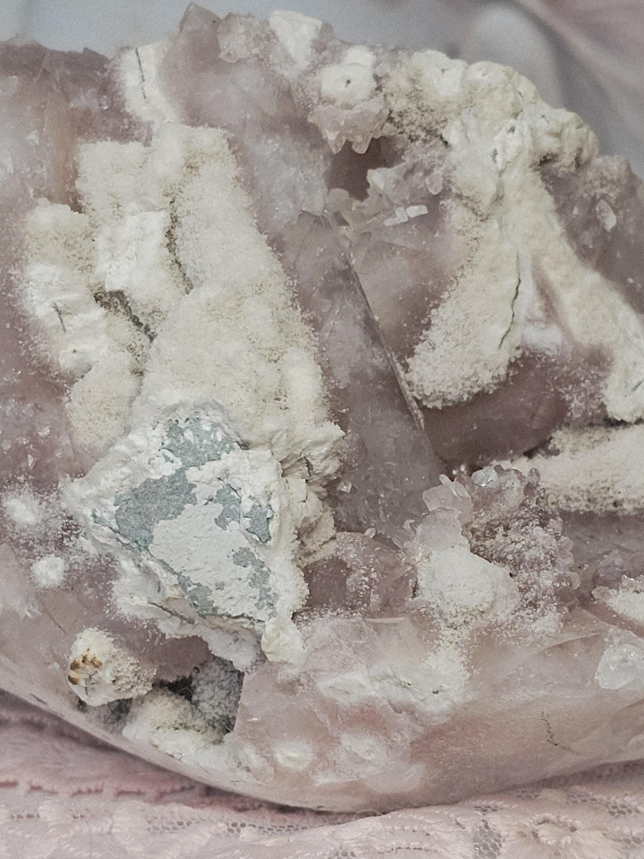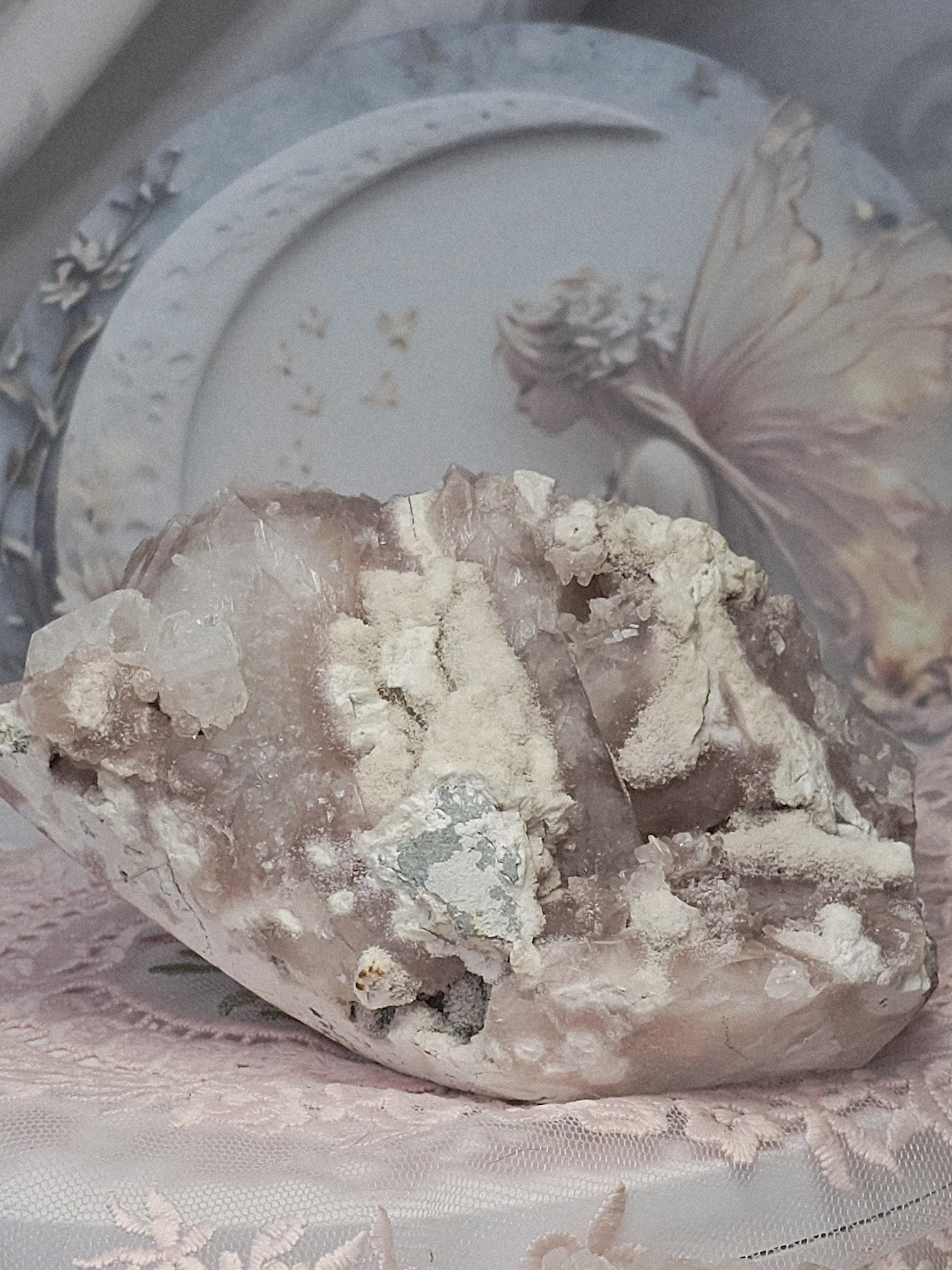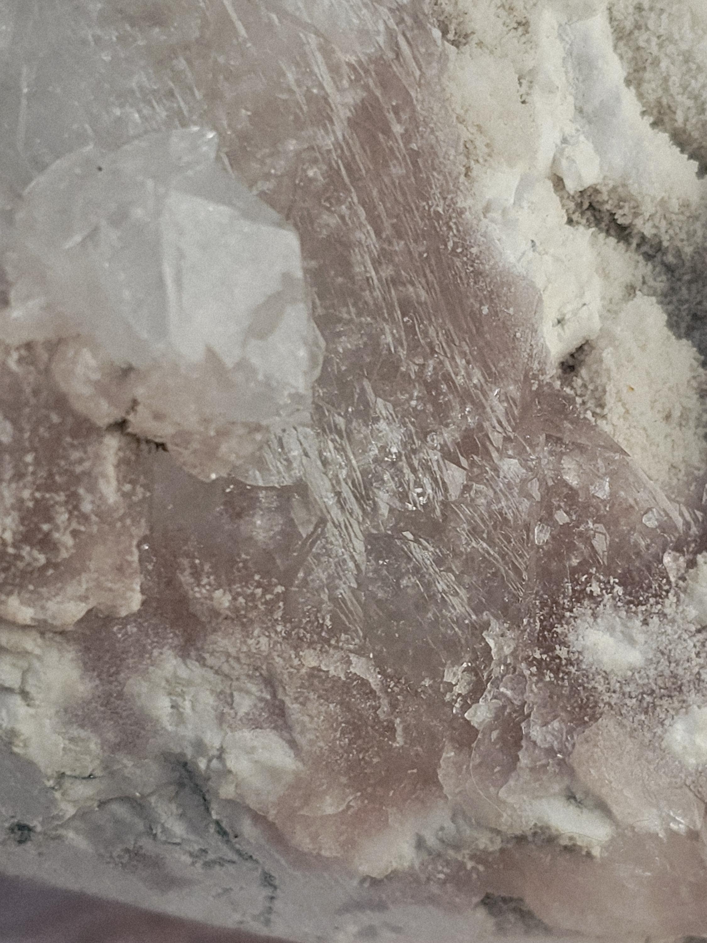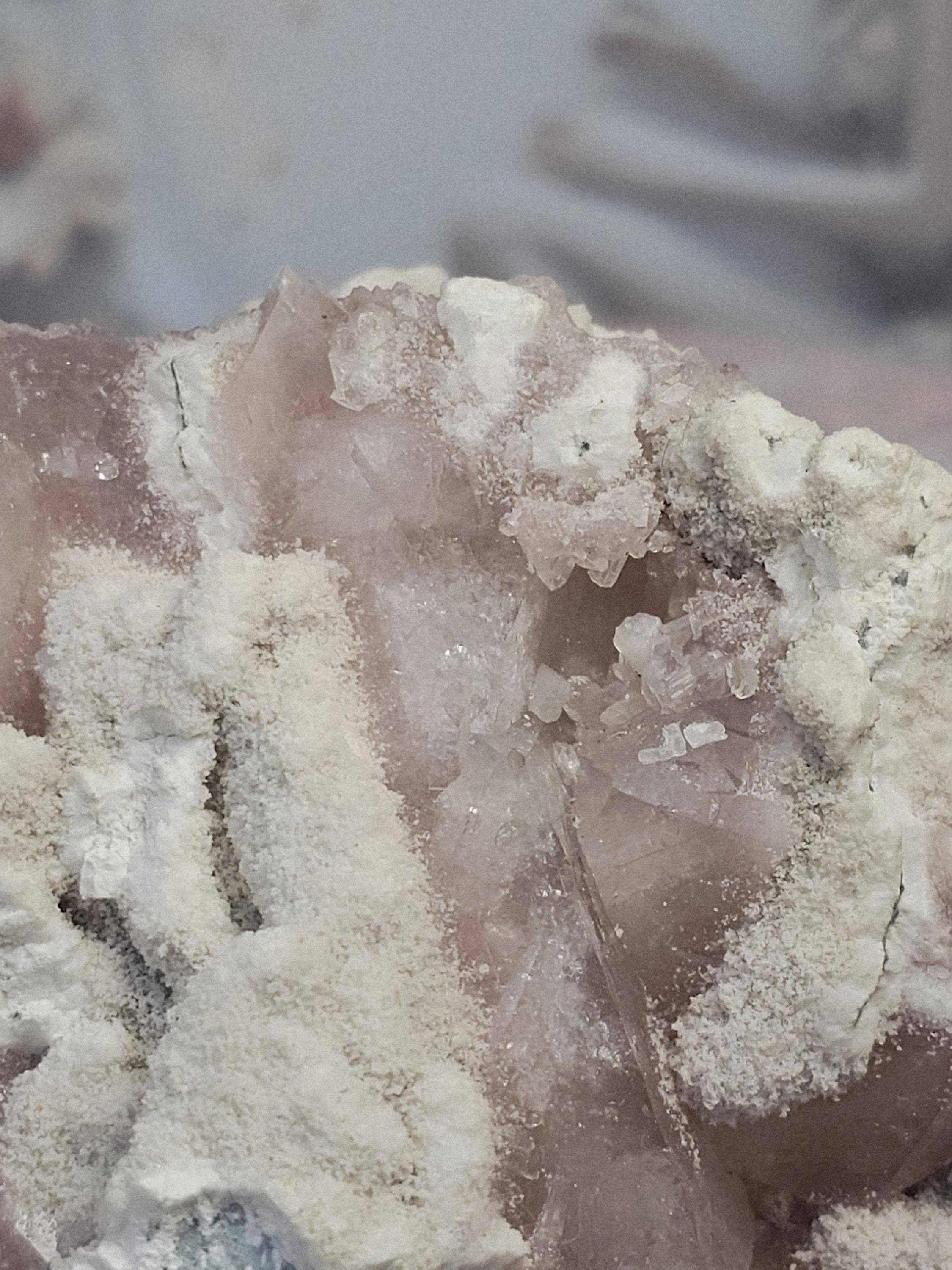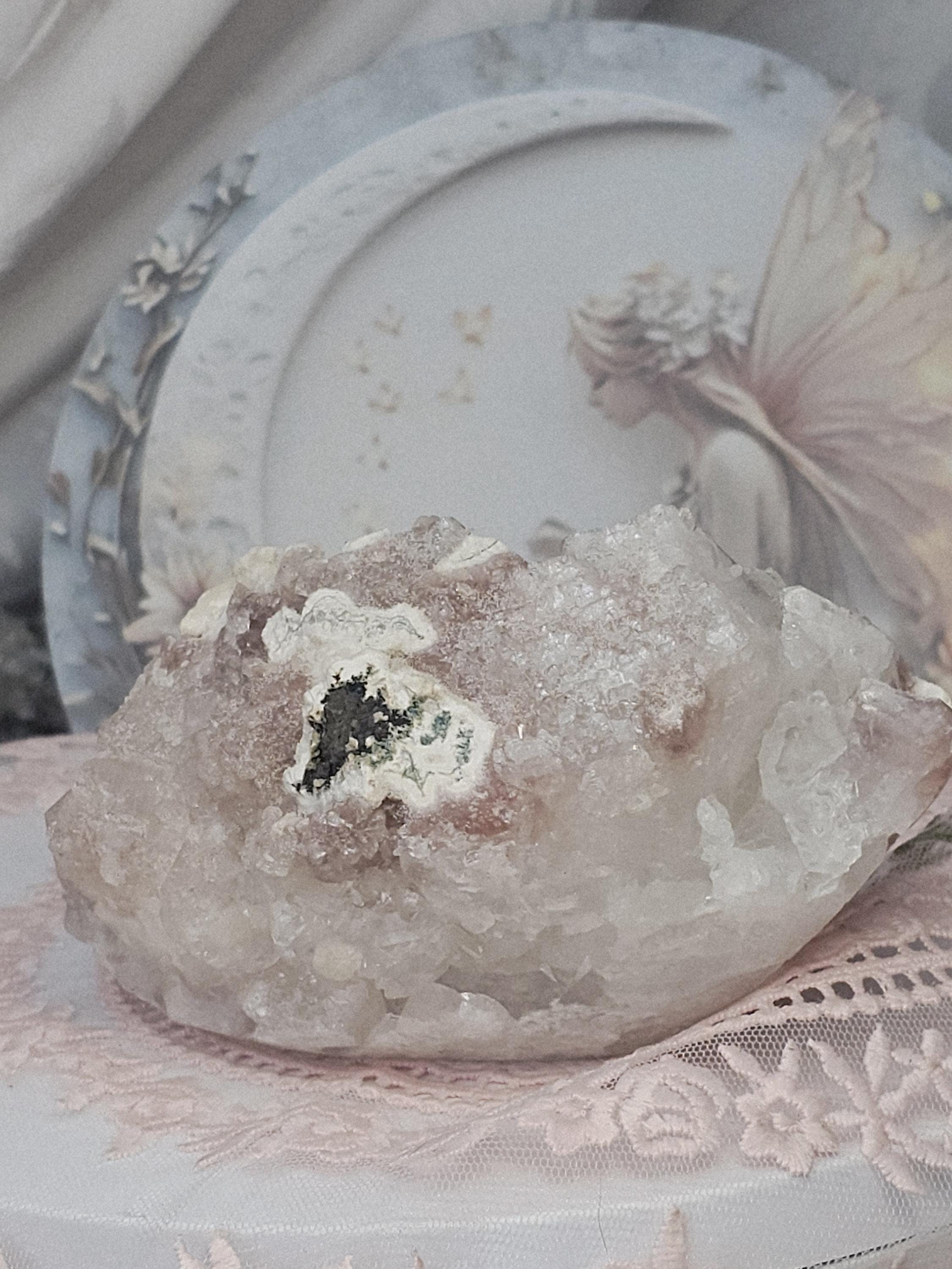 Amazingly clear Pink Sugar diamond like clusters and depth in this Pink Apophyllite with Calcite and Stillbite. Unlike most Apophyllite, Pink Apophyllite is known for its clarity and color. It's a Pink piece of paradise. It's a very flashy, sparkly crystal and one of a kind. It has rainbows throughout.This crystal is just ready for display as the gem of a crystal it is. It's a romantic crystal.