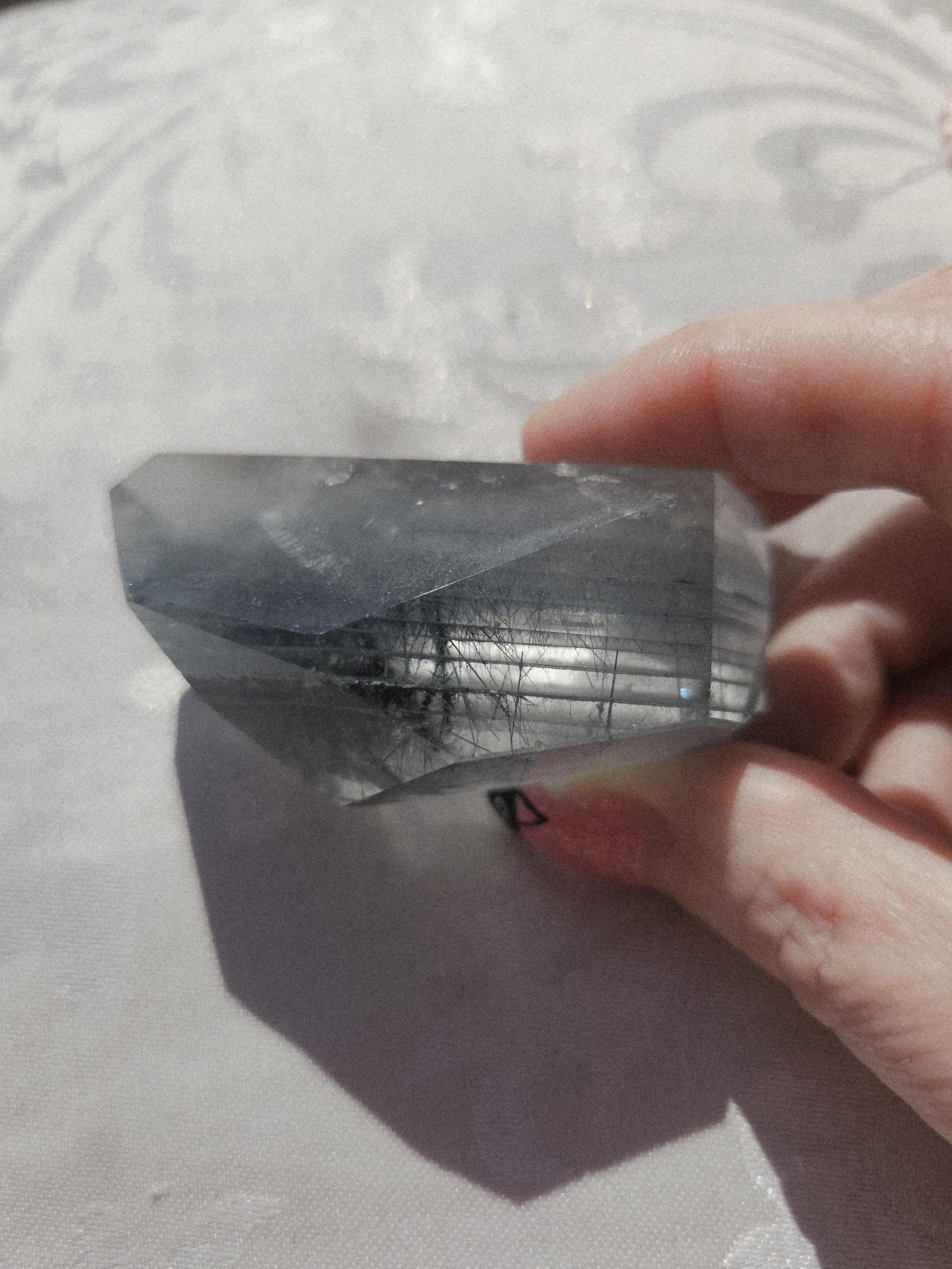 Rare Blue Tara Quartz with Black Rutile freeform. Beautiful rainbow colors surround the sphere. High quality clear quartz. Great gift for everyone on every occasion. Reiki Infused. It's a luxury, Statement Piece Crystal with a very high vibration.