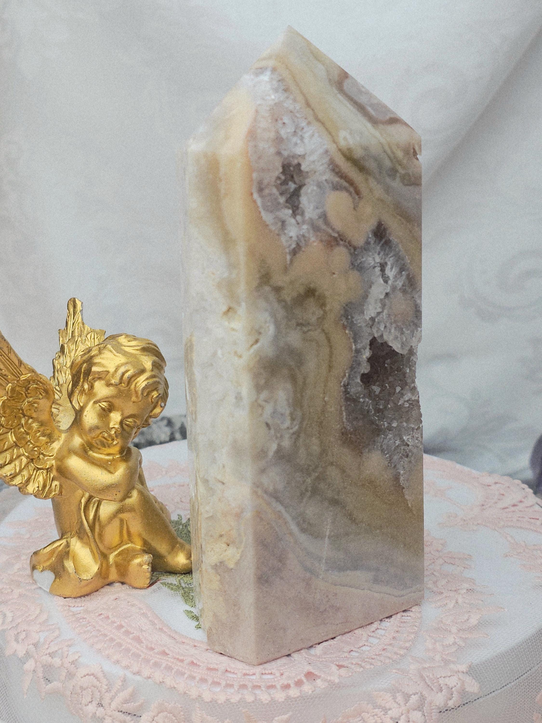 This Pink Amethyst tower has beautiful pastel colors and druzy that sparkles. Very unique patterns of Quartz and flowers This was hand selected for its beauty. Excellent gift for everyone on every occassion.