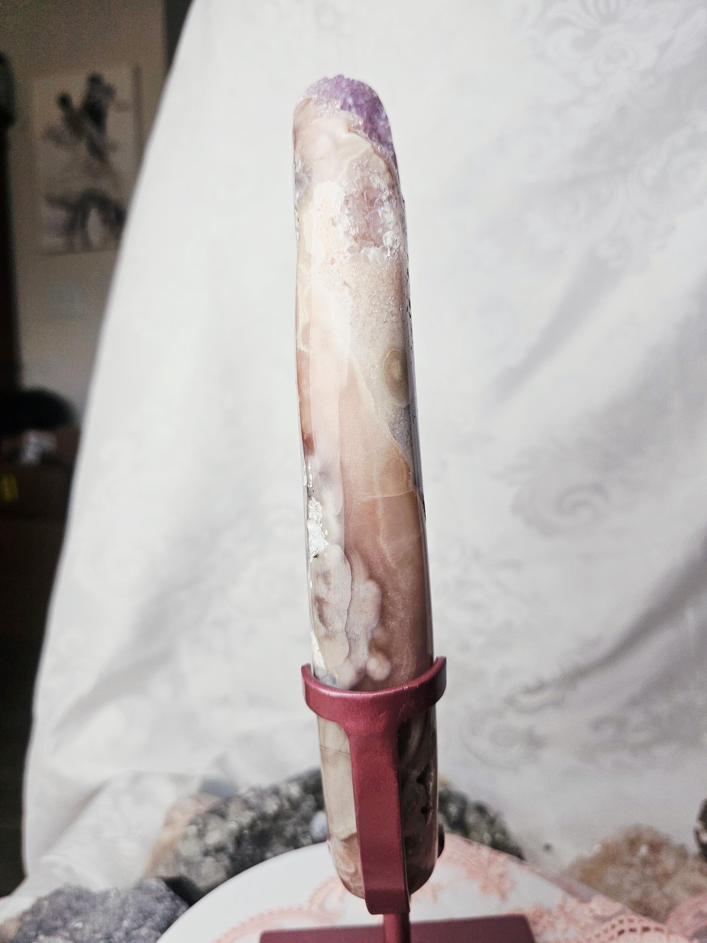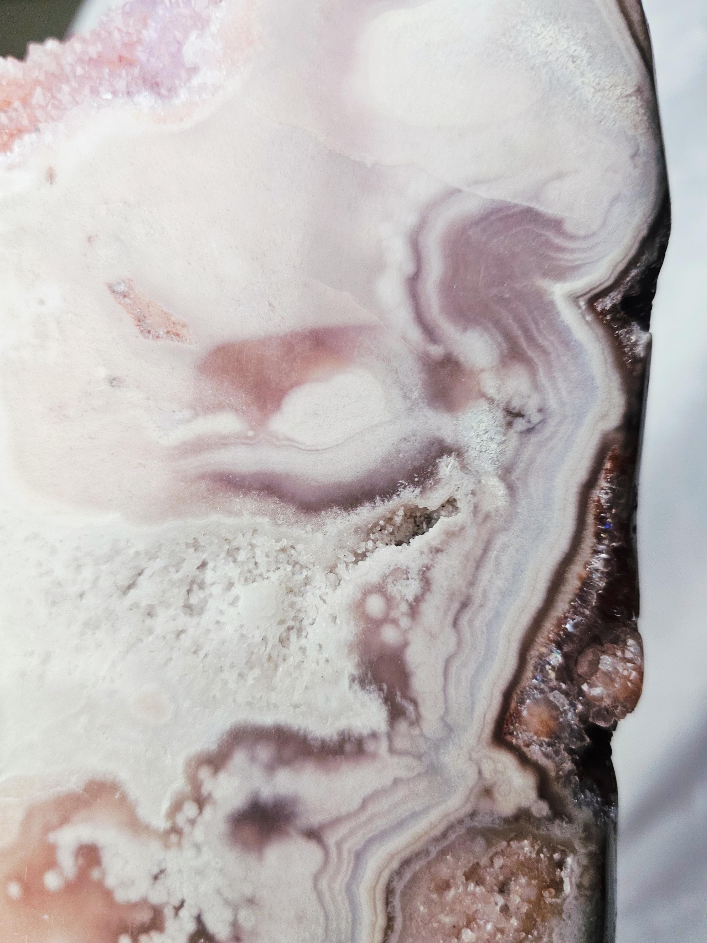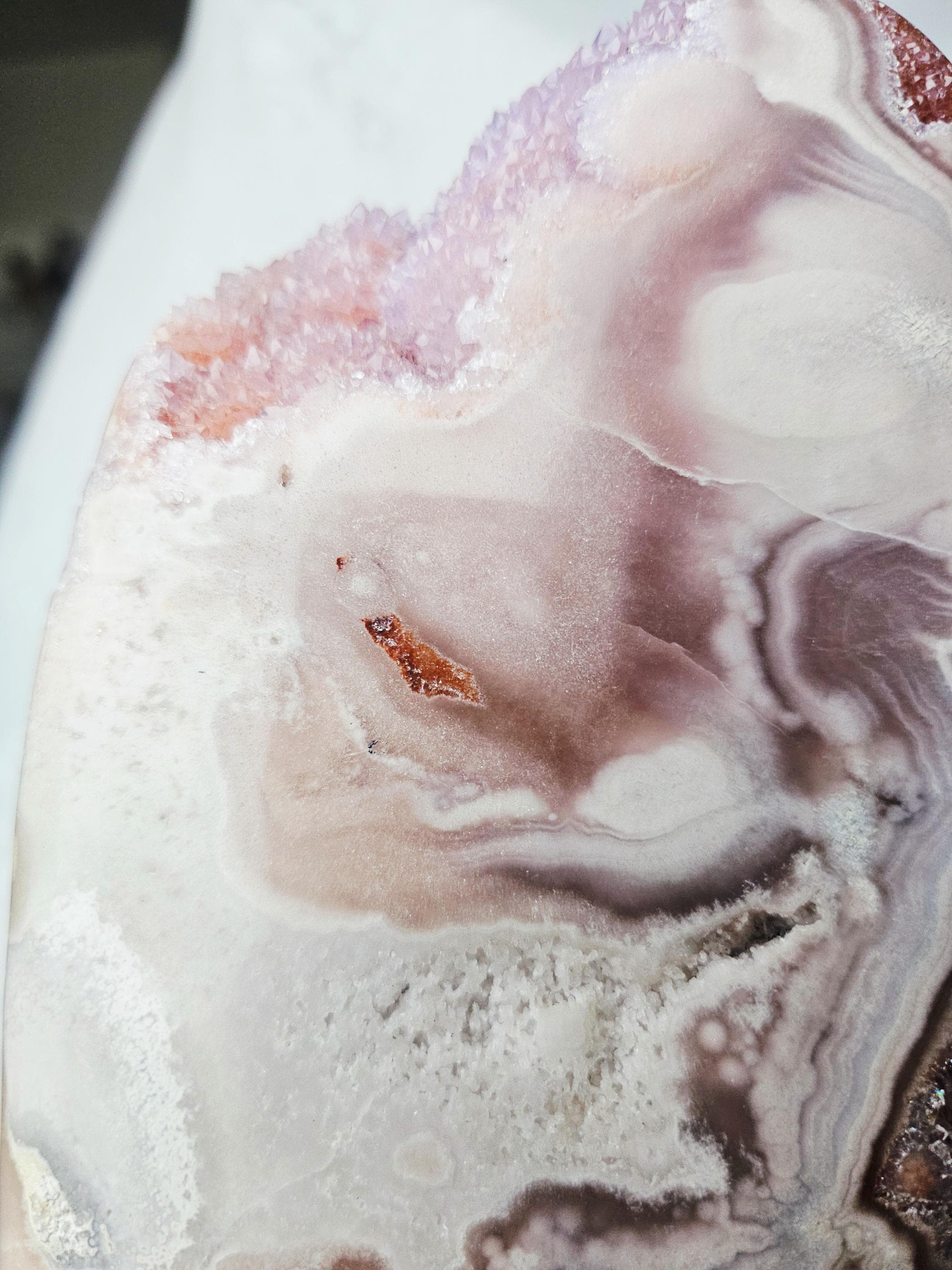 This Pink Amethyst has beautiful pastel colors and druzy that sparkles with. Very unique patterns of Quartz and flowers This was hand selected for its beauty. Excellent gift for everyone on every occassion.