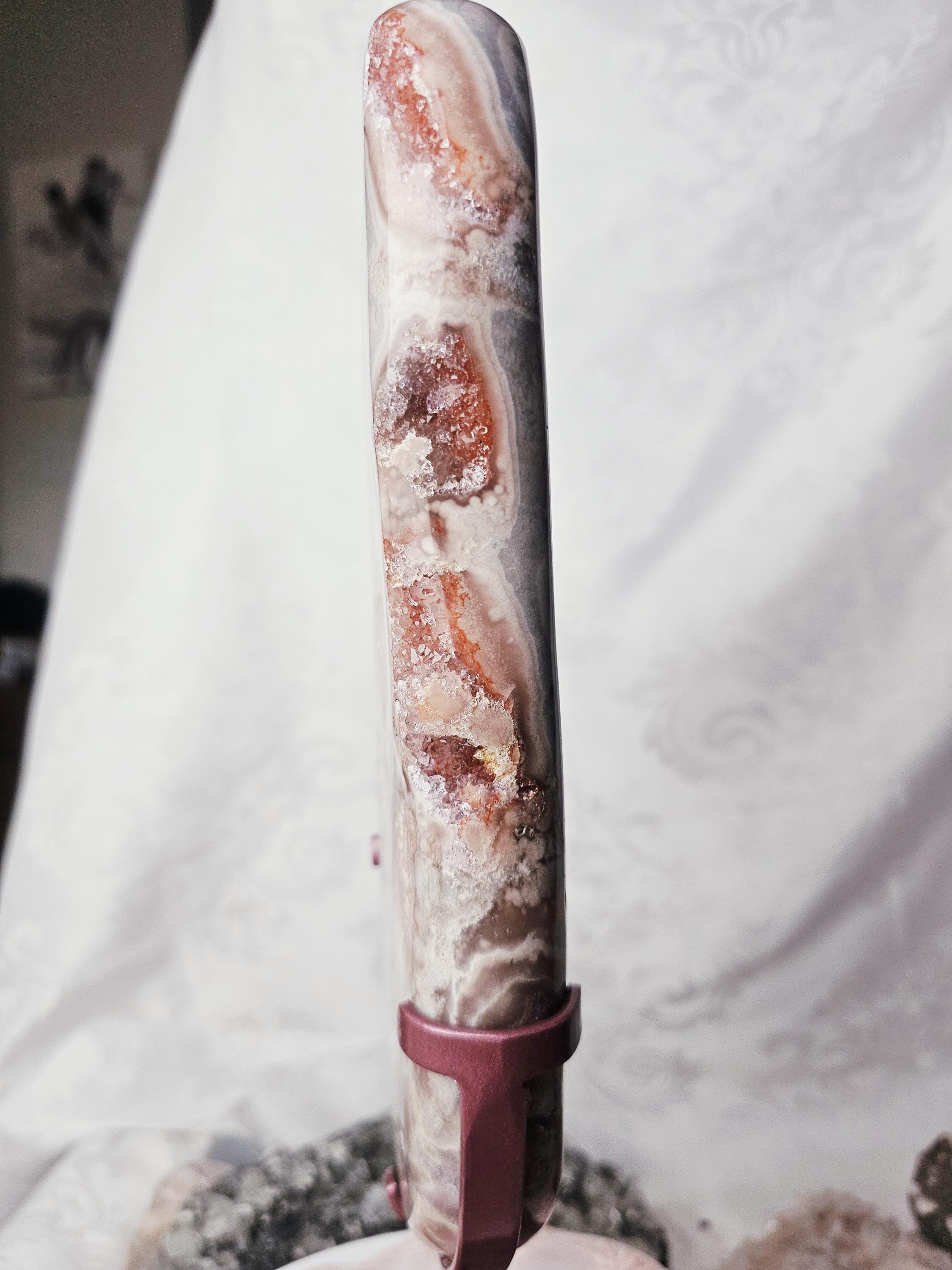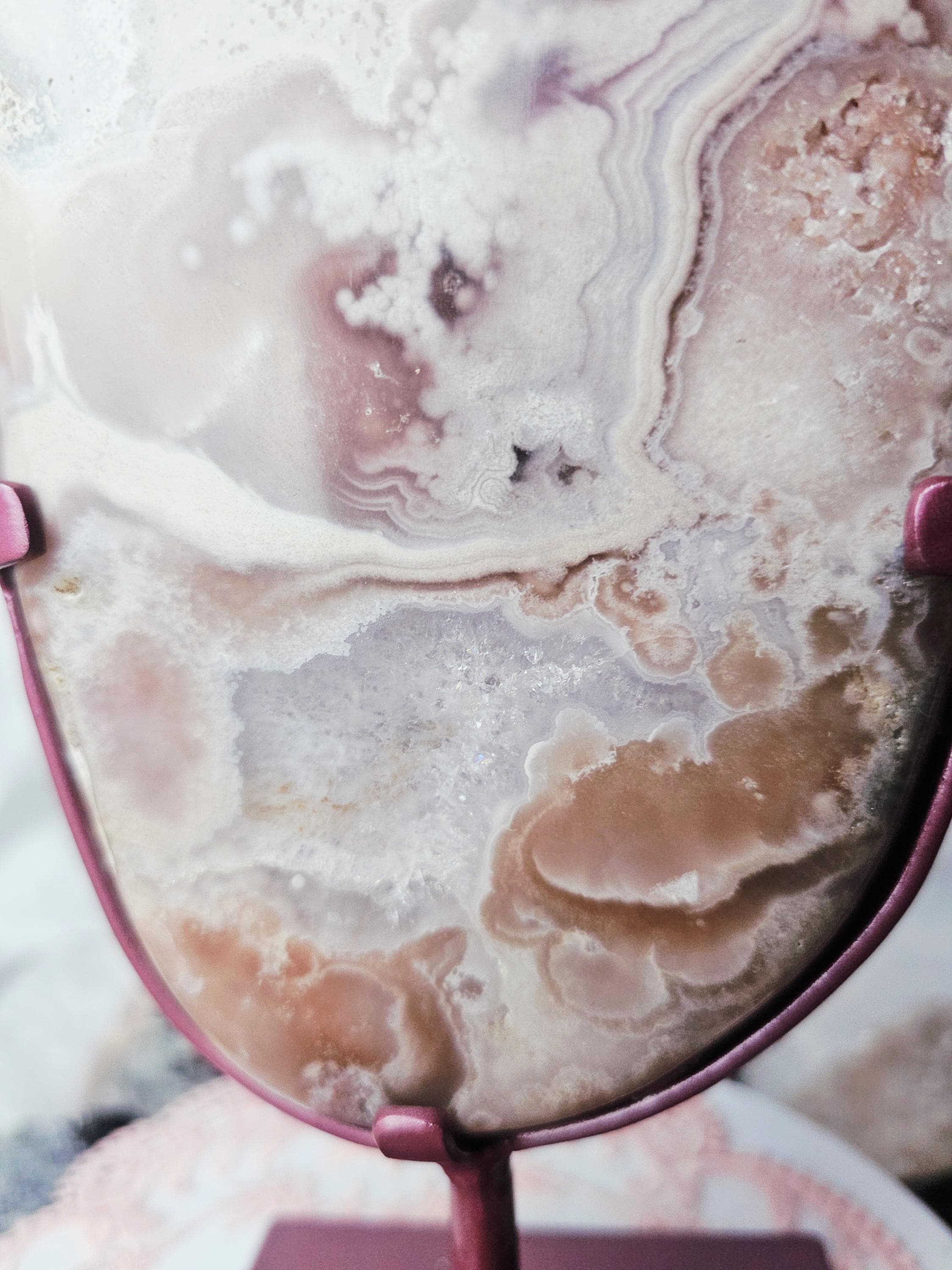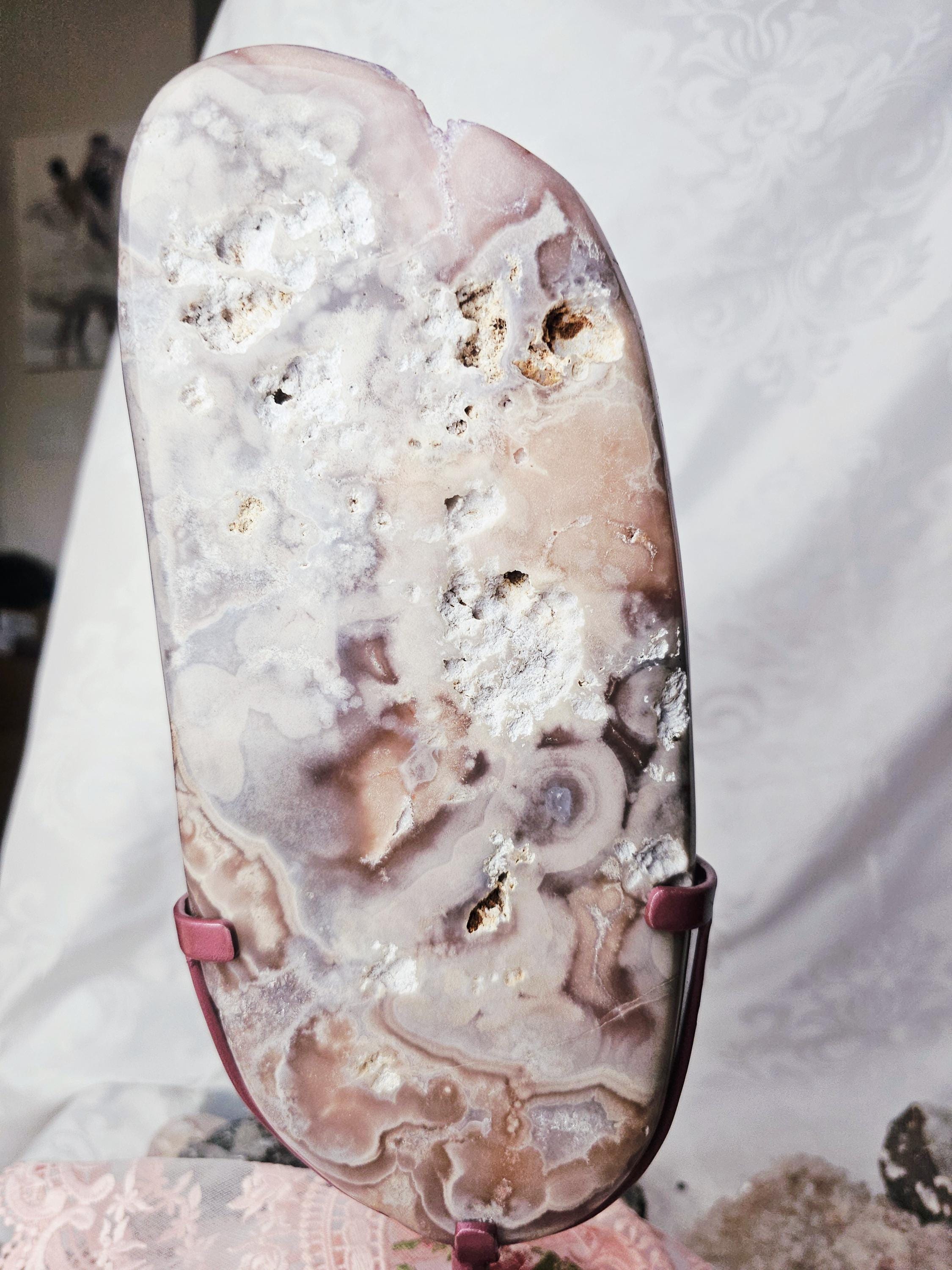 This Pink Amethyst has beautiful pastel colors and druzy that sparkles with. Very unique patterns of Quartz and flowers This was hand selected for its beauty. Excellent gift for everyone on every occassion.