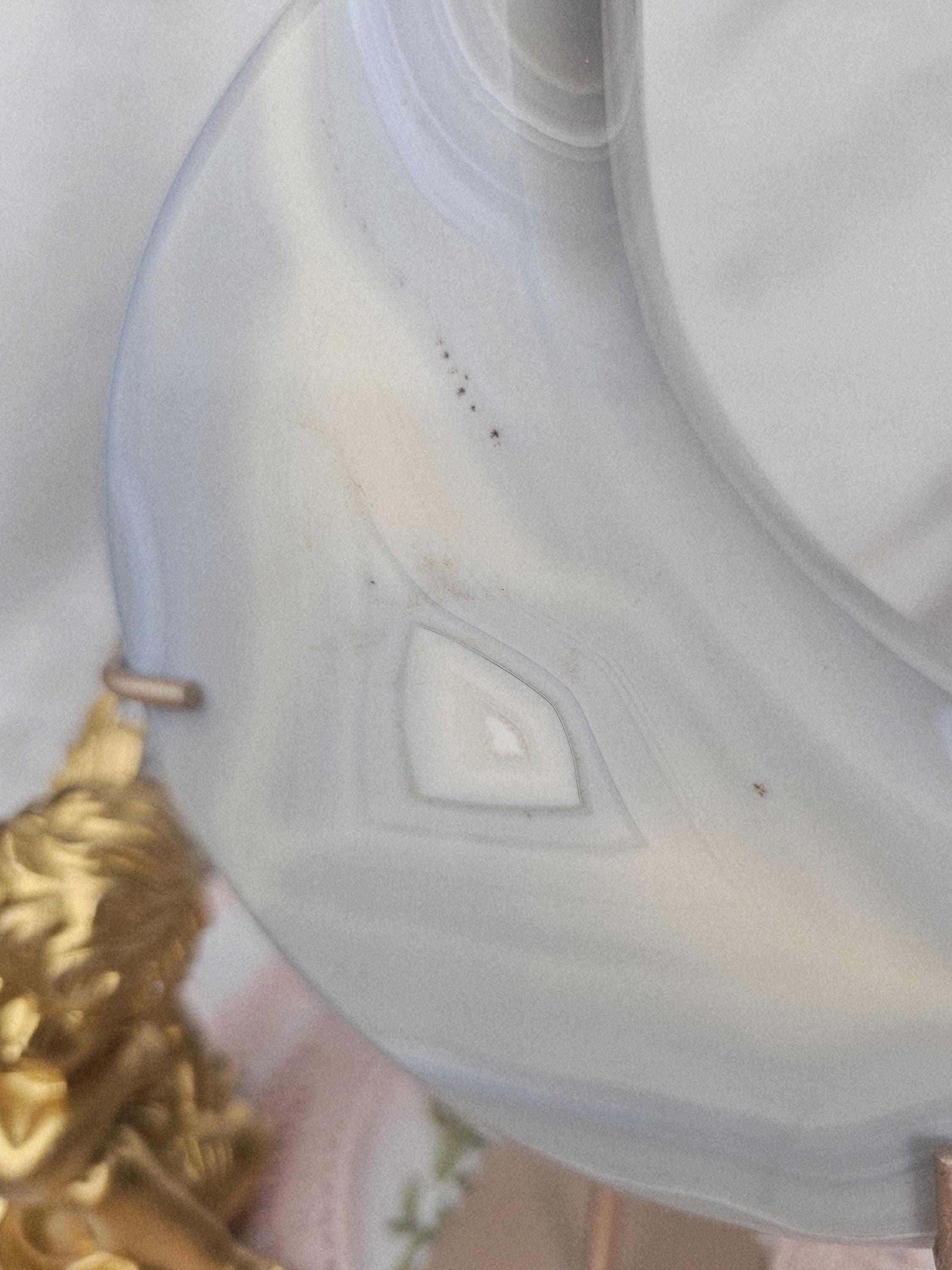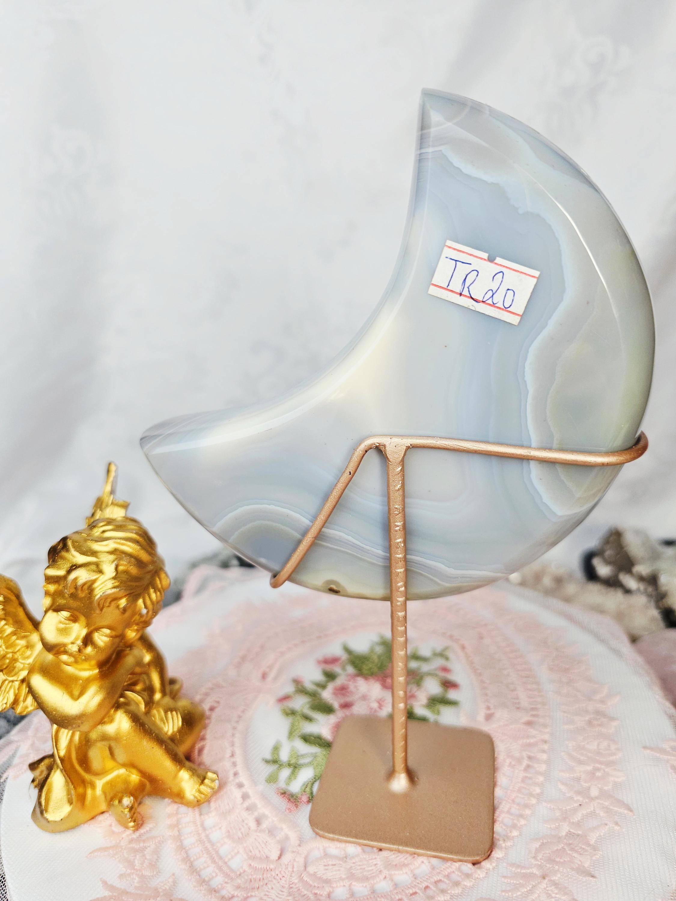 Bandes Agate Moon on a stand with unique stripes and markings. One of a kind crystal. Absolutely amazing in so many ways. This is a crystals that is so unique they are definitely conversation pieces of crystal art. This is a wonderful part of Mother Nature's beauty that you can known. This moon has a natural eye in the center. It's a gorgeous blue and yellow moon with a small amount of dendritic. The eye is a symbol of good luck and within a moon, the eye has a feminine energy.