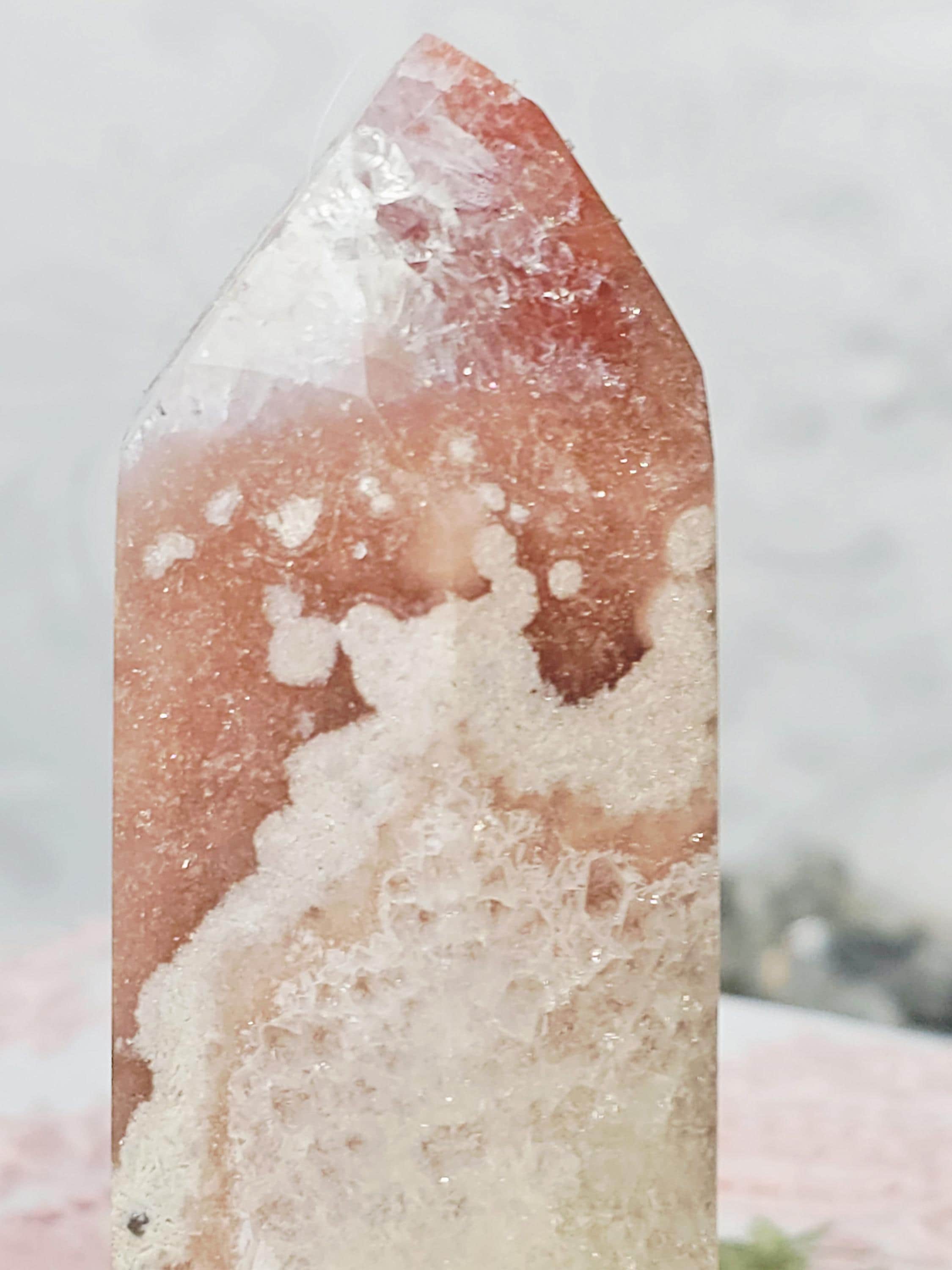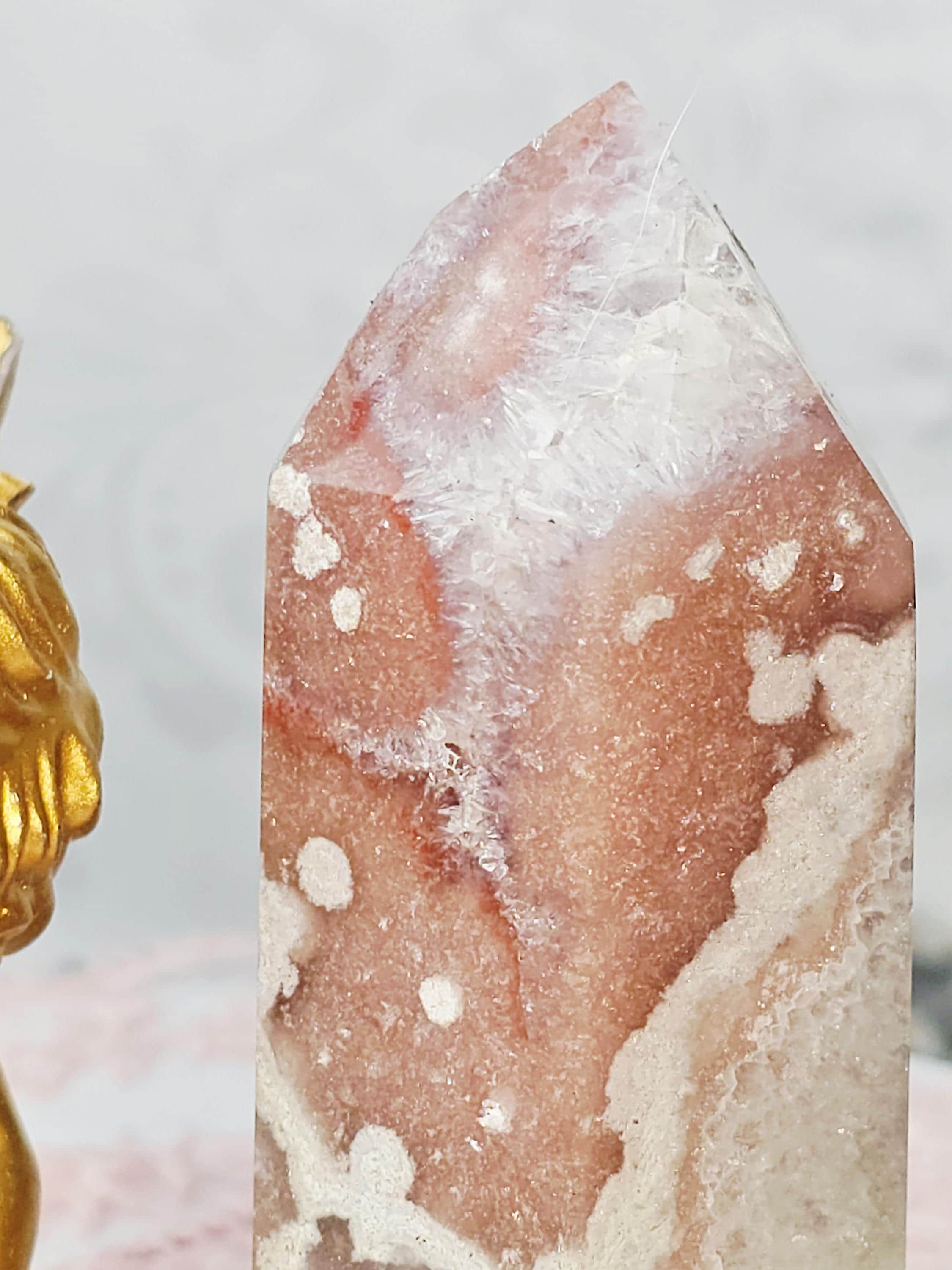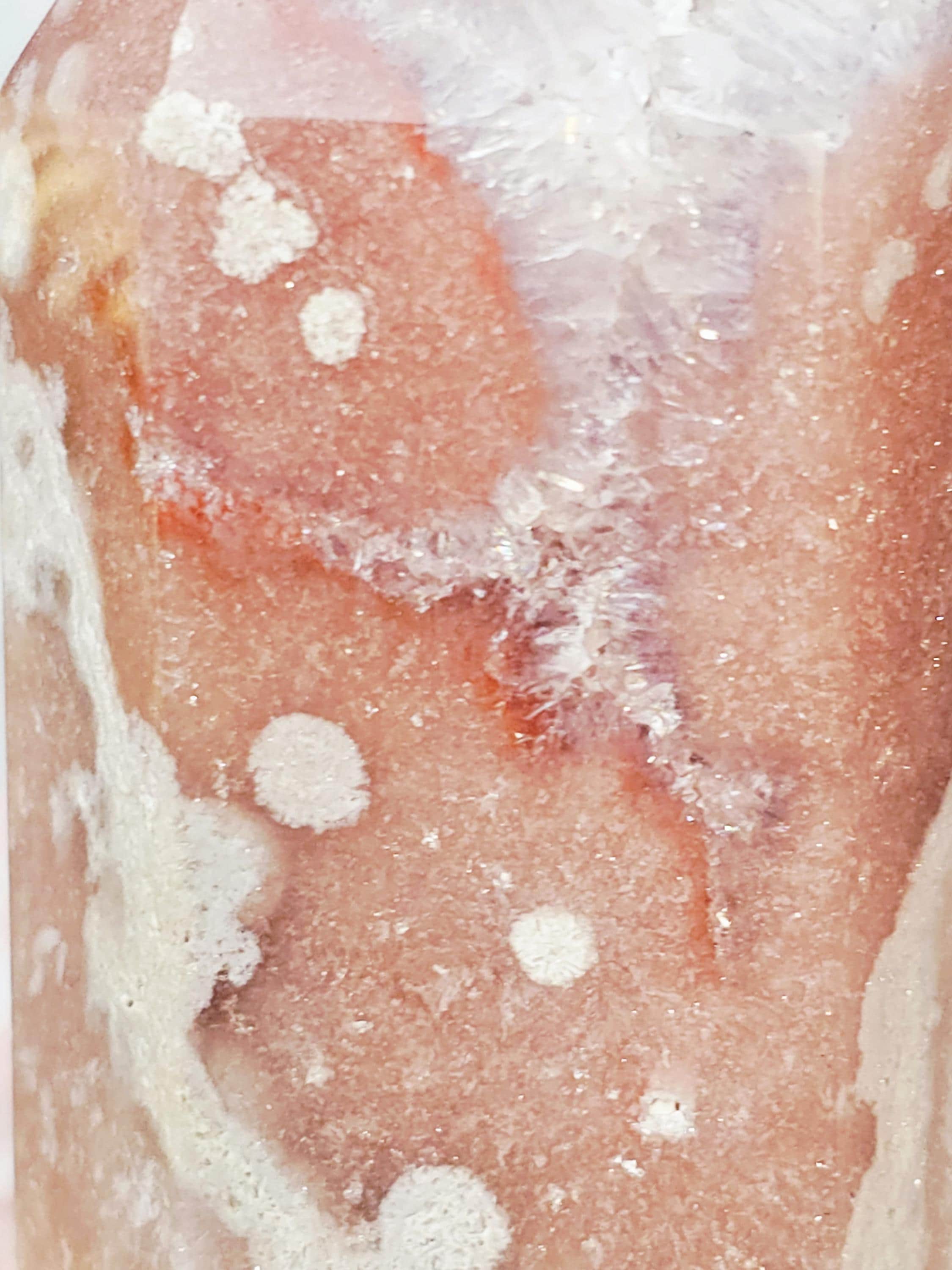 This Pink Amethyst tower has beautiful pastel colors and druzy that sparkles. Very unique patterns of Quartz and flowers This was hand selected for its beauty. Excellent gift for everyone on every occassion.