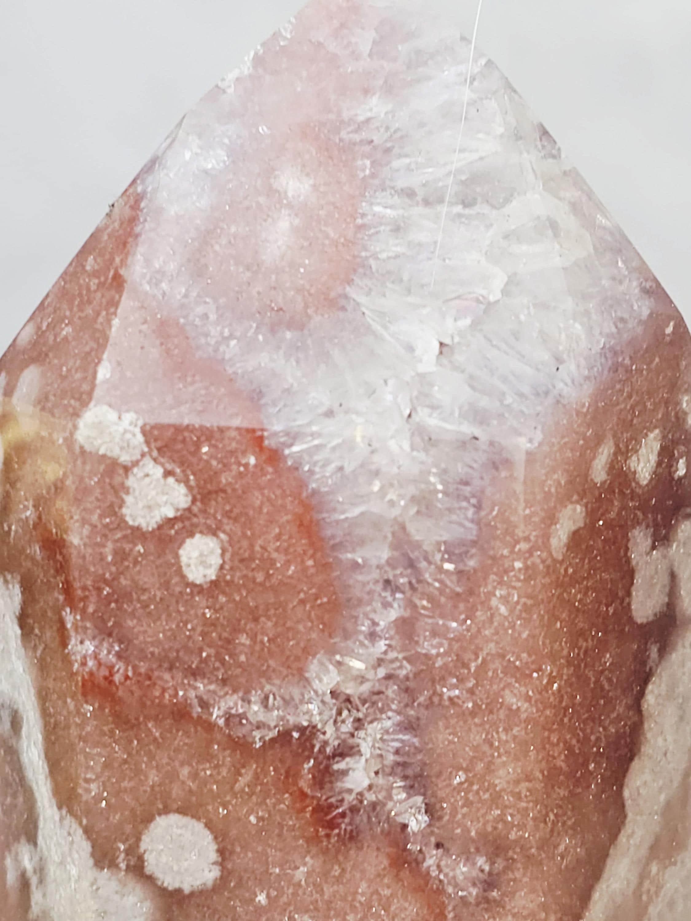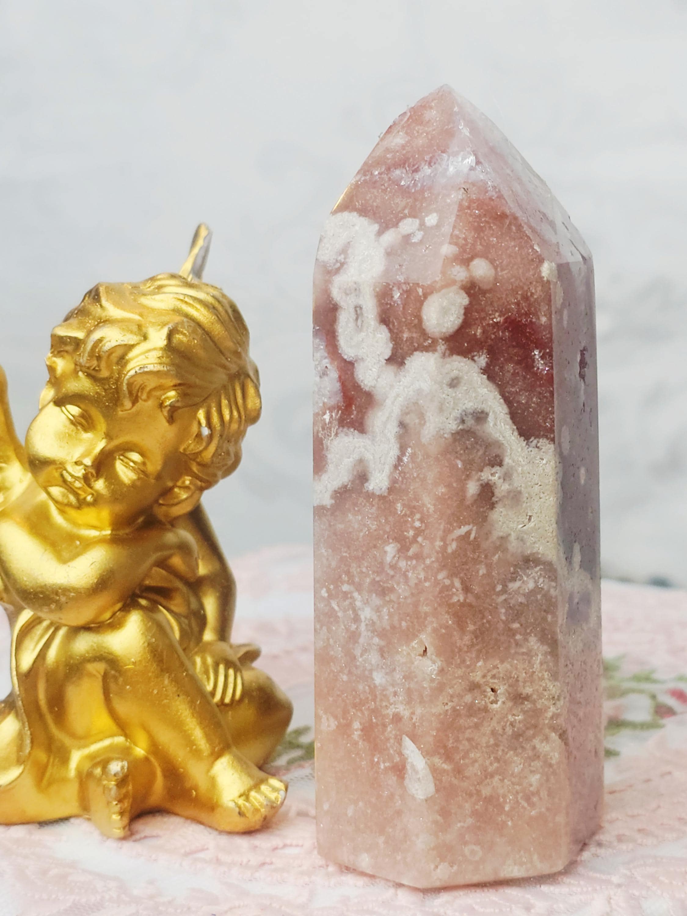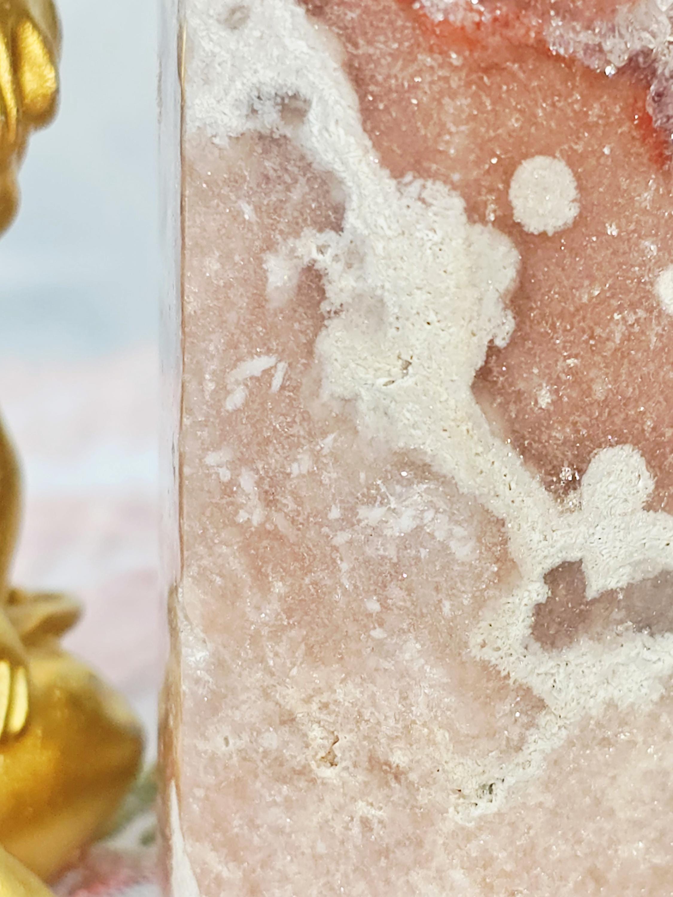 This Pink Amethyst tower has beautiful pastel colors and druzy that sparkles. Very unique patterns of Quartz and flowers This was hand selected for its beauty. Excellent gift for everyone on every occassion.