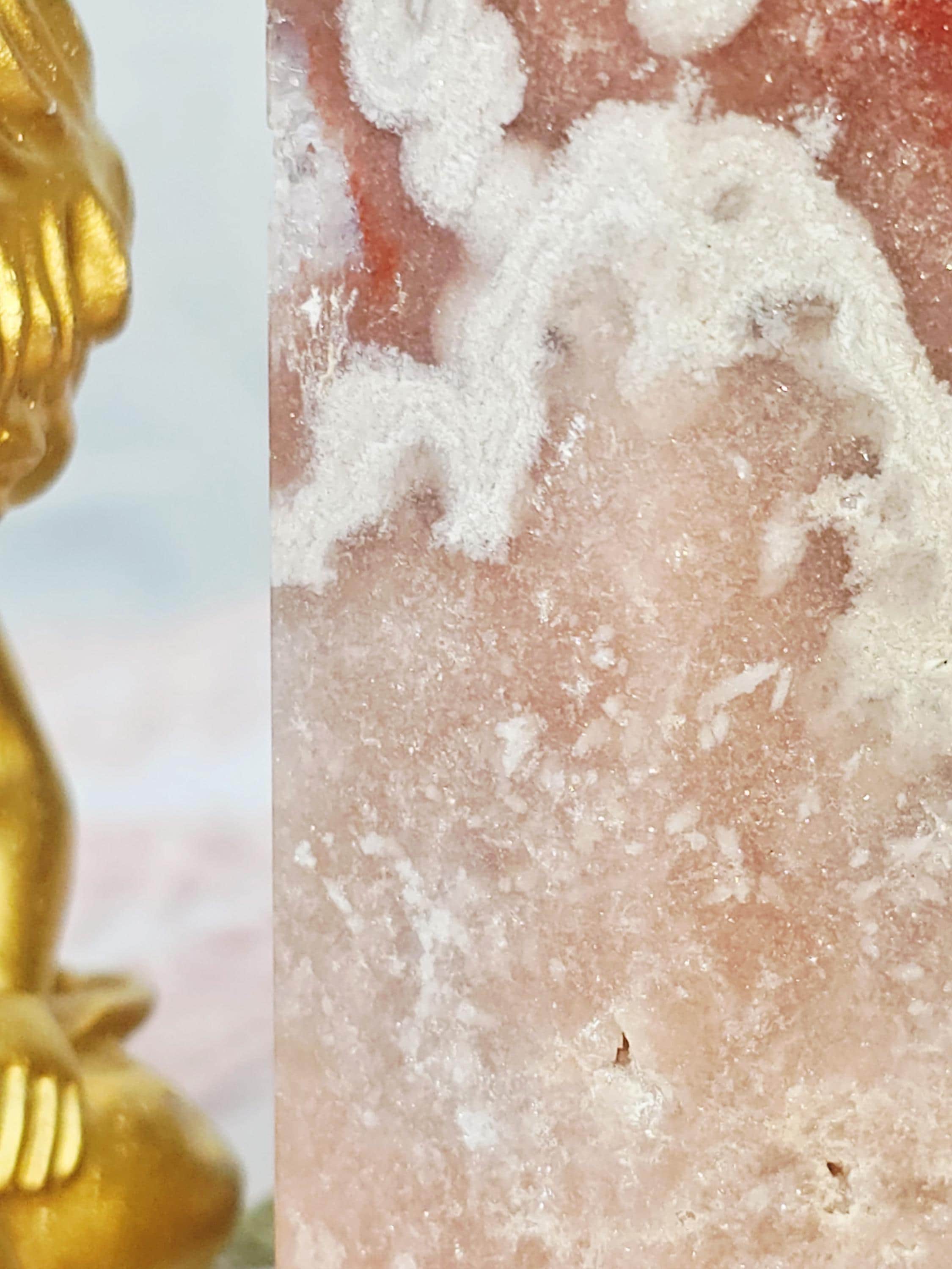 The crystal is a perfect pink statement piece crystal. I love unique patterns on it. Gorgeous natural colors. Great rare natural pink, red, peach and other shades of Pink Amethyst.