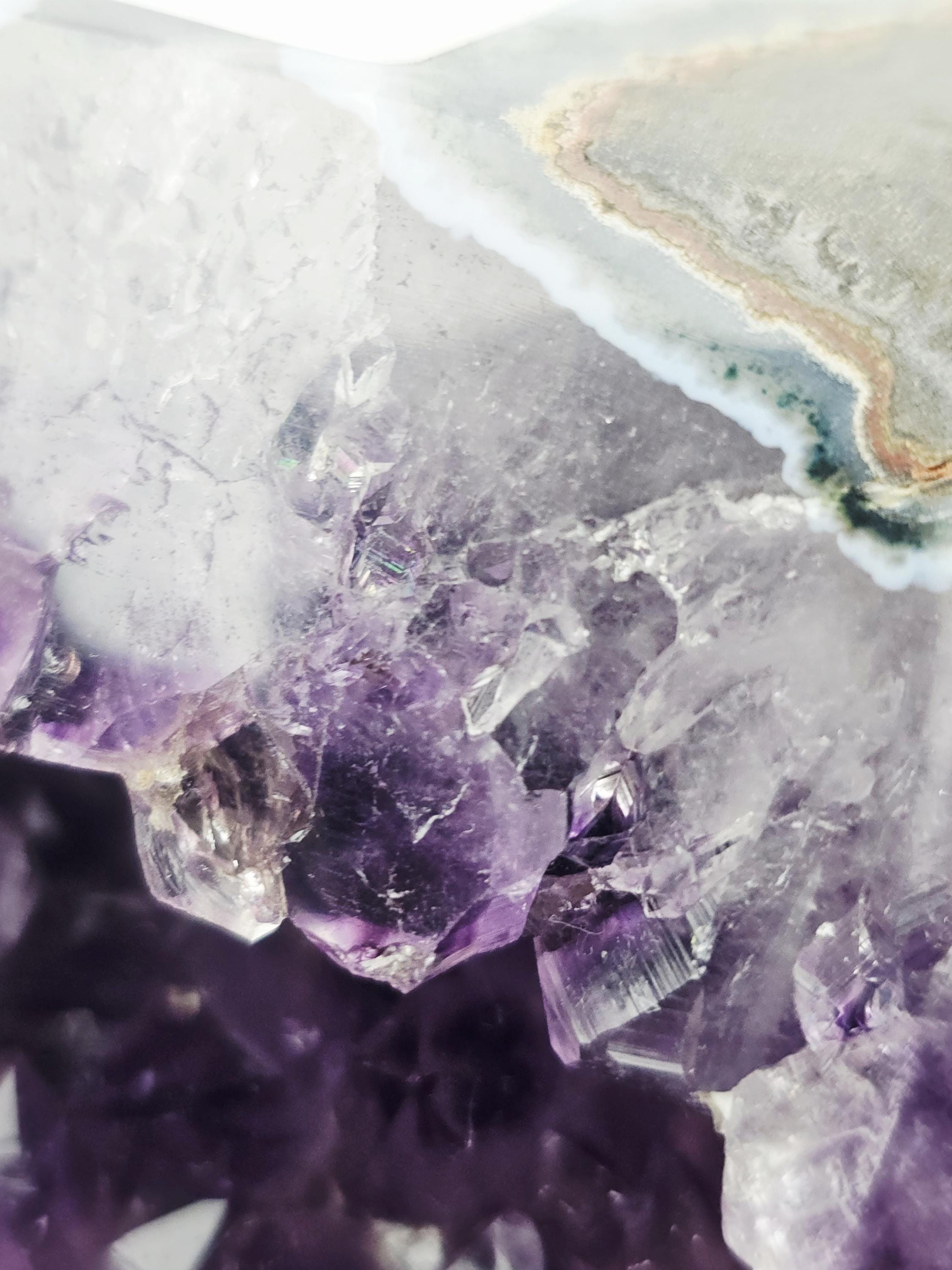 Statement piece Amethyst Geode is full of rainbows. It has great dark colors. Amethyst has a calming healing reputation that it deserves. This Geode is a great home decor piece.