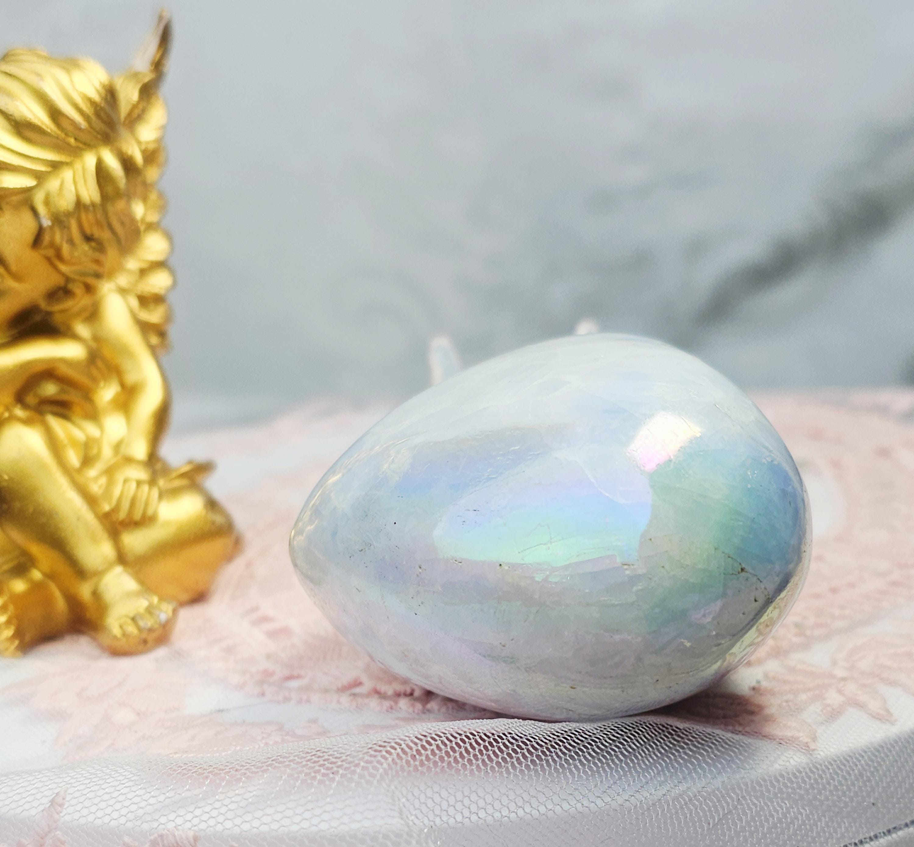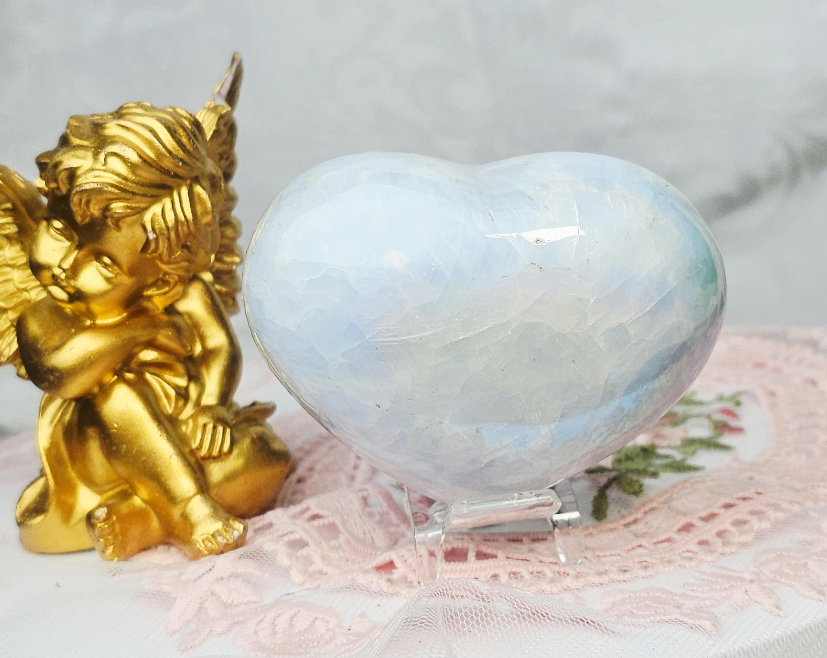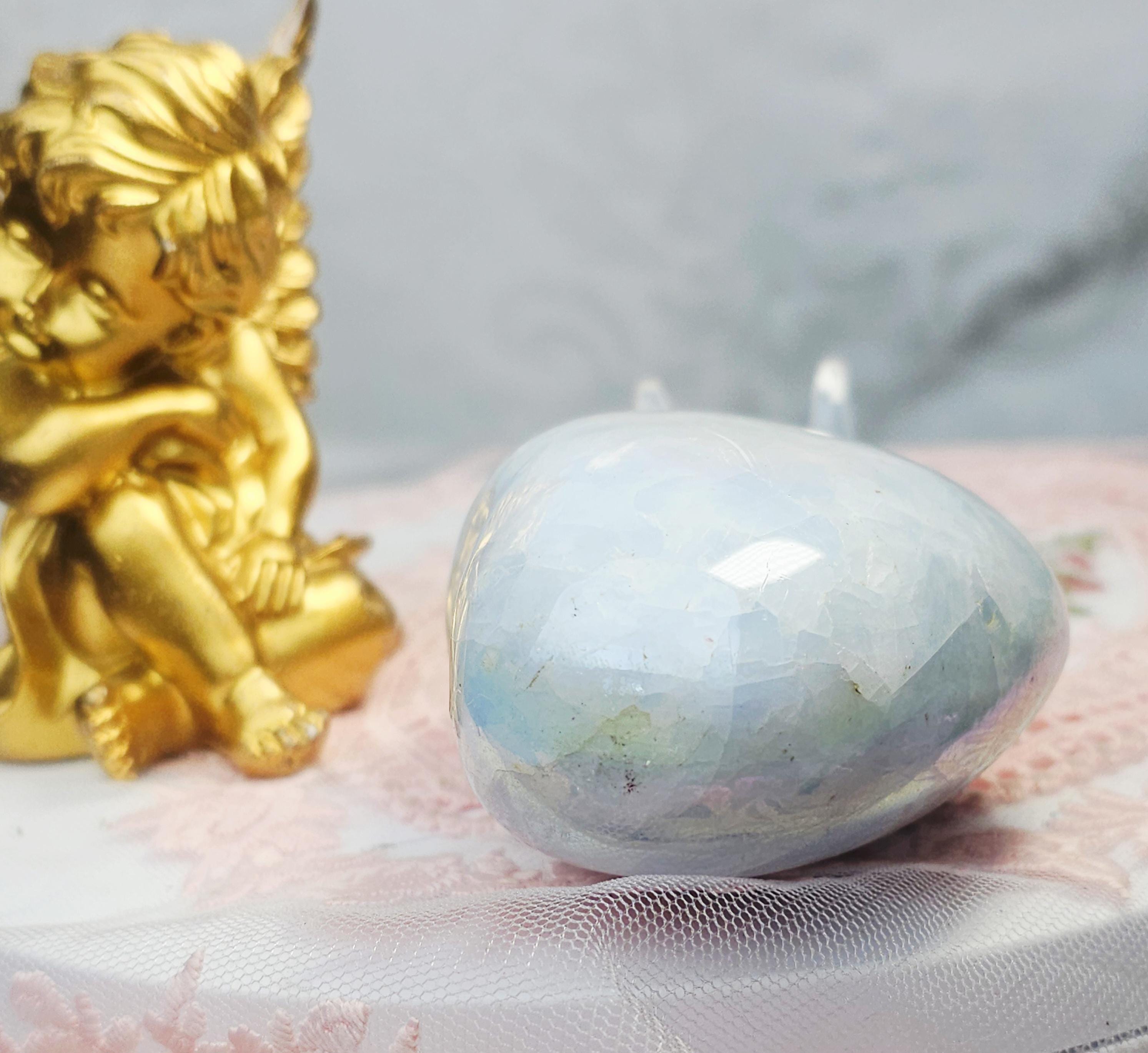 Angel Aura Blue Calcite with beautiful rainbow stripes. Angel Aura vibrates at a high frequency. This heart is perfect for a nightstand to bring a warm smile upon your face before bedtime. The soft look of the heart is a great shabby chic item. I love functional home decor as it looks beautiful as it emits loving energy.