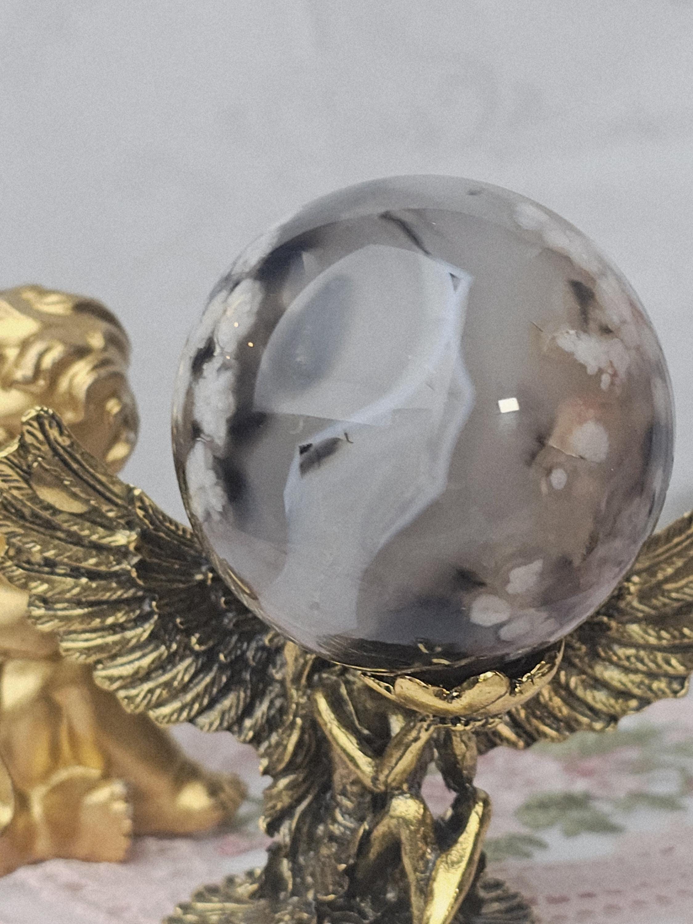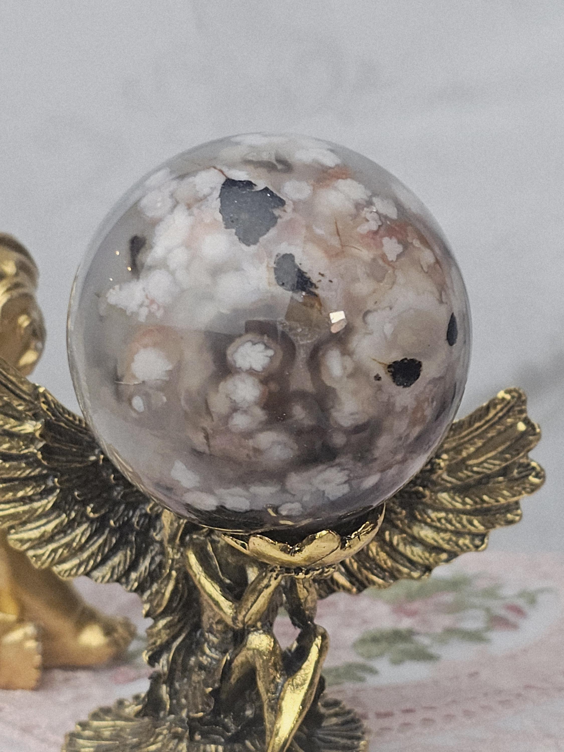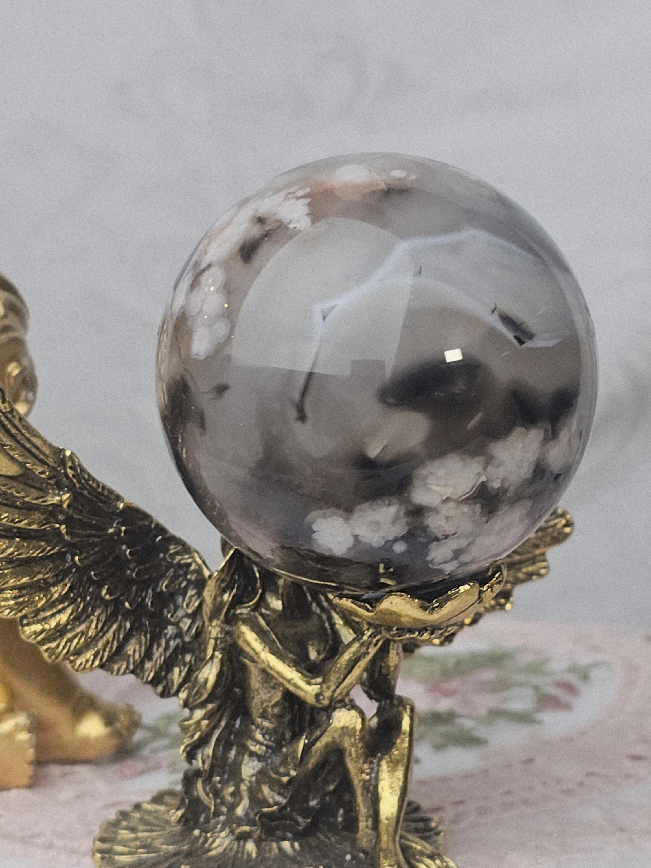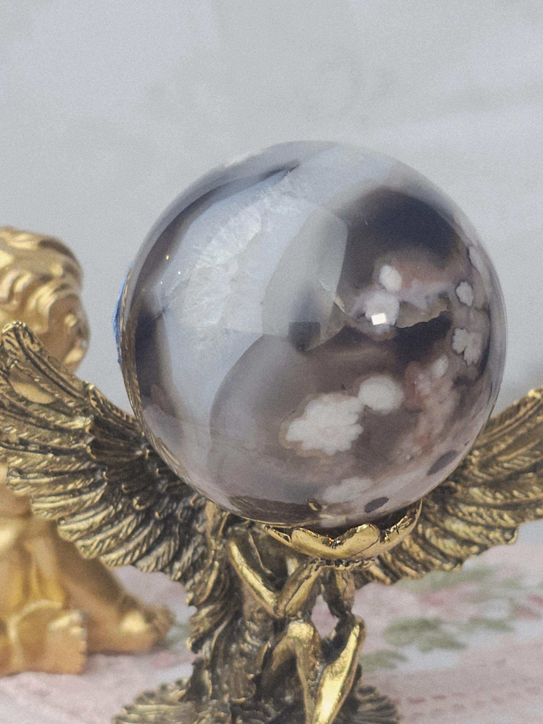 Unique natural markings on this sphere. There is a friendly little spirit on the sphere. One of a kind gorgeous Black and Mocha color with beautiful stripes and flowers. Black Flower Agate is a very romantic, balancing crystal.