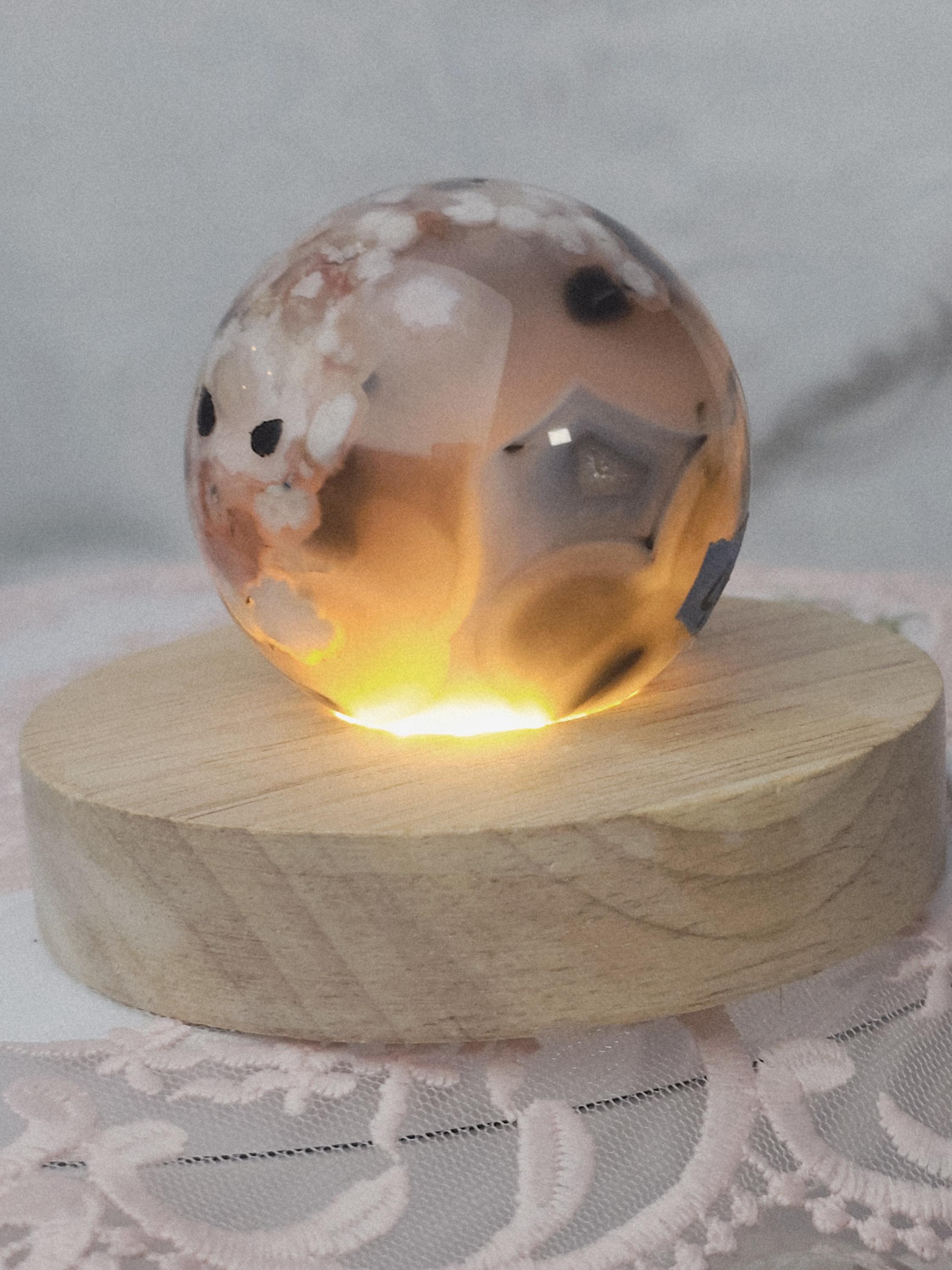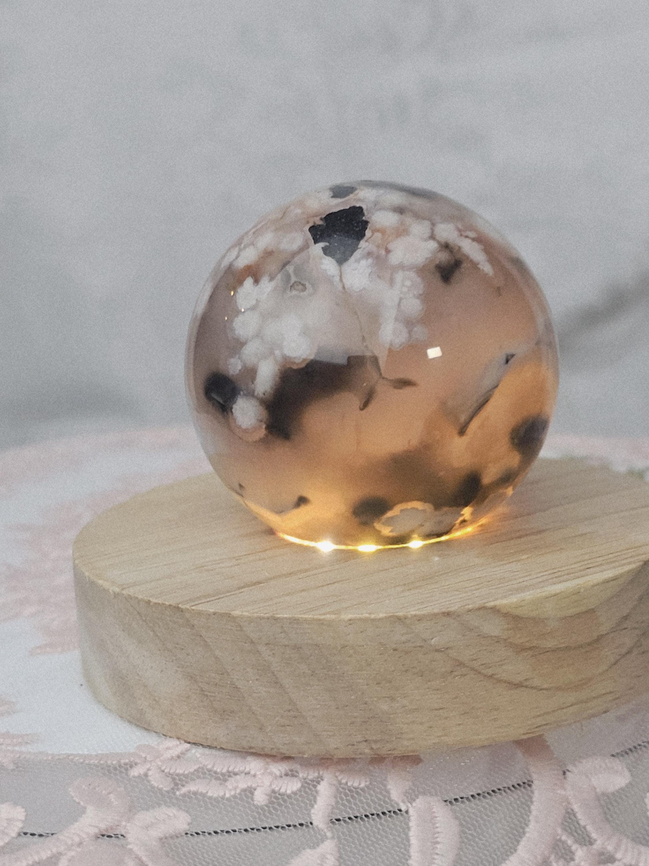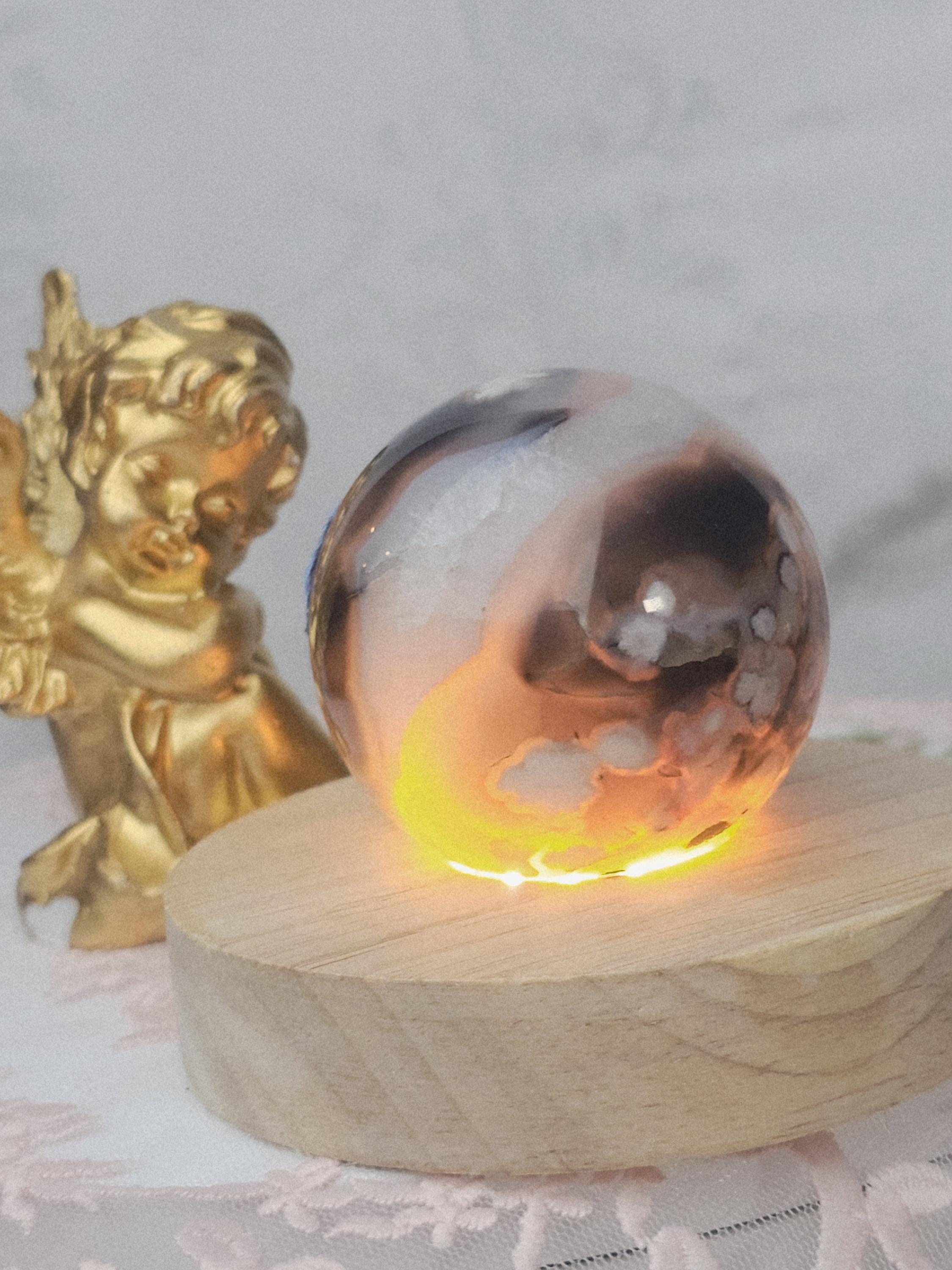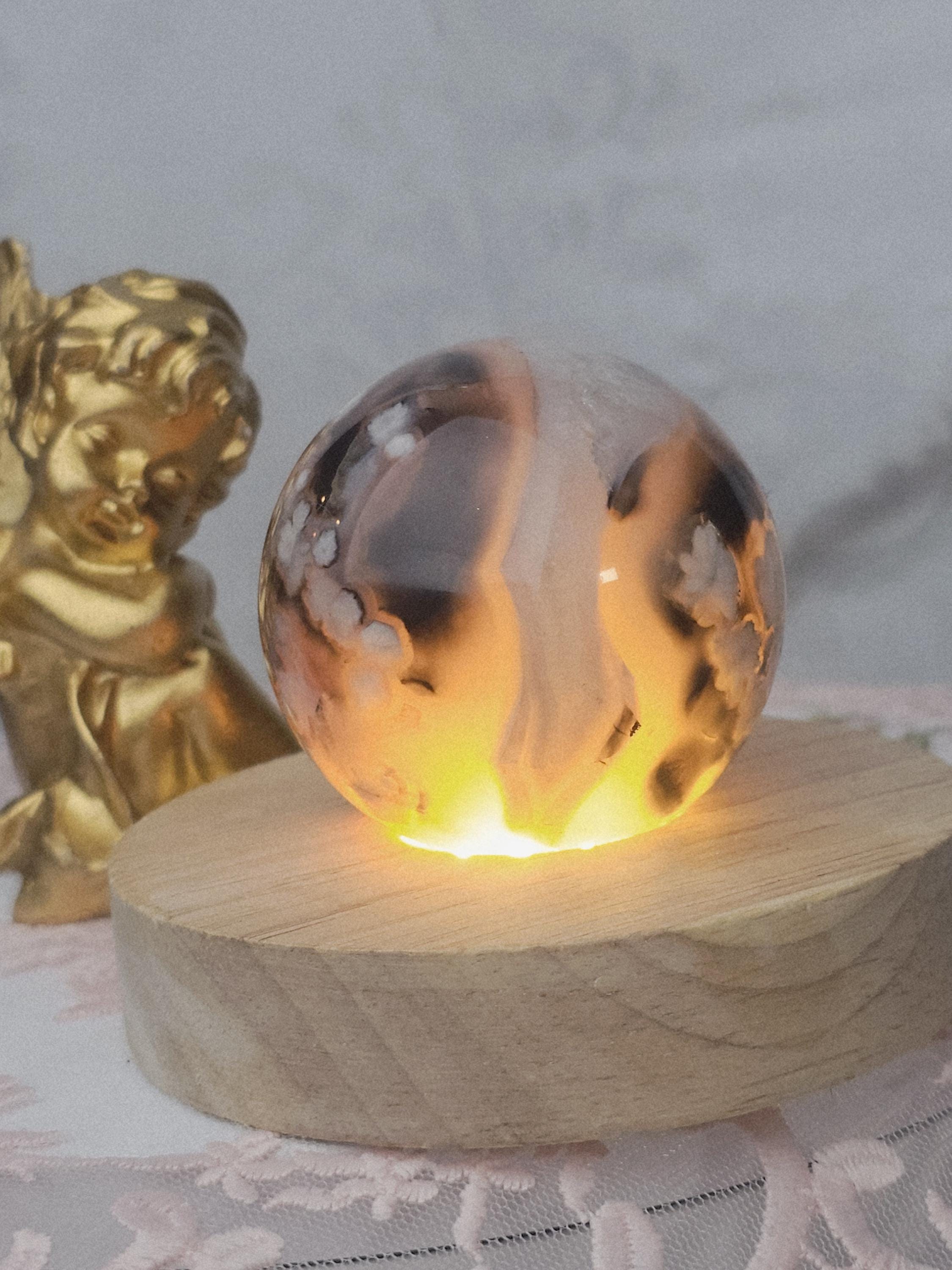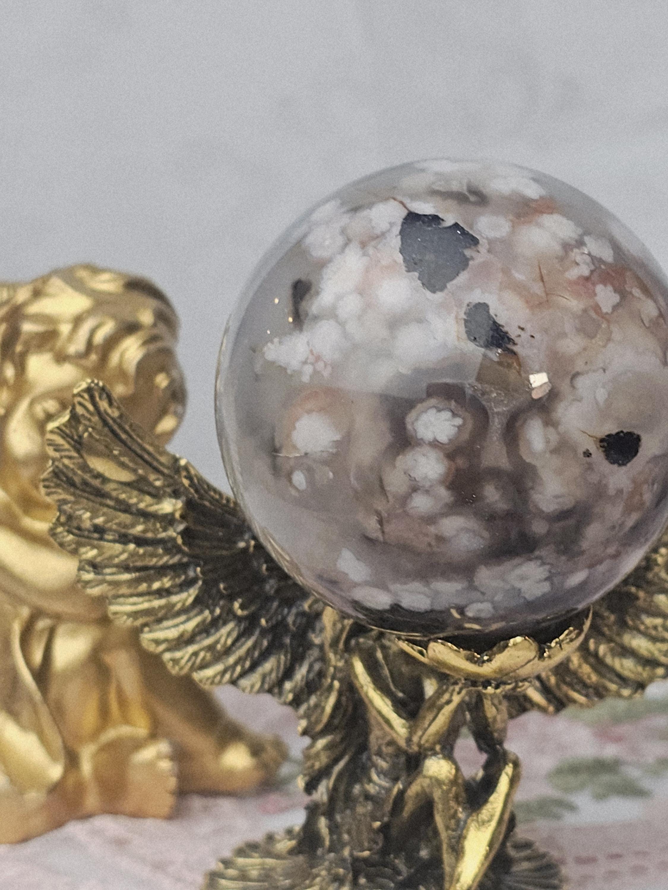 Unique natural markings on this sphere. There is a friendly little spirit on the sphere. One of a kind gorgeous Black and Mocha color with beautiful stripes and flowers. Black Flower Agate is a very romantic, balancing crystal.