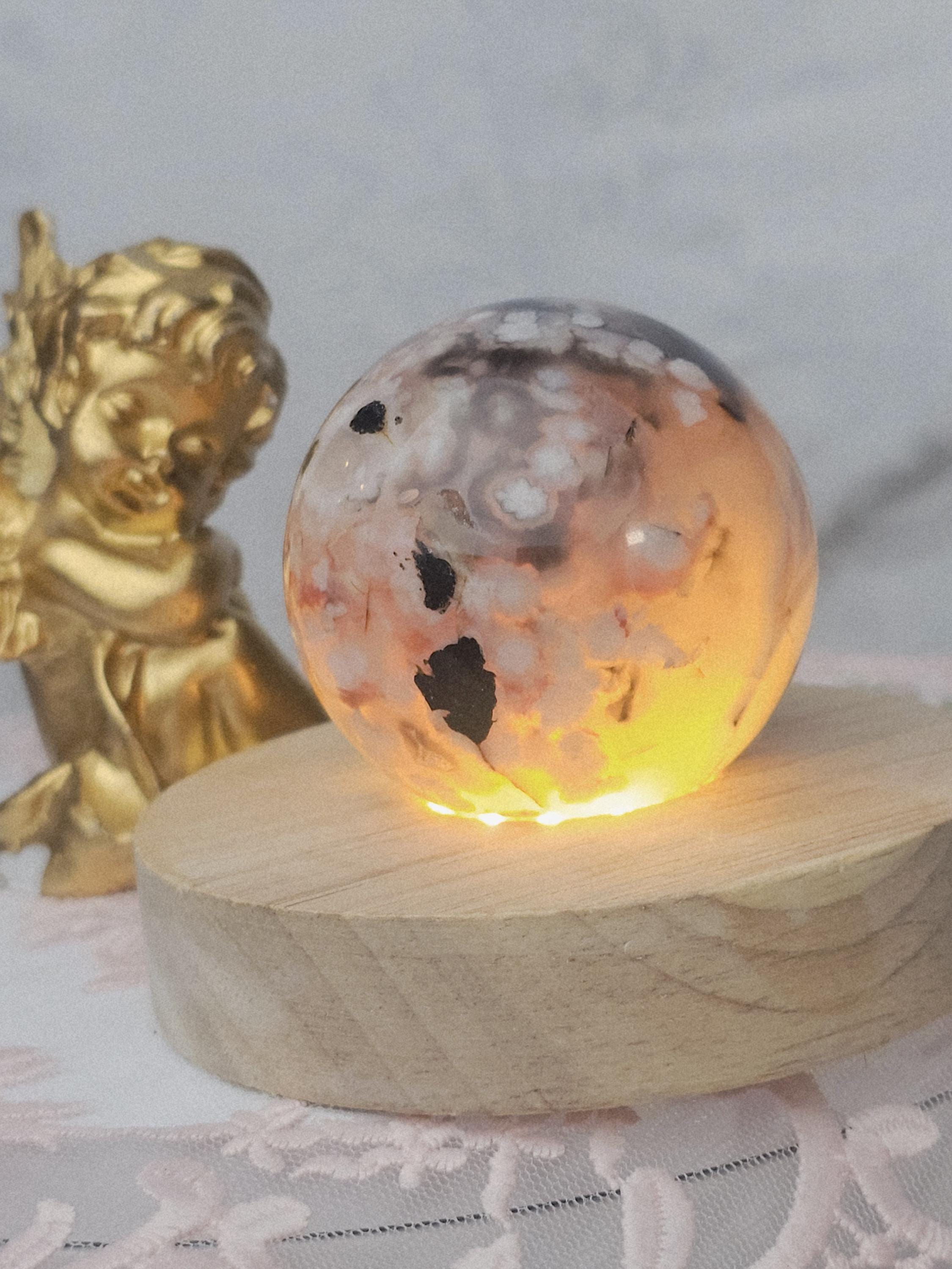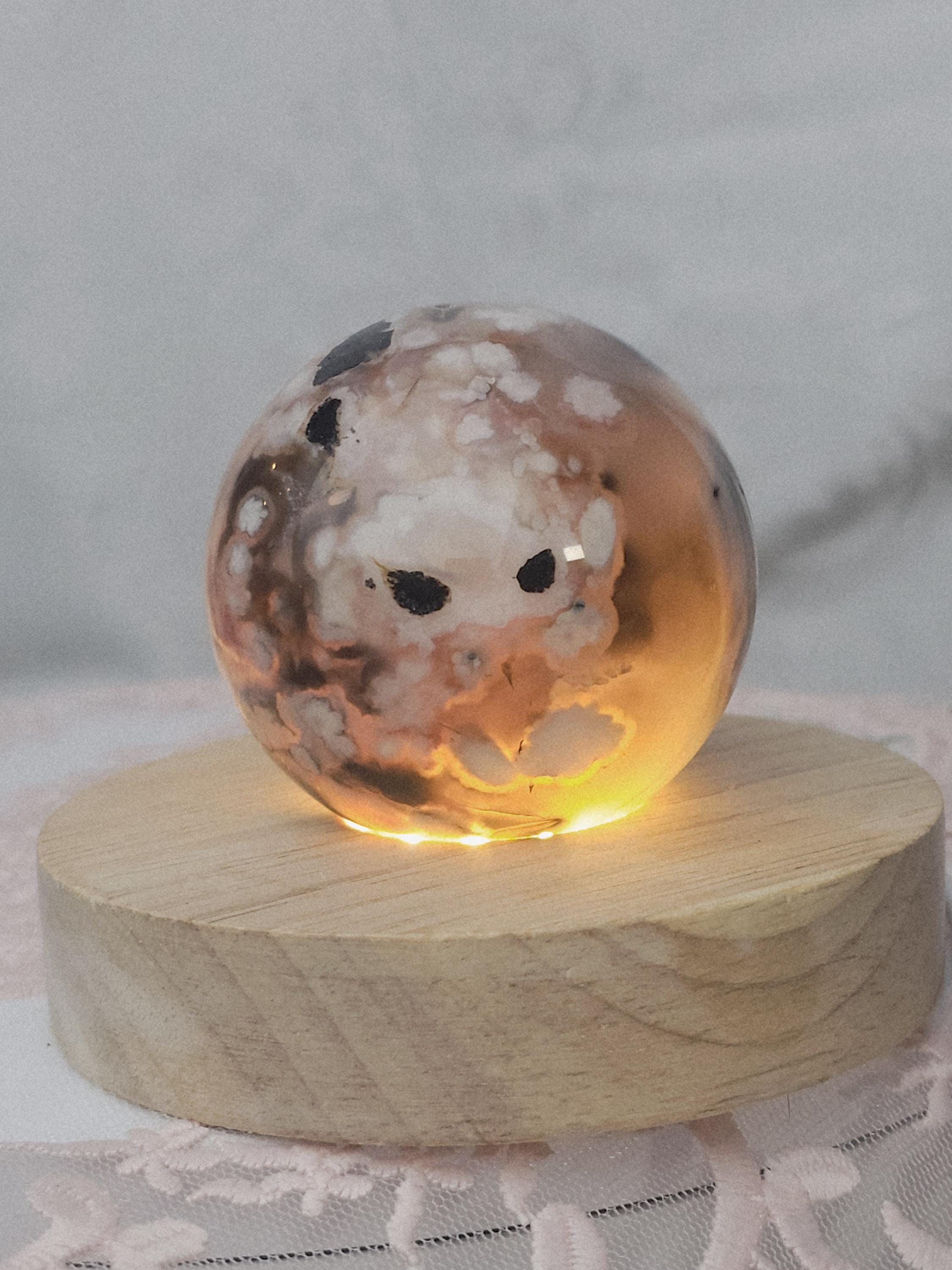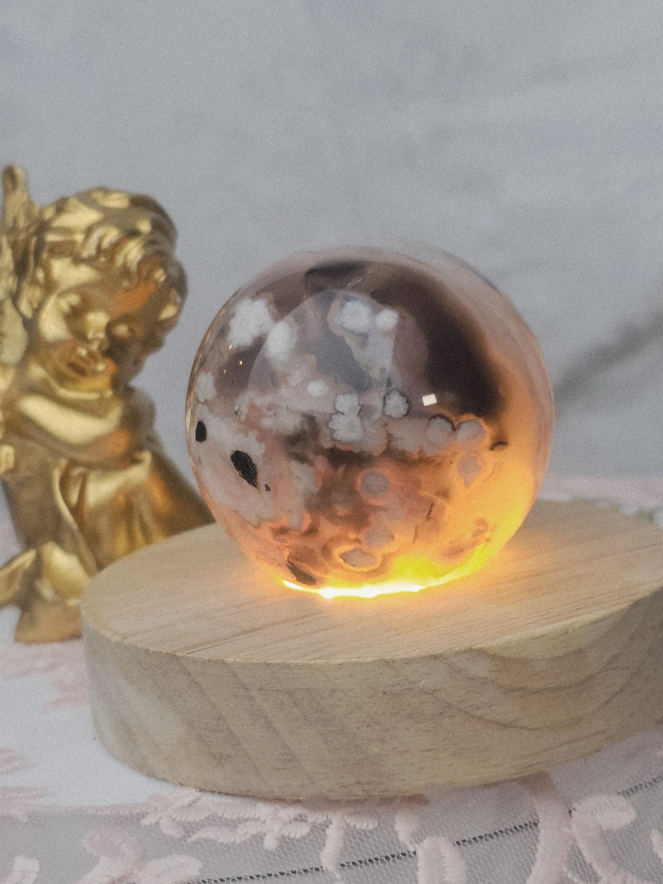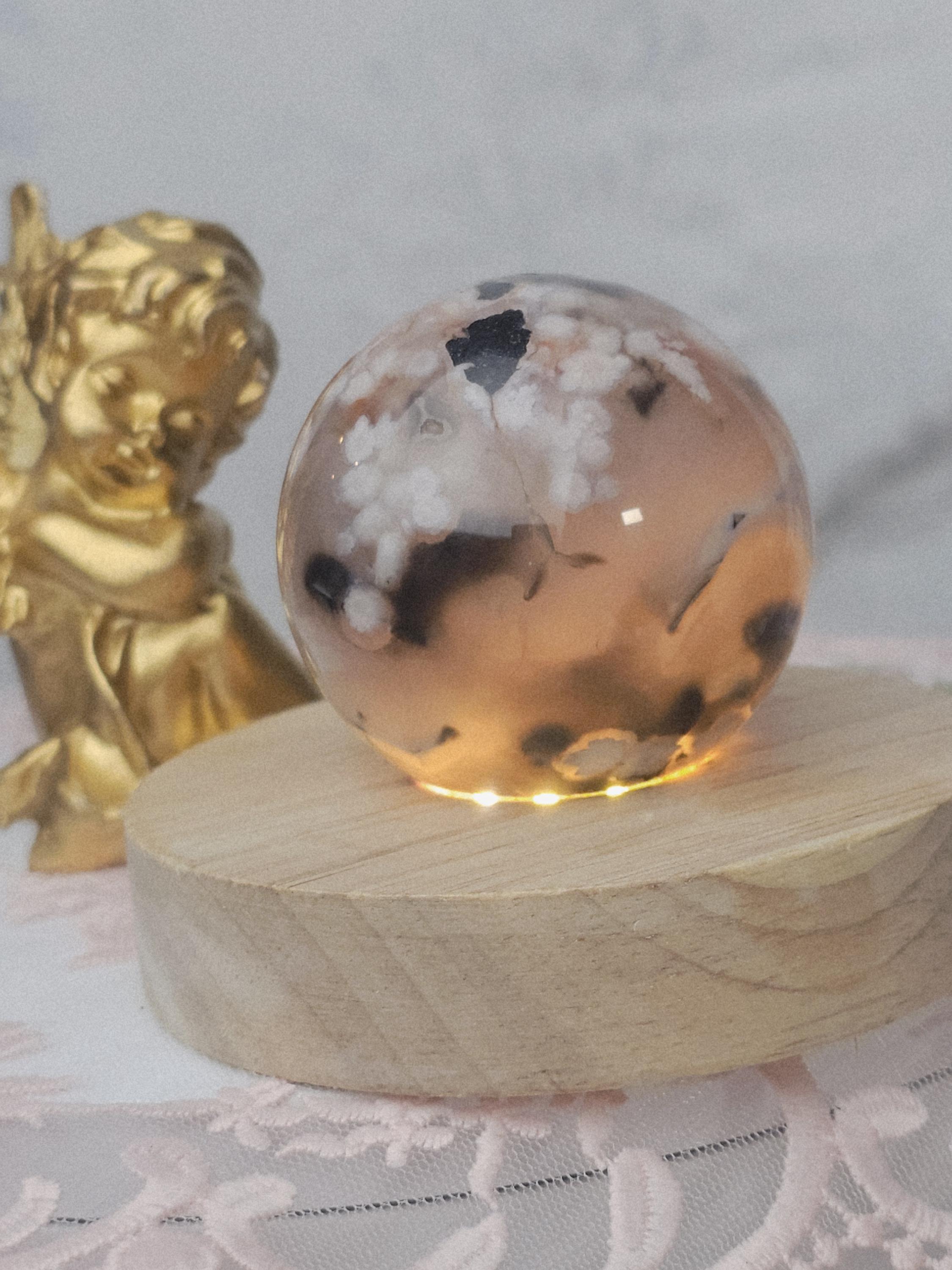 Unique natural markings on this sphere. There is a friendly little spirit on the sphere. One of a kind gorgeous Black and Mocha color with beautiful stripes and flowers. Black Flower Agate is a very romantic, balancing crystal.