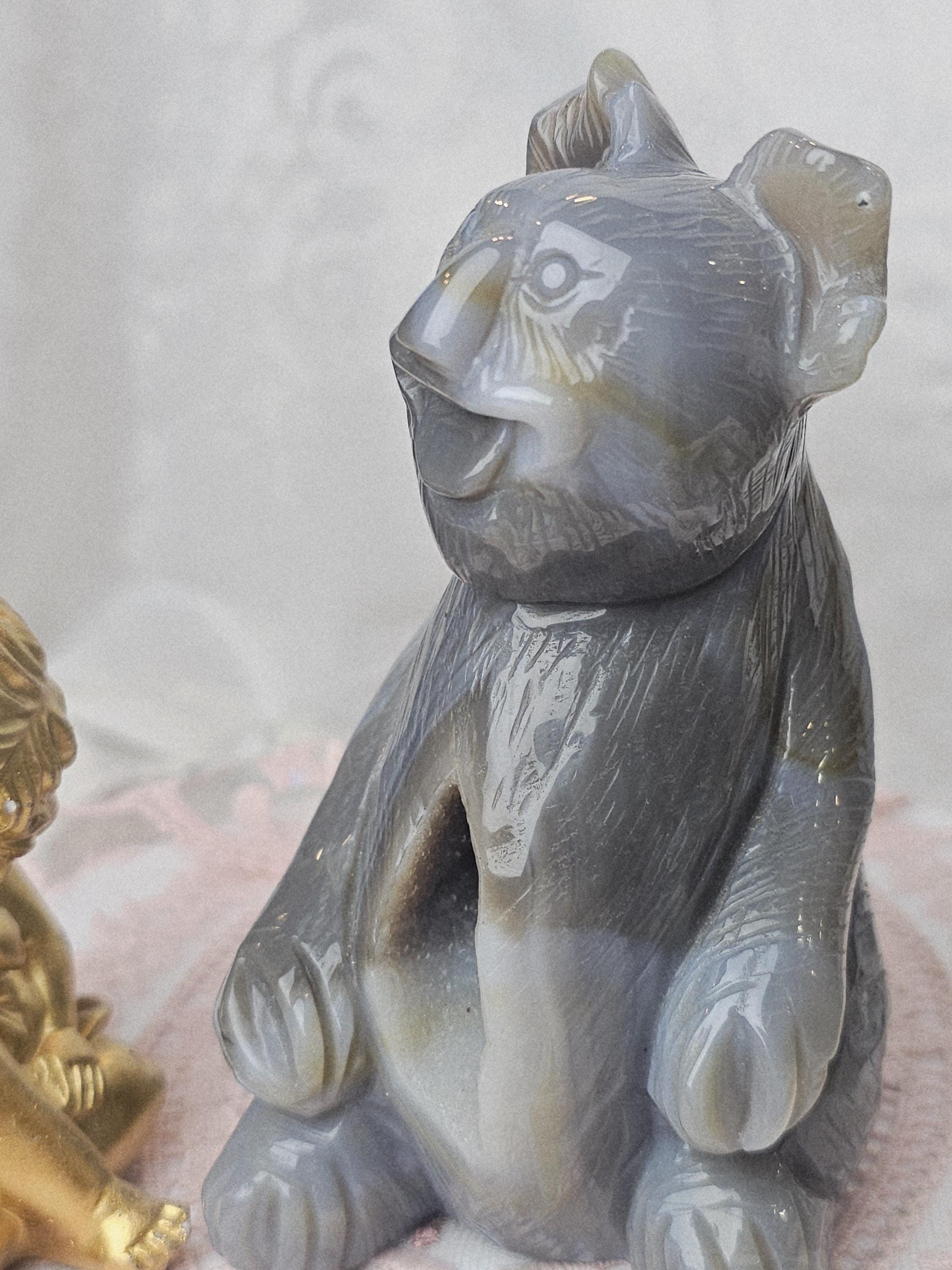 Very unique Banded Agate Bear with beautiful patterns. One of a kind crystal and a fine luxury statement piece. Absolutely amazing in so many ways. Both of these crystals are so unique they are definitely conversation pieces of crystal art. This is a wonderful part of Mother Nature's beauty that you can known.Very elegant piece of art. Such a happy face on this Koala