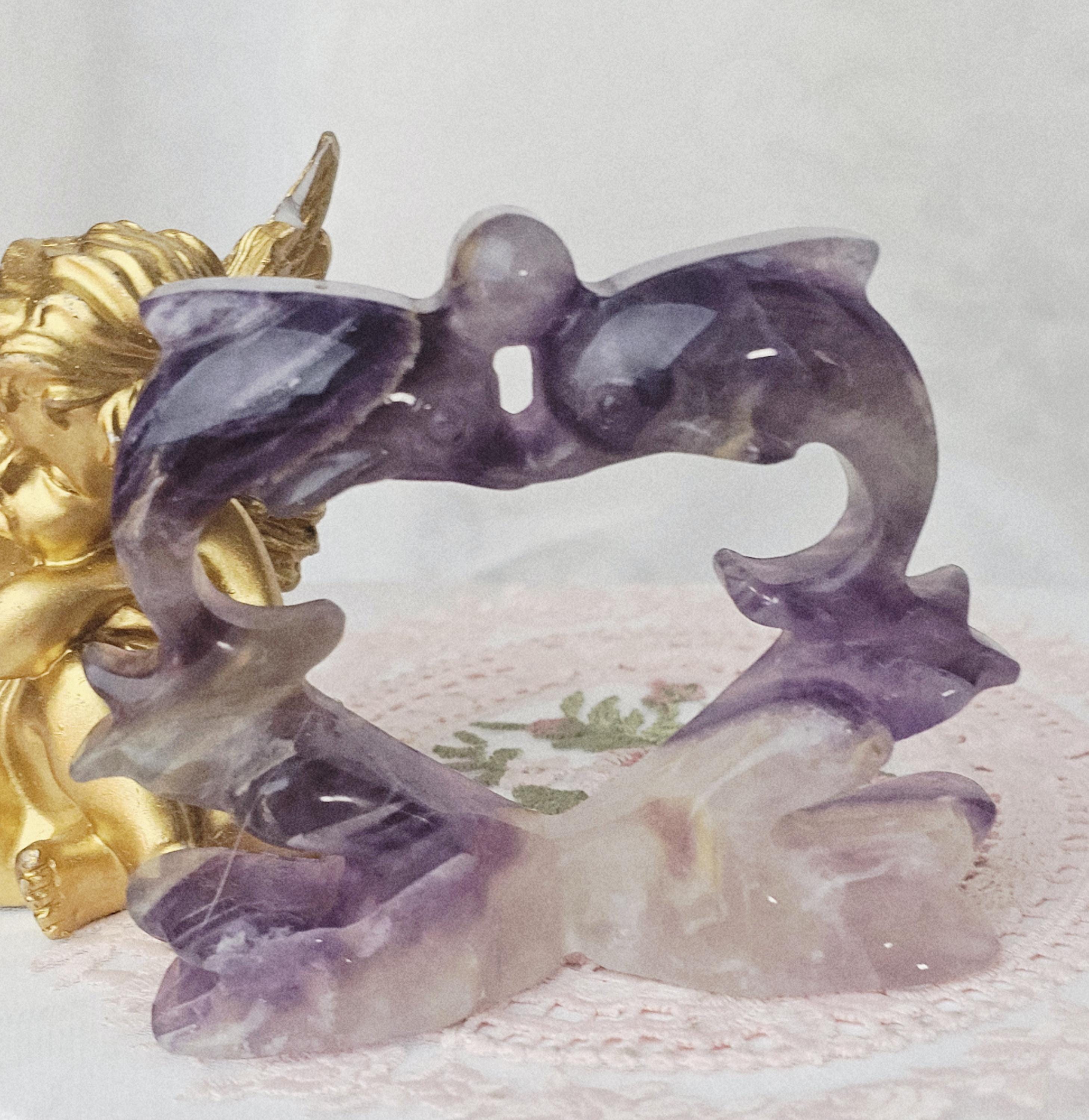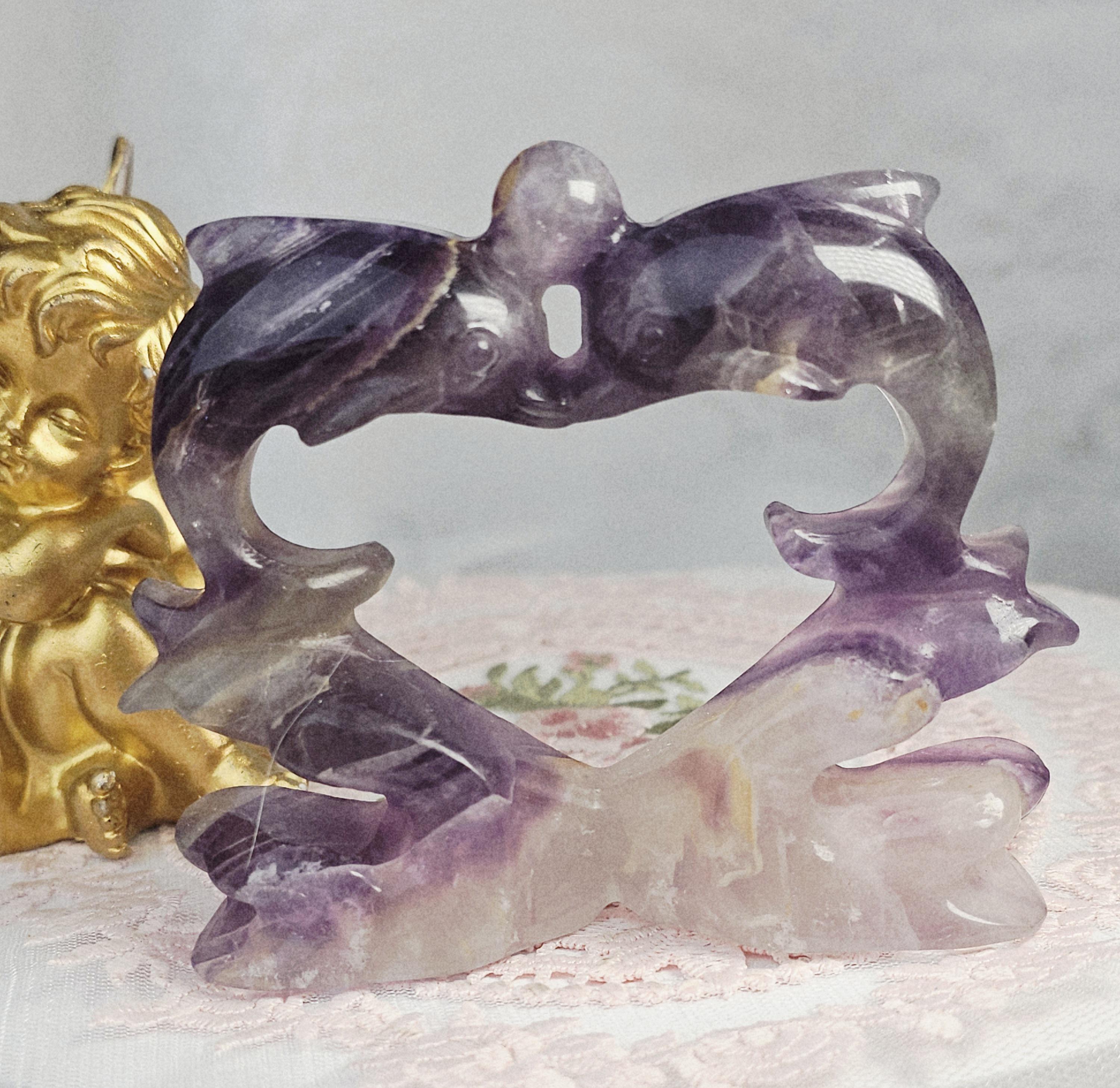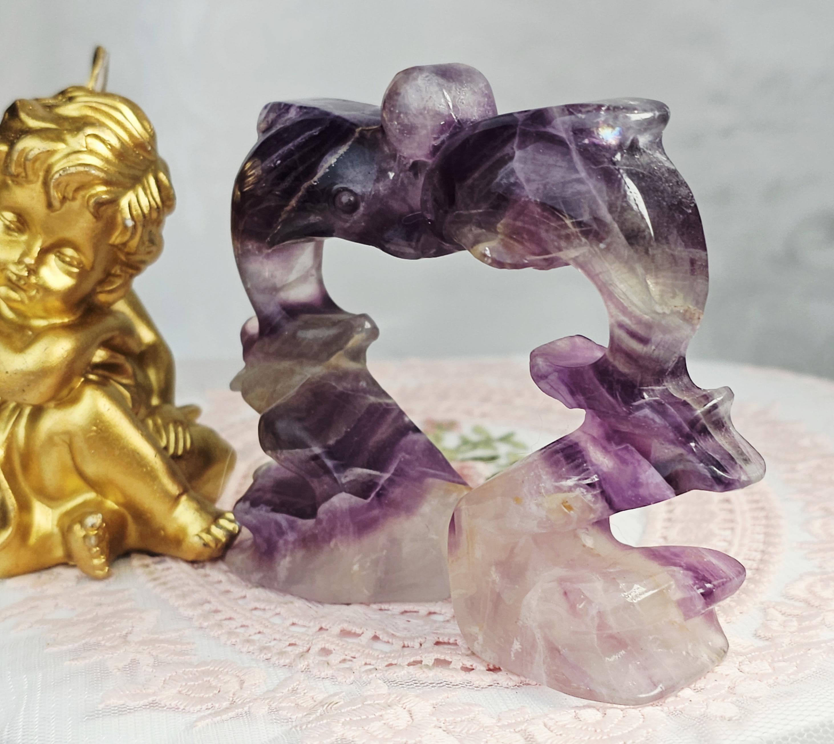 Beautiful Fluorite Dolphin Sculpture of two kissing dolphins.It has windows and great banded depth. Beautiful gift for everyone on every occasion. Great patterns of purple, white and green colors. Let him bring sunshine into your space. Perfect for any Fluorite or crystal lover.
