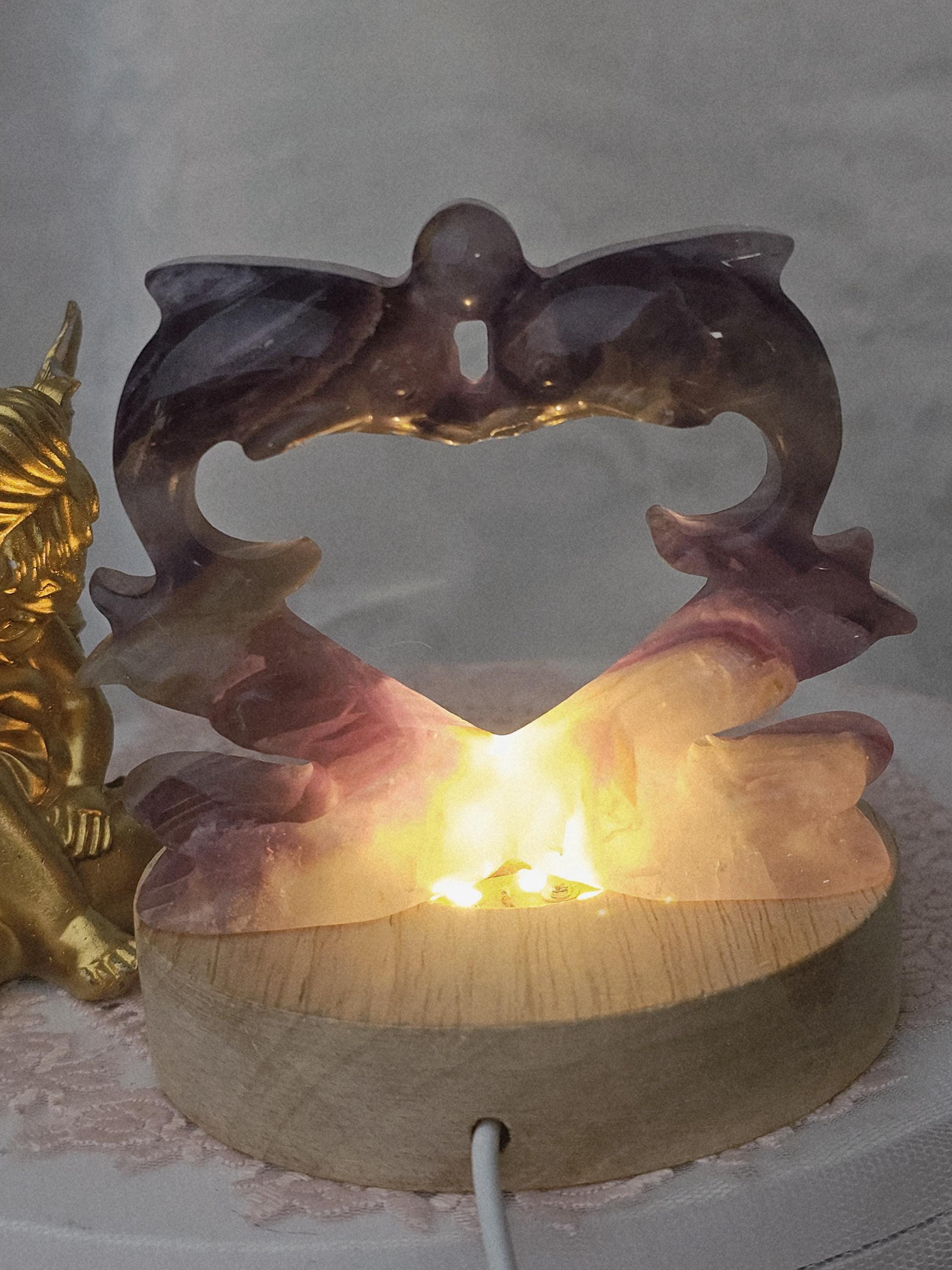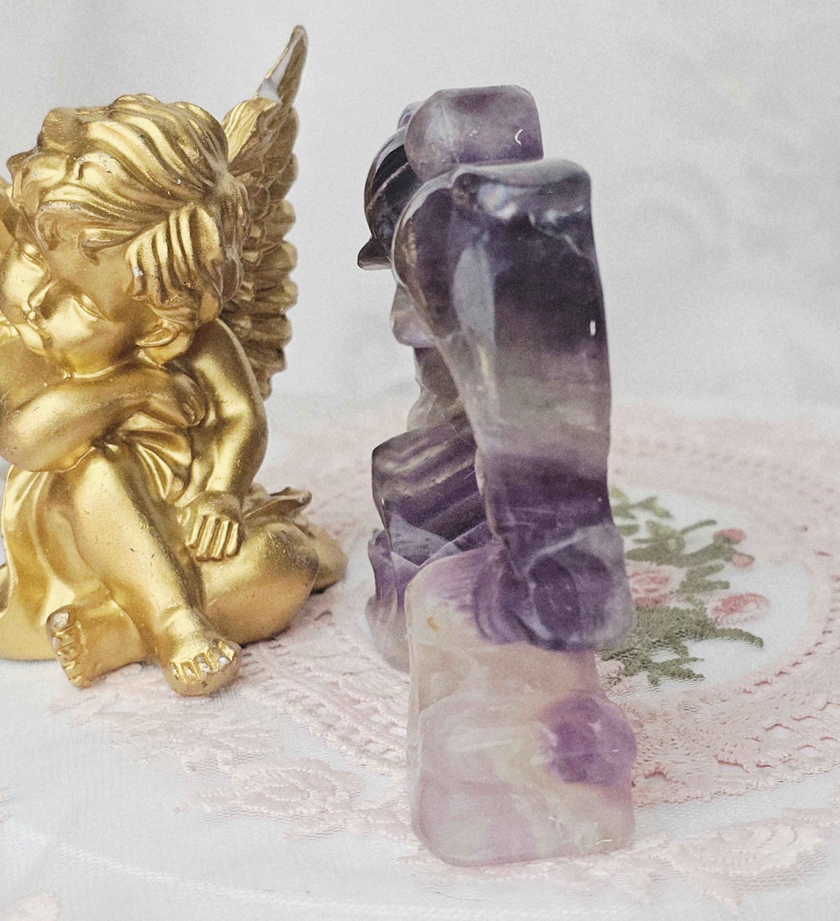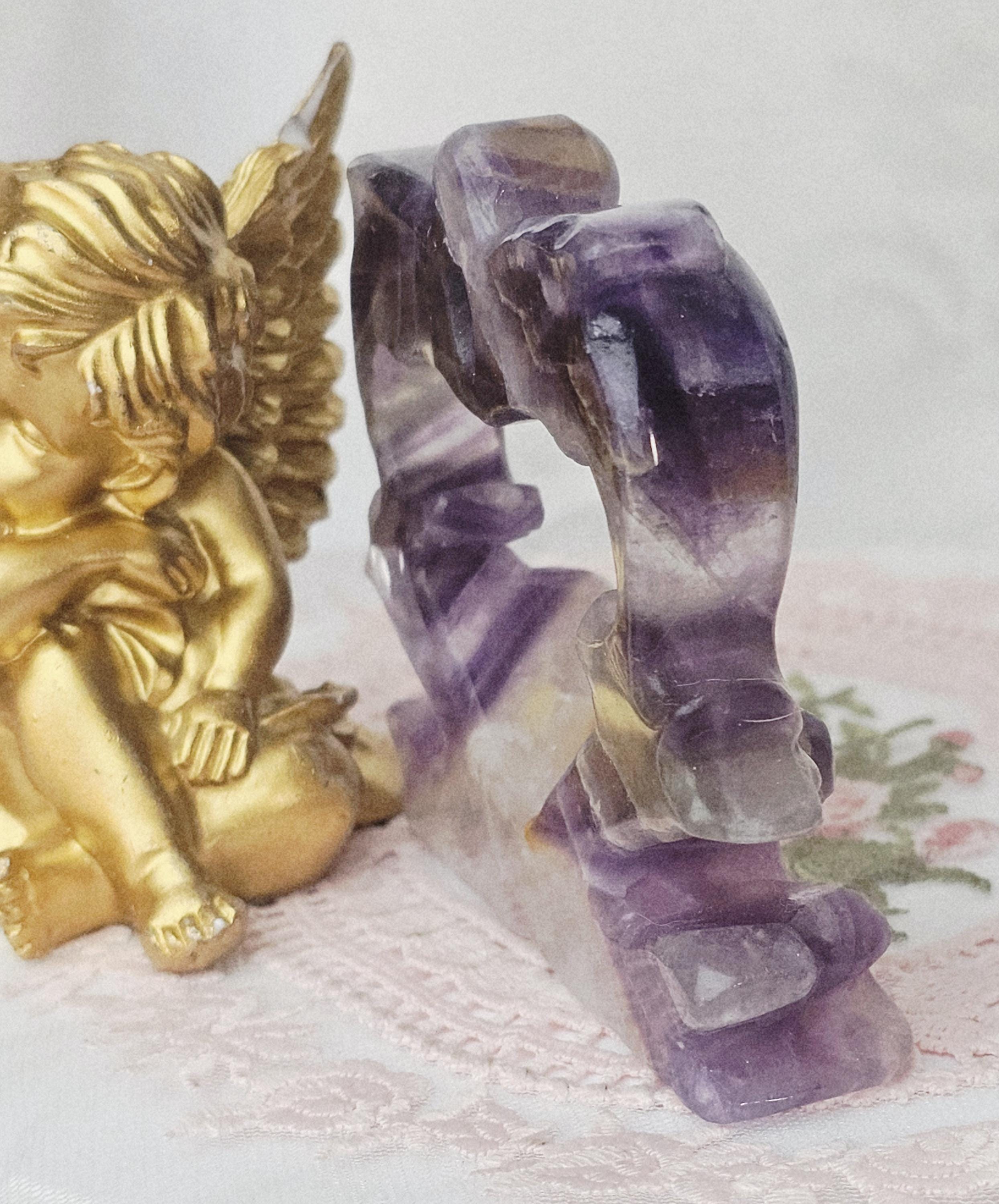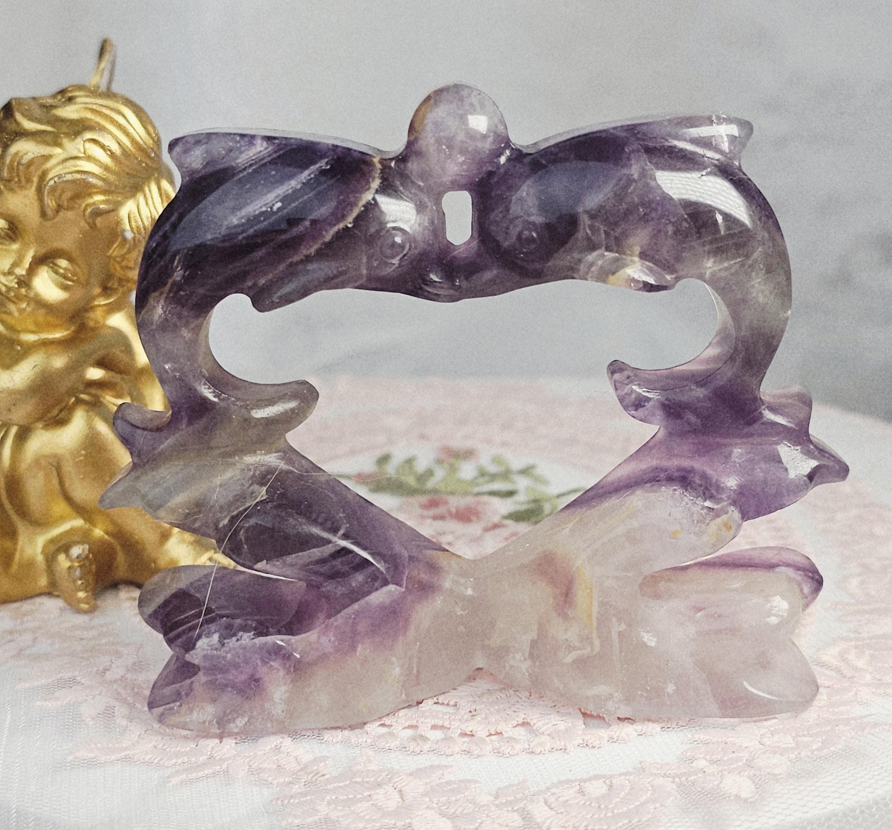 Beautiful Fluorite Dolphin Sculpture of two kissing dolphins.It has windows and great banded depth. Beautiful gift for everyone on every occasion. Great patterns of purple, white and green colors. Let him bring sunshine into your space. Perfect for any Fluorite or crystal lover.