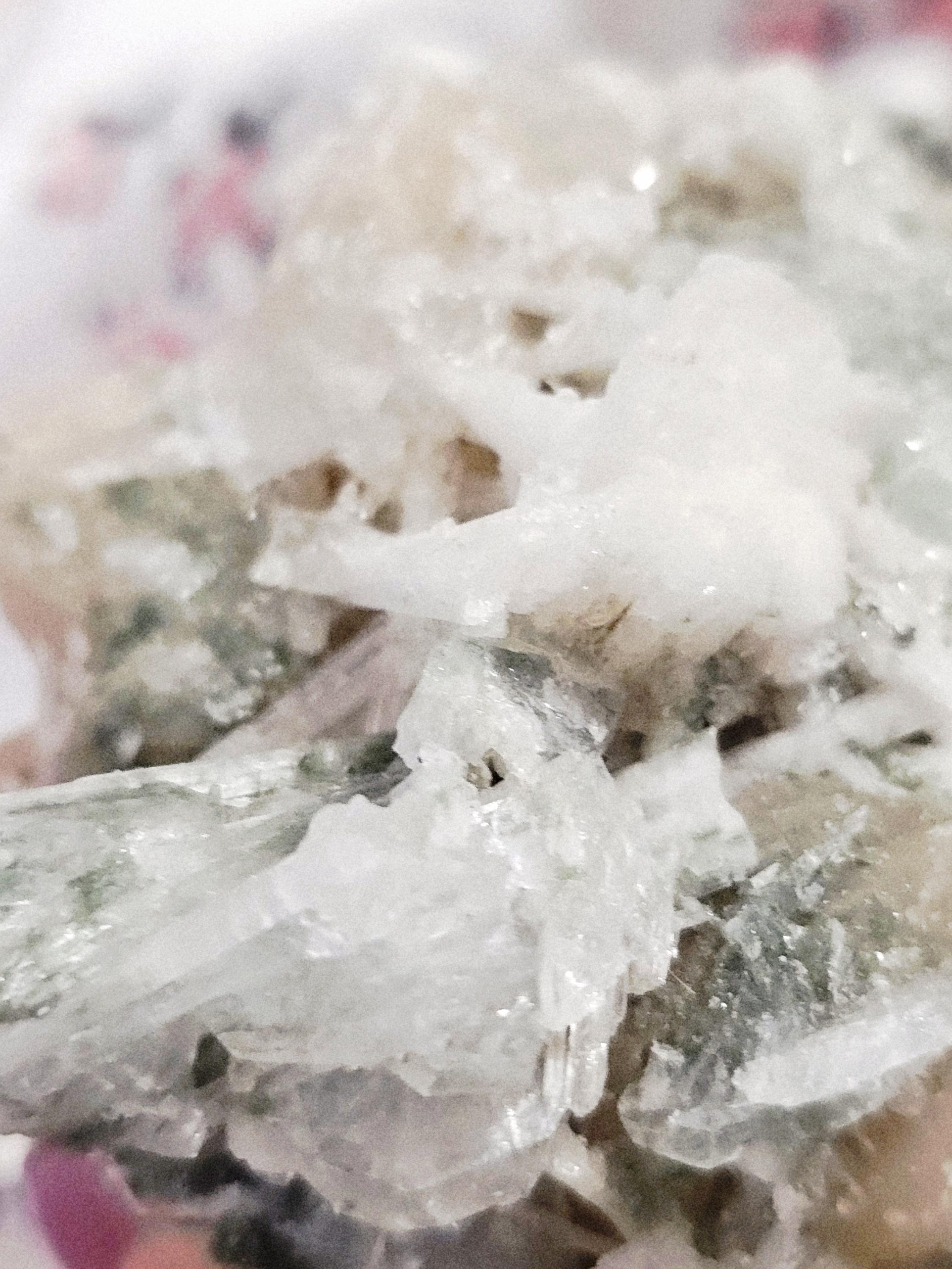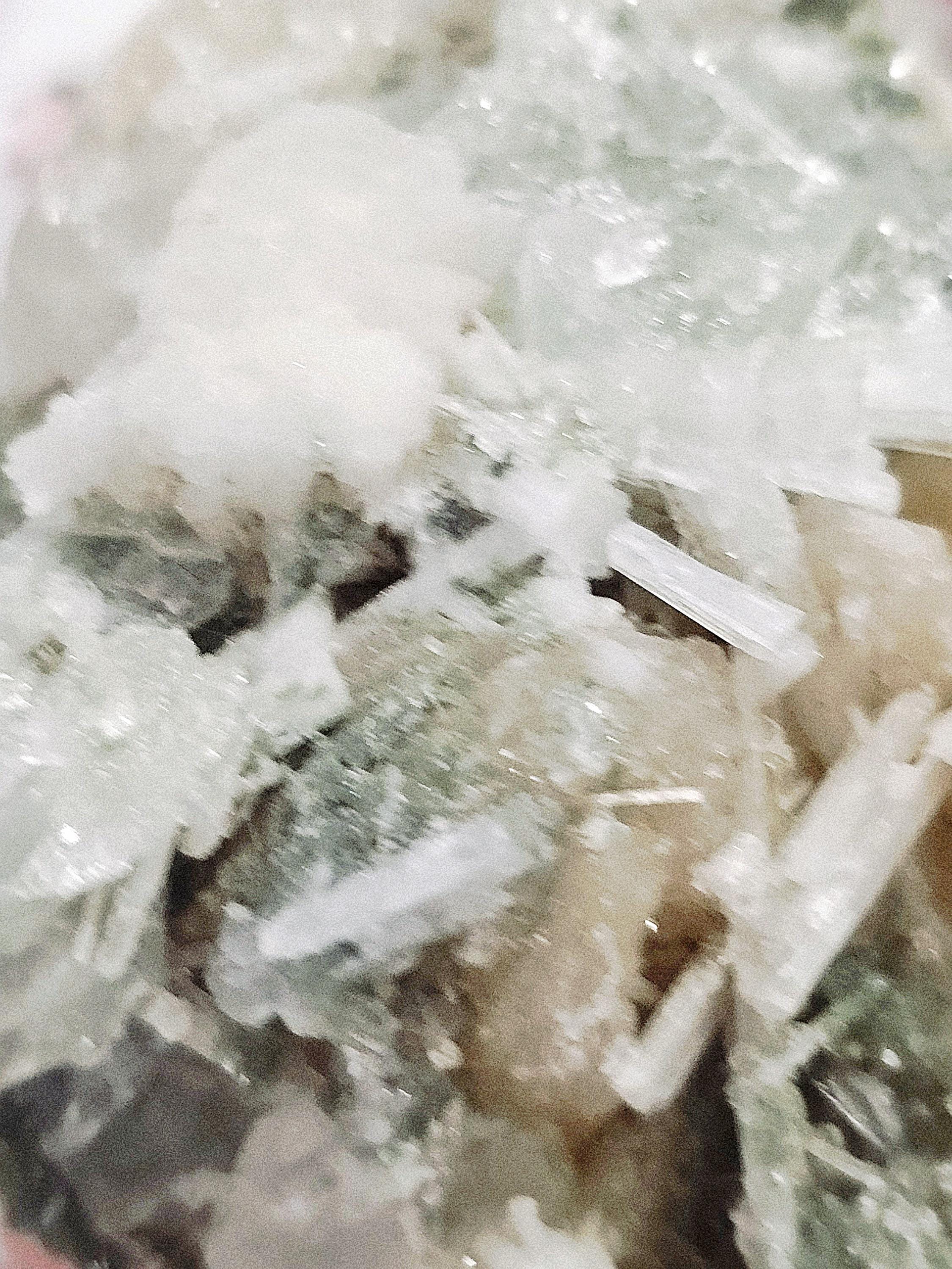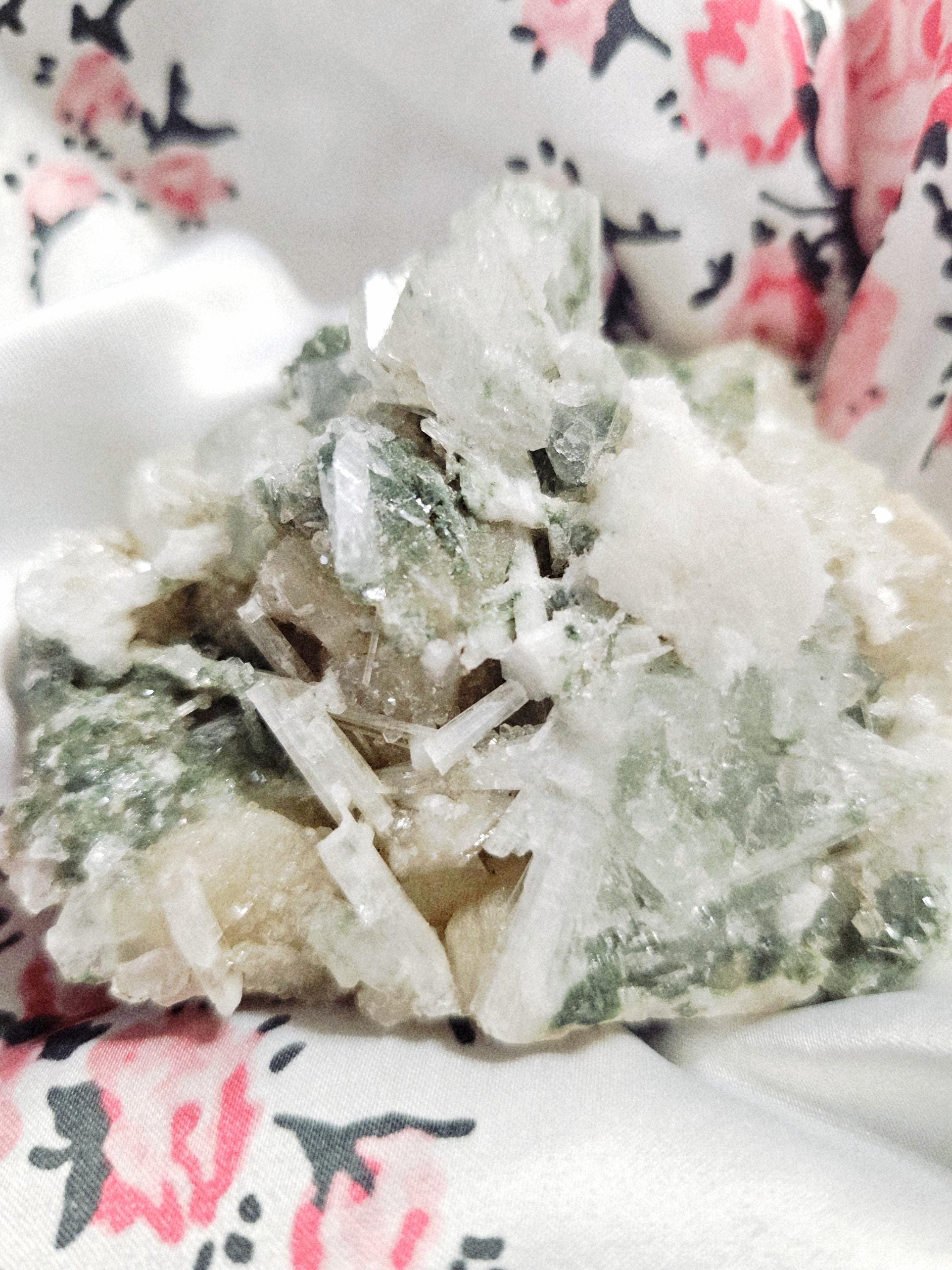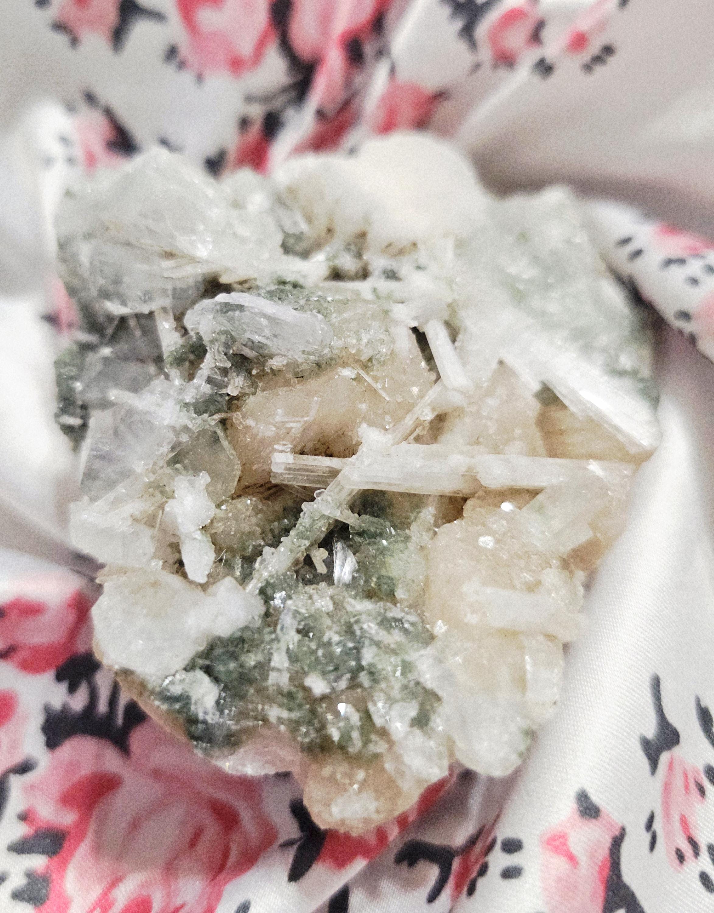 Amazingly Green clusters in peach and white provides depth in this Apophyllite. Unlike most Apophyllite, Candy Apple Apophyllite is known for its clarity and color. It's a piece of paradise. It's a very flashy, sparkly crystal and one of a kind. It has rainbows throughout. This crystal is just ready for display as the gem of a crystal it is. It's a romantic crystal.