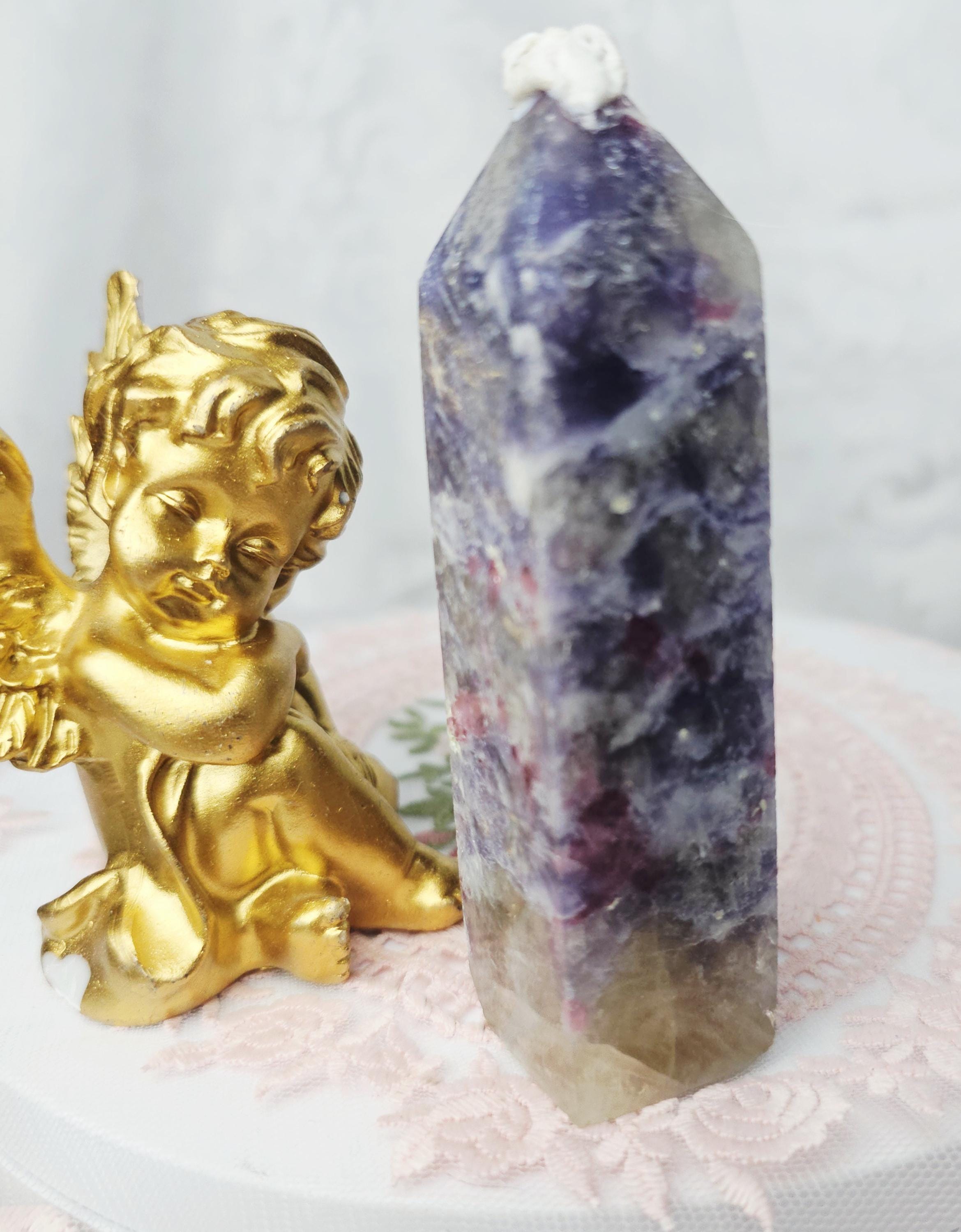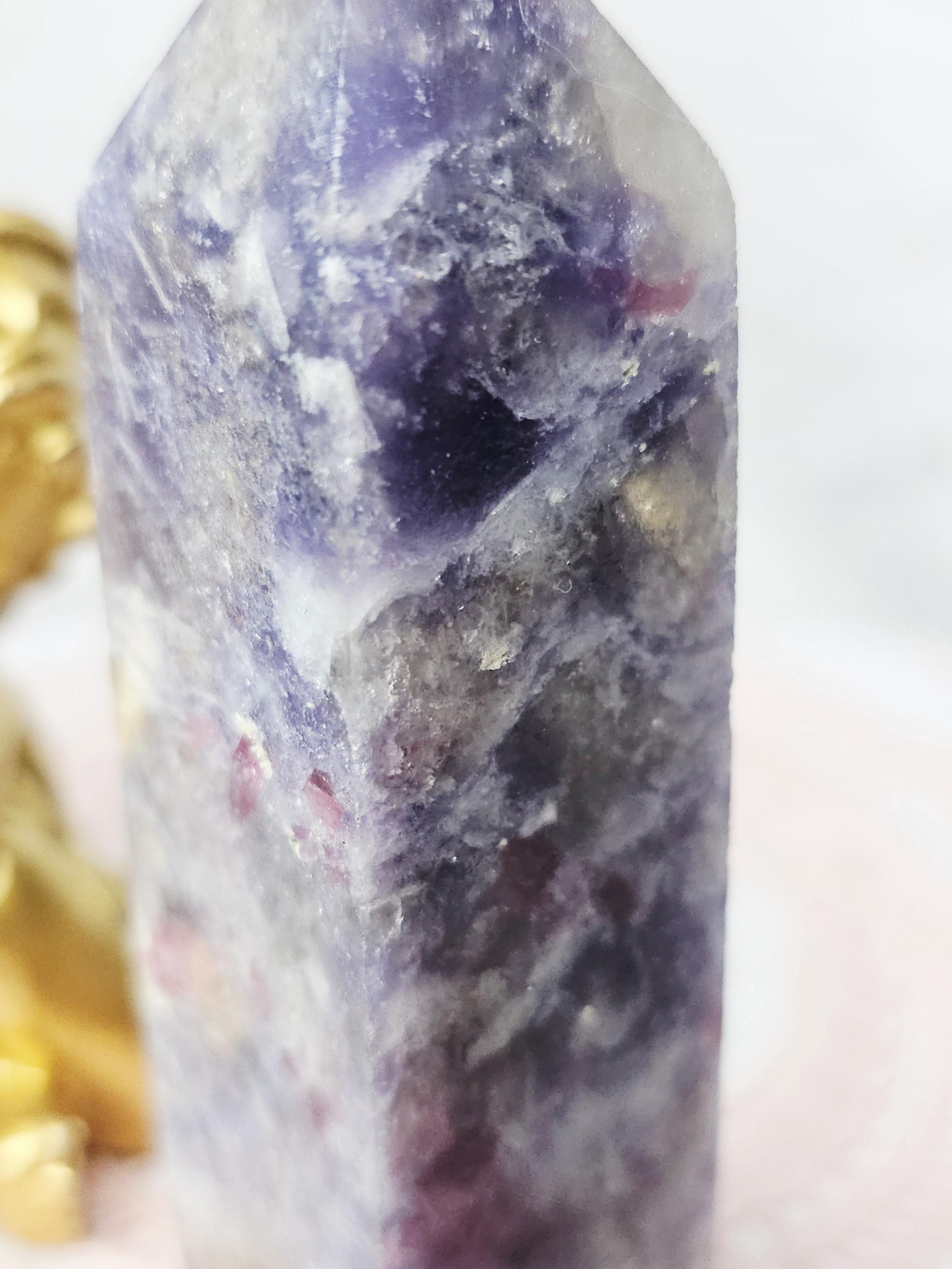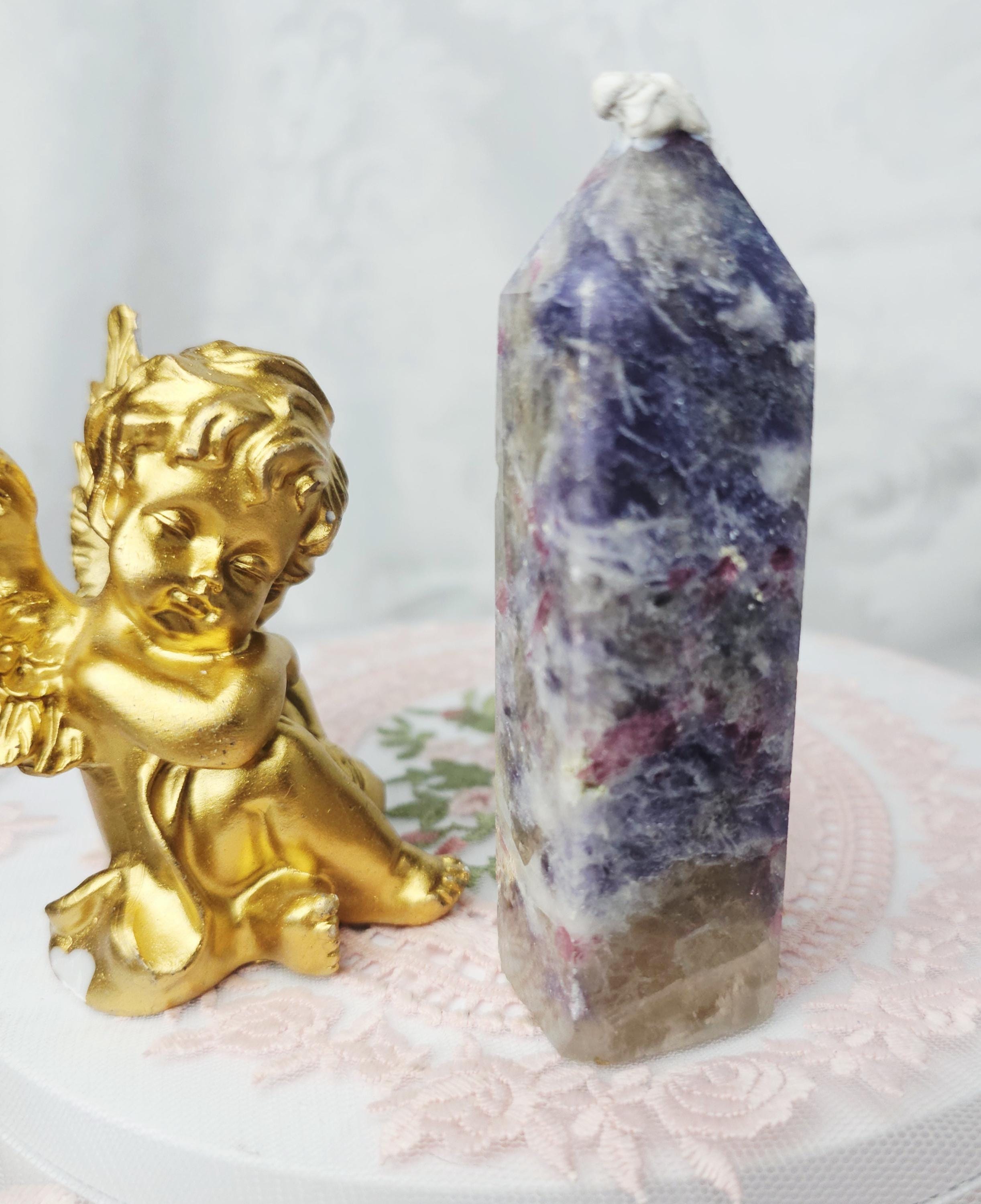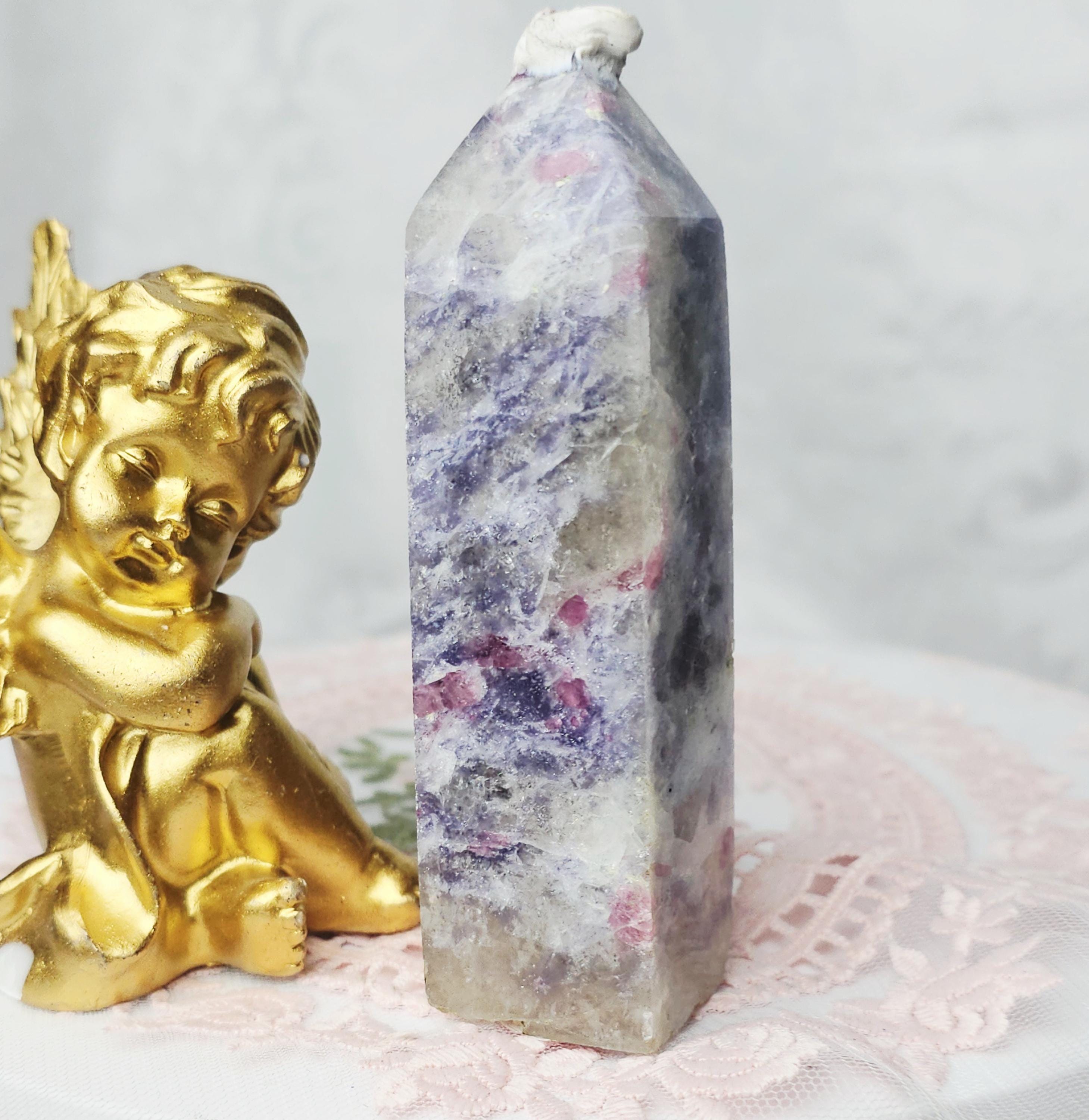 Colorful Unicorj Stone tower. It weighs 6.6 oz and is over 4.25 inches tall. It's highly collectible and a great statement piece. This Unicorn Stone is a perfect gift. Beautiful purples and pinks which means it has a high quantity of Pink Tourmaline and Purple Mica in it.Great gift for Horse or Unicorn Collector. All crystals are Reiki and Angelic energy infused Crystals. Ethically sourced crystal carving.