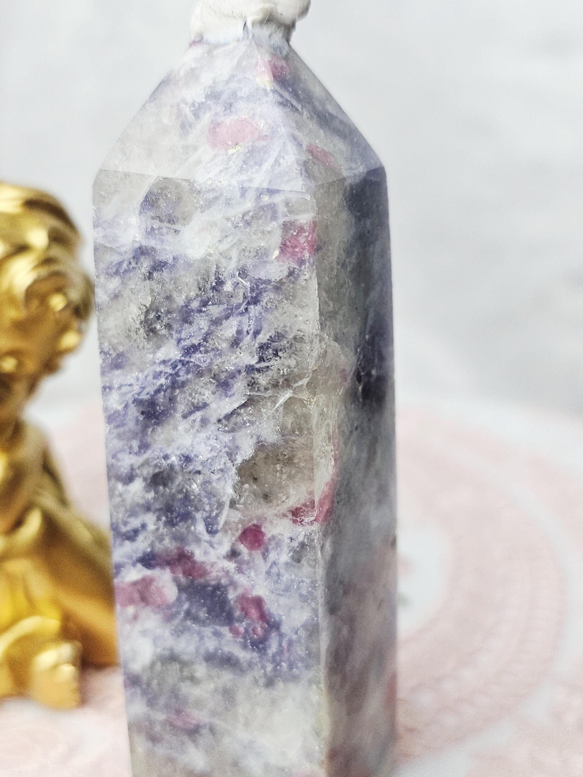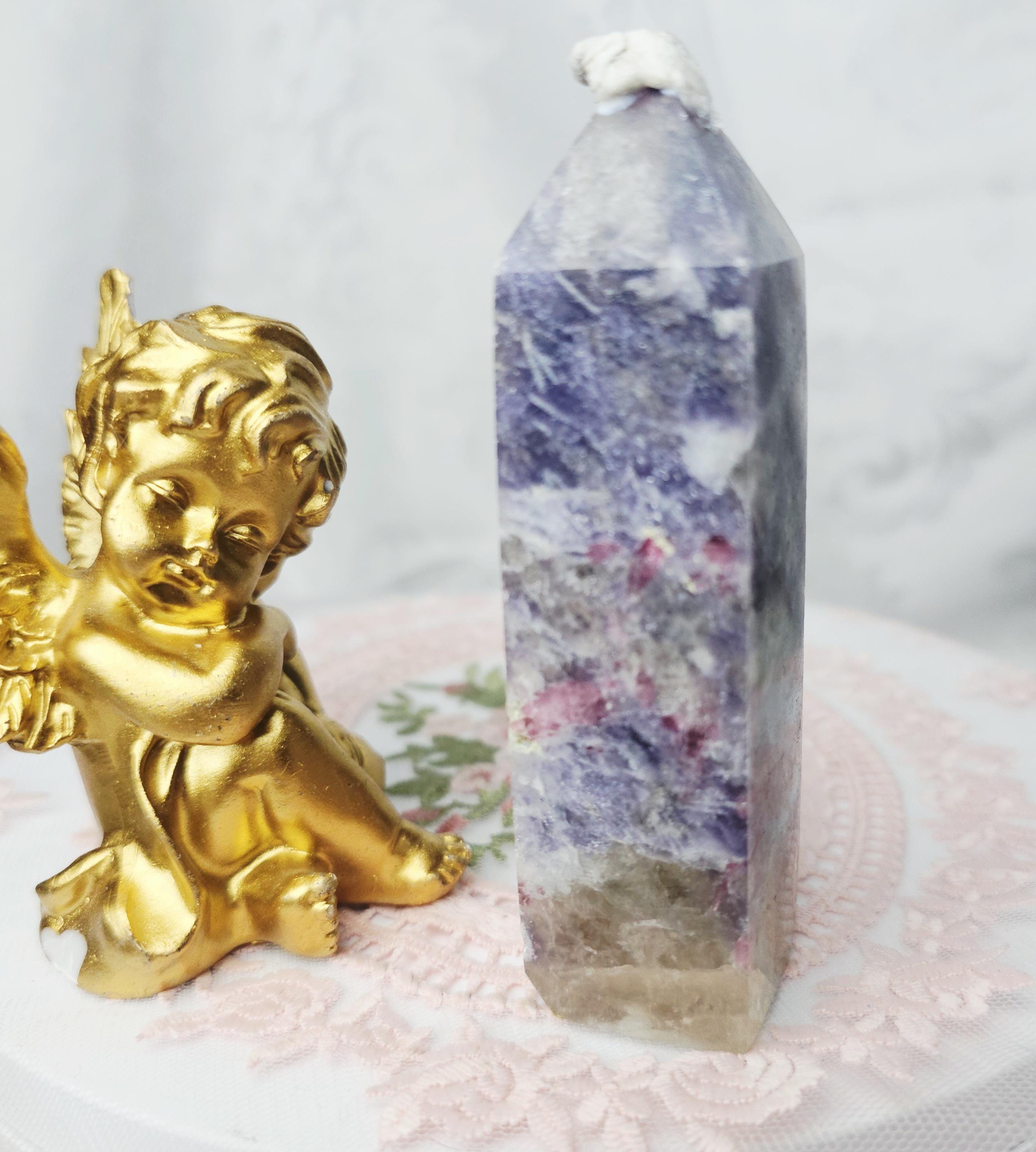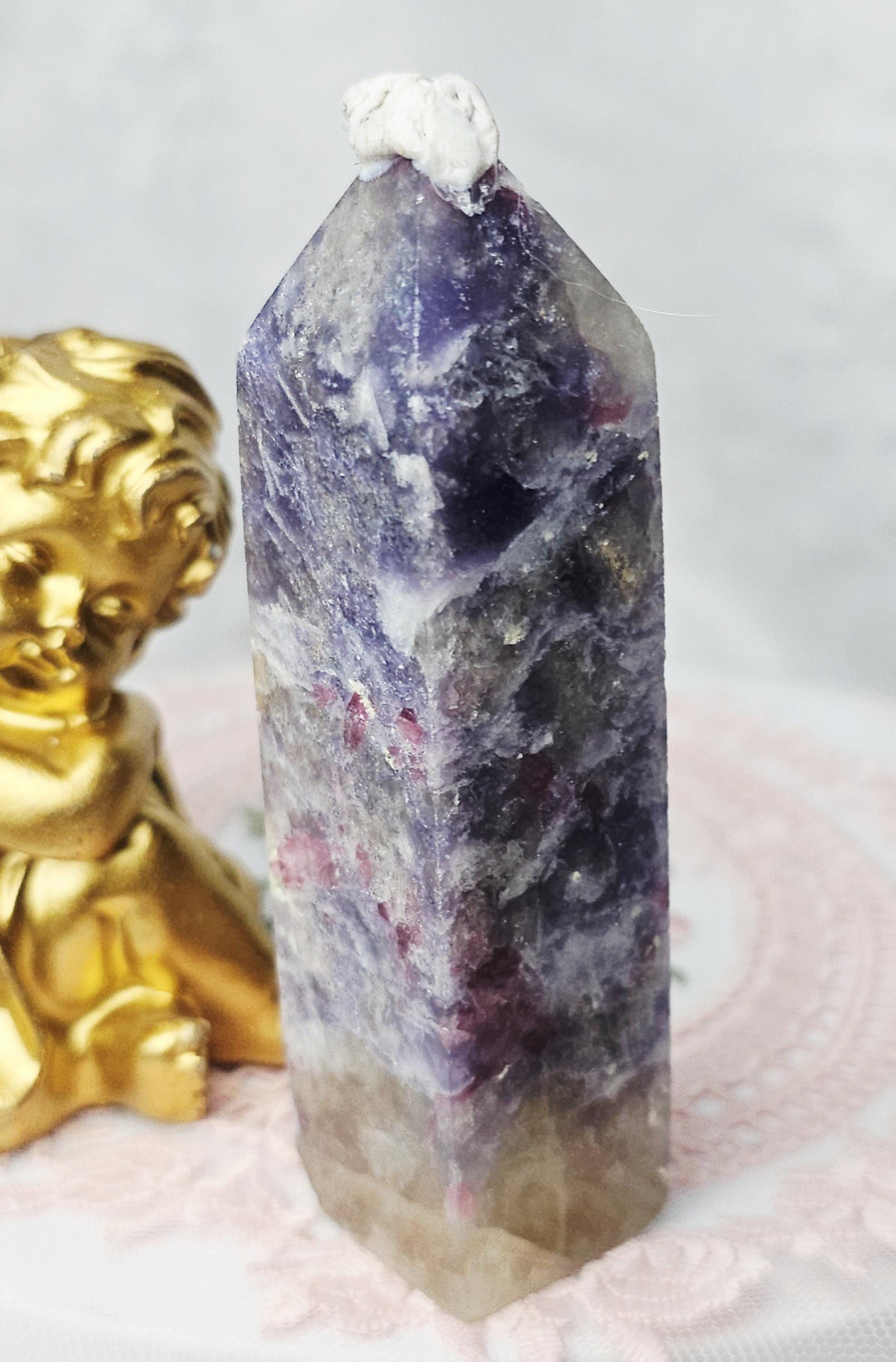 Colorful Unicorj Stone tower. It weighs 6.6 oz and is over 4.25 inches tall. It's highly collectible and a great statement piece. This Unicorn Stone is a perfect gift. Beautiful purples and pinks which means it has a high quantity of Pink Tourmaline and Purple Mica in it.Great gift for Horse or Unicorn Collector. All crystals are Reiki and Angelic energy infused Crystals. Ethically sourced crystal carving.
