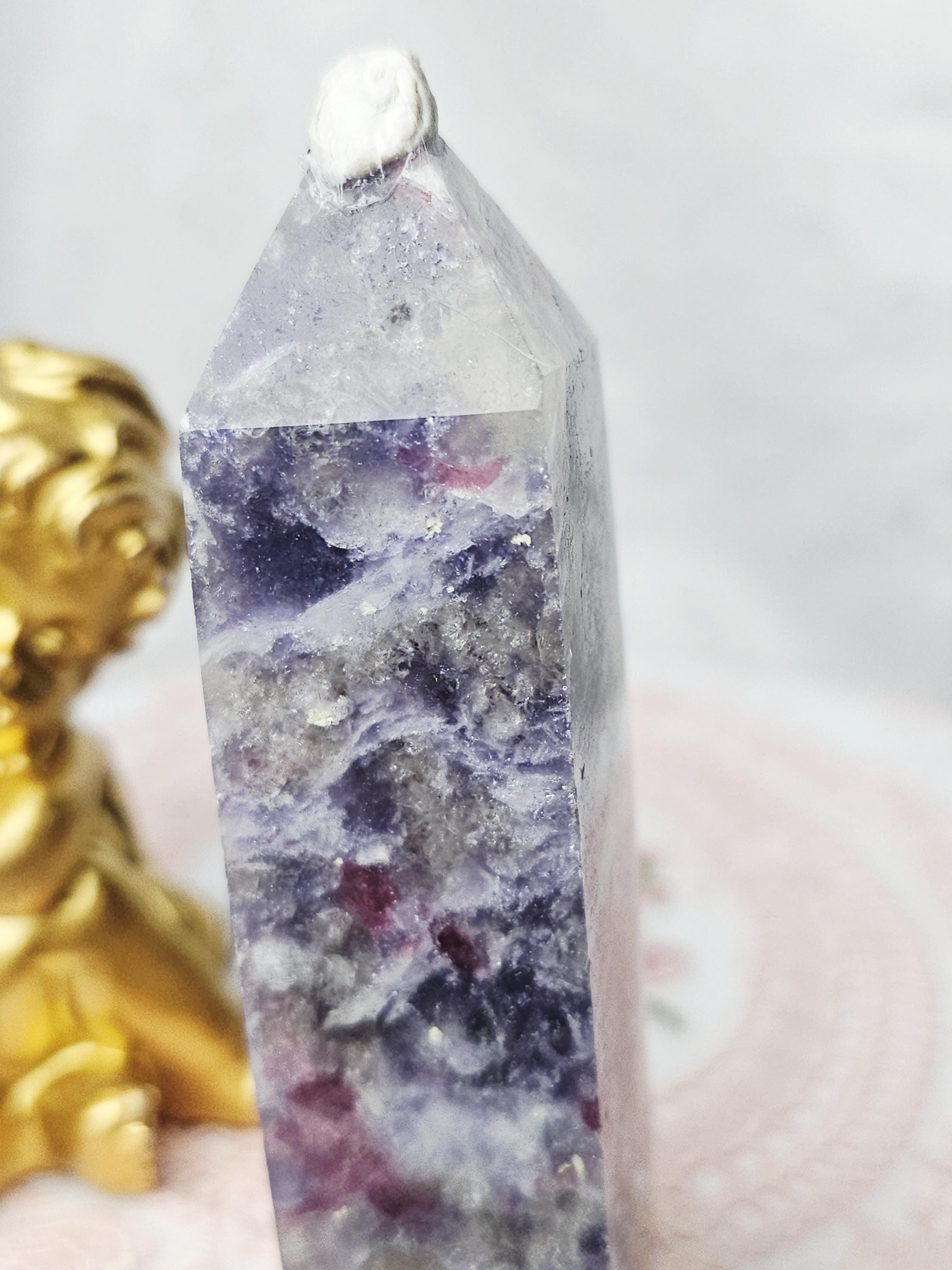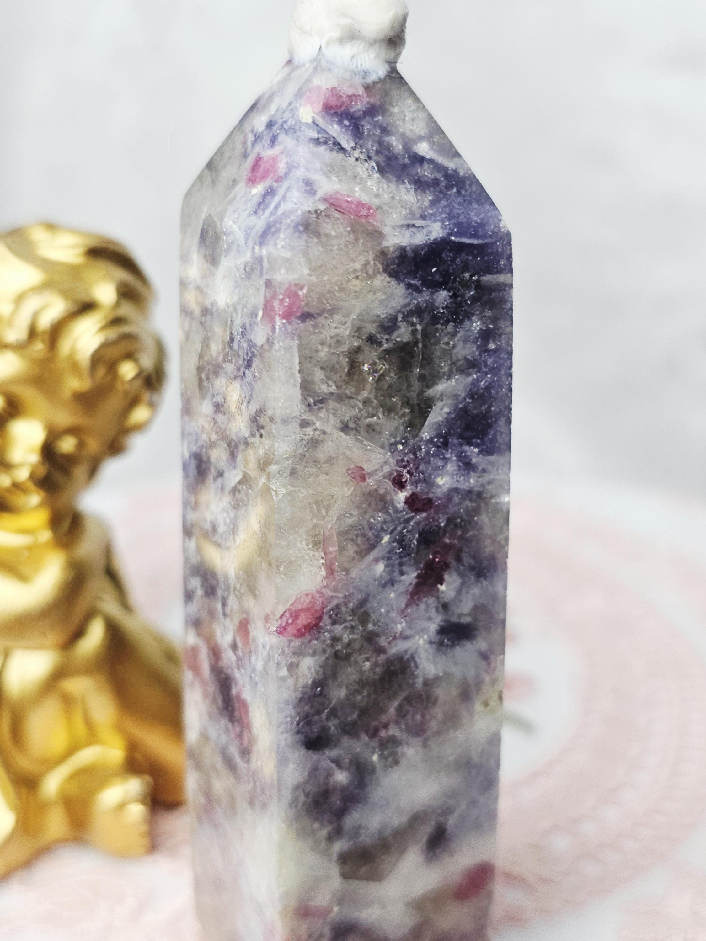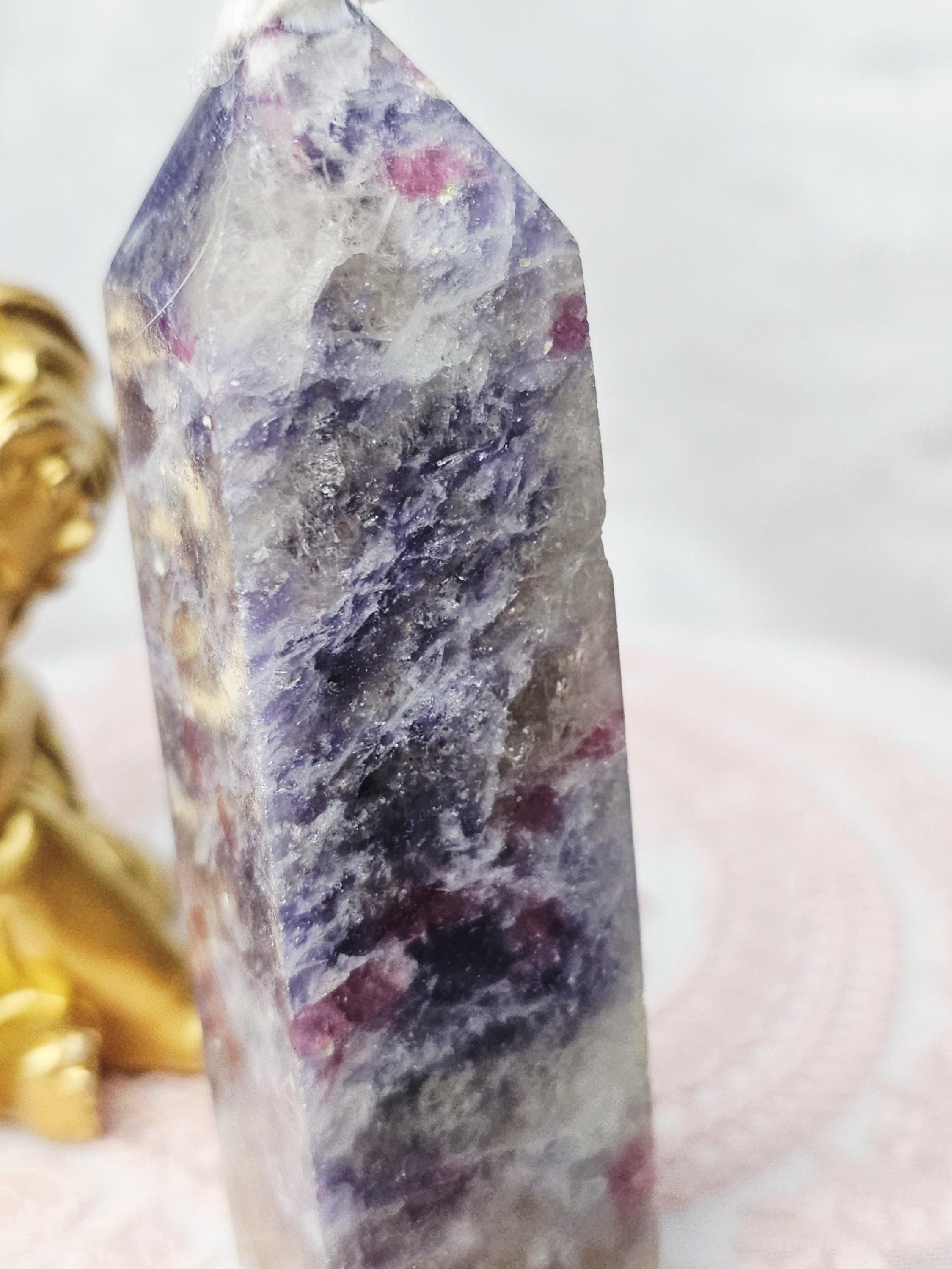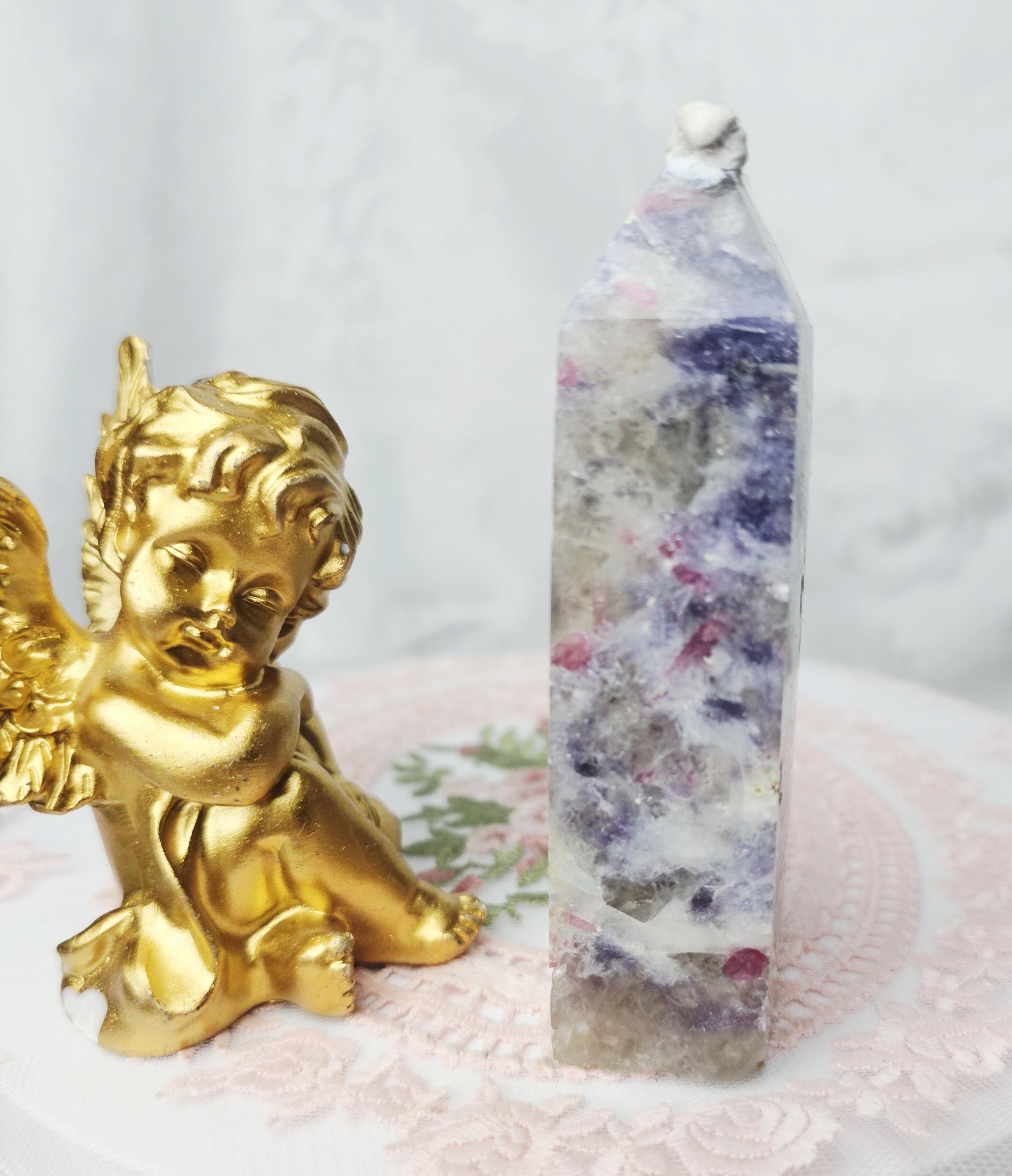 Colorful Unicorj Stone tower. It weighs 6.6 oz and is over 4.25 inches tall. It's highly collectible and a great statement piece. This Unicorn Stone is a perfect gift. Beautiful purples and pinks which means it has a high quantity of Pink Tourmaline and Purple Mica in it.Great gift for Horse or Unicorn Collector. All crystals are Reiki and Angelic energy infused Crystals. Ethically sourced crystal carving.