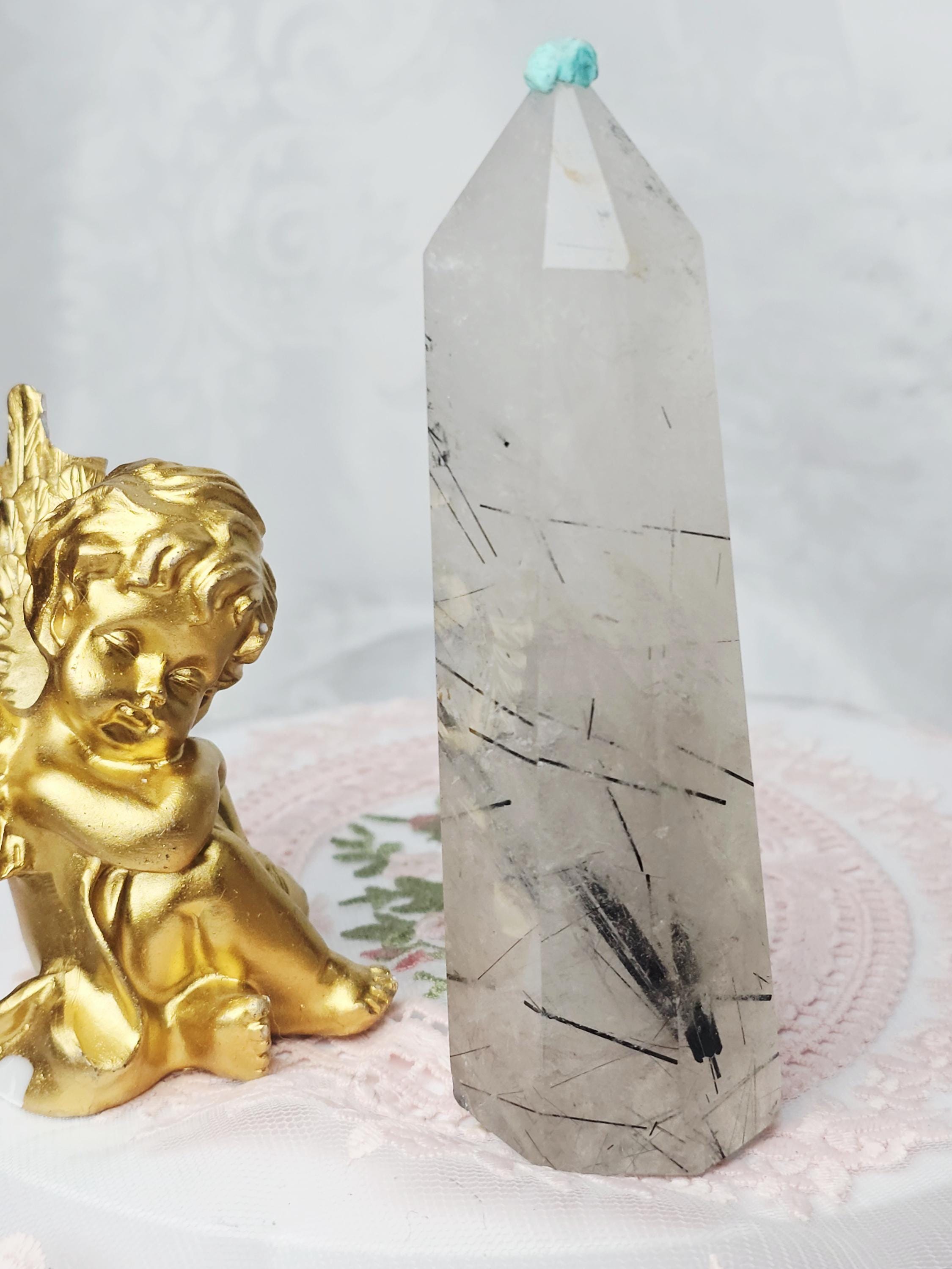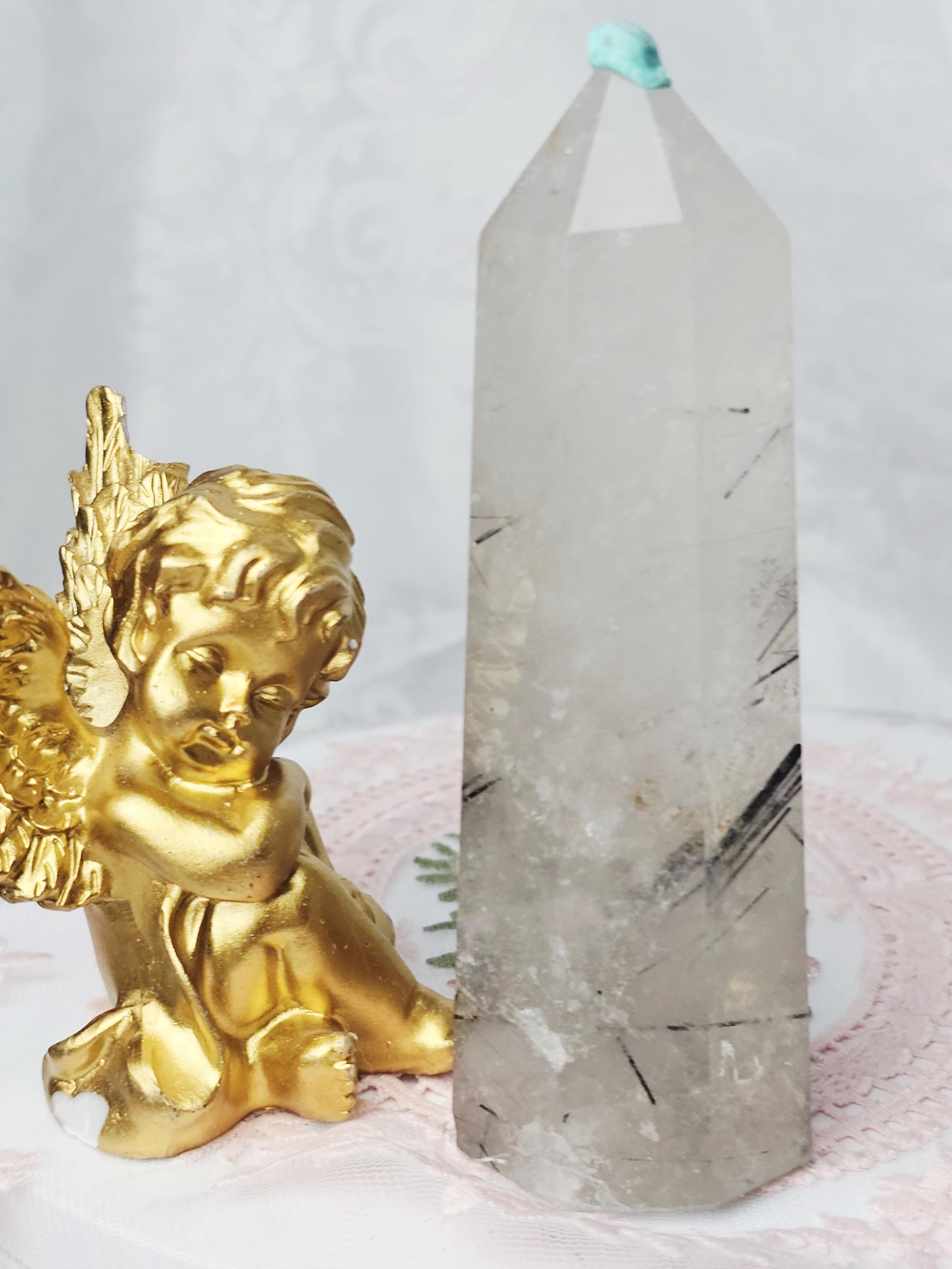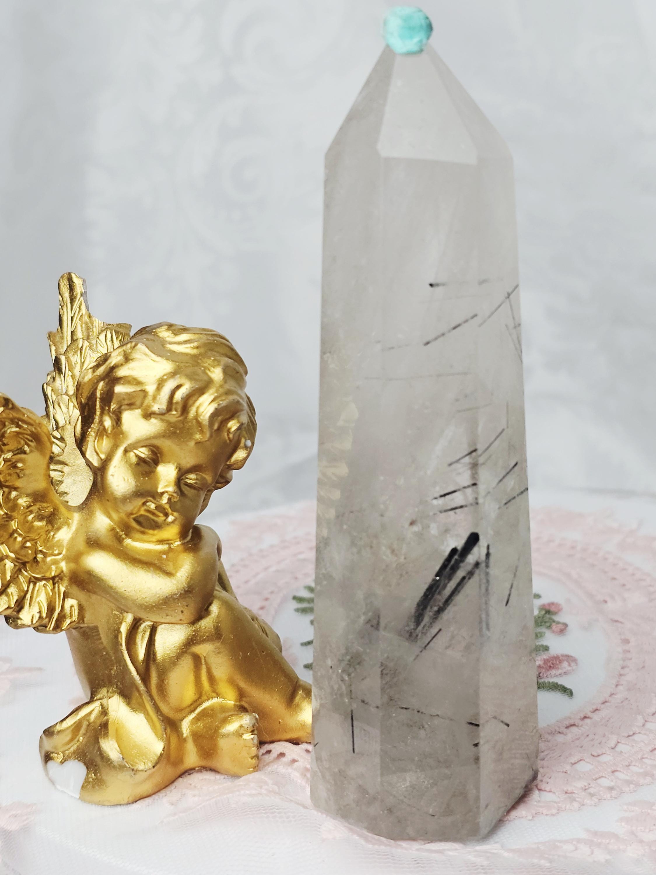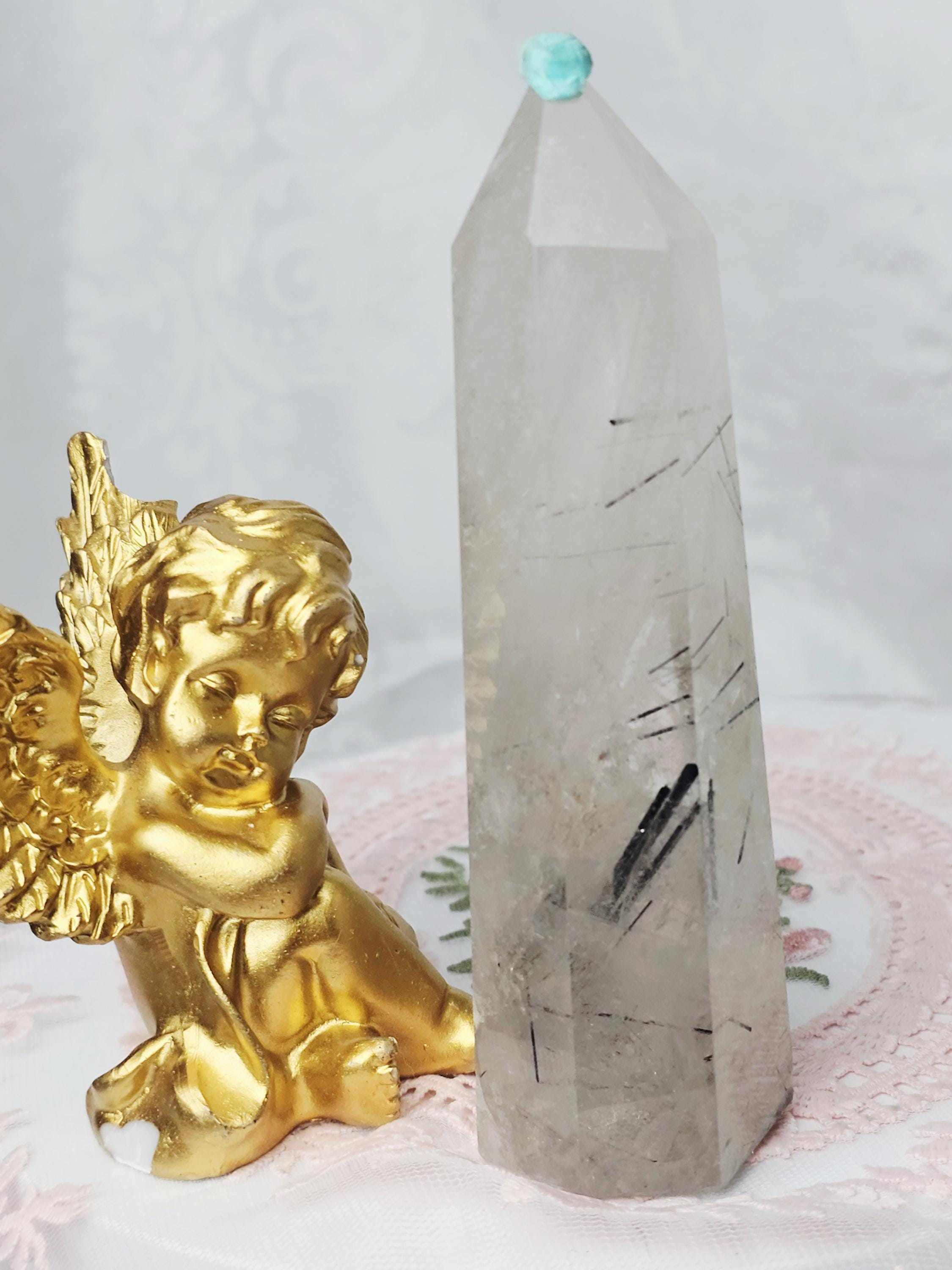 Black Tourmaline Rutilated Tower with rainbows and flash. It's a great for harmonizing, protection and abundance. The sphere is a unique find for any true crystal lover or Healer. The flashes throughout make it a perfect collectible.
