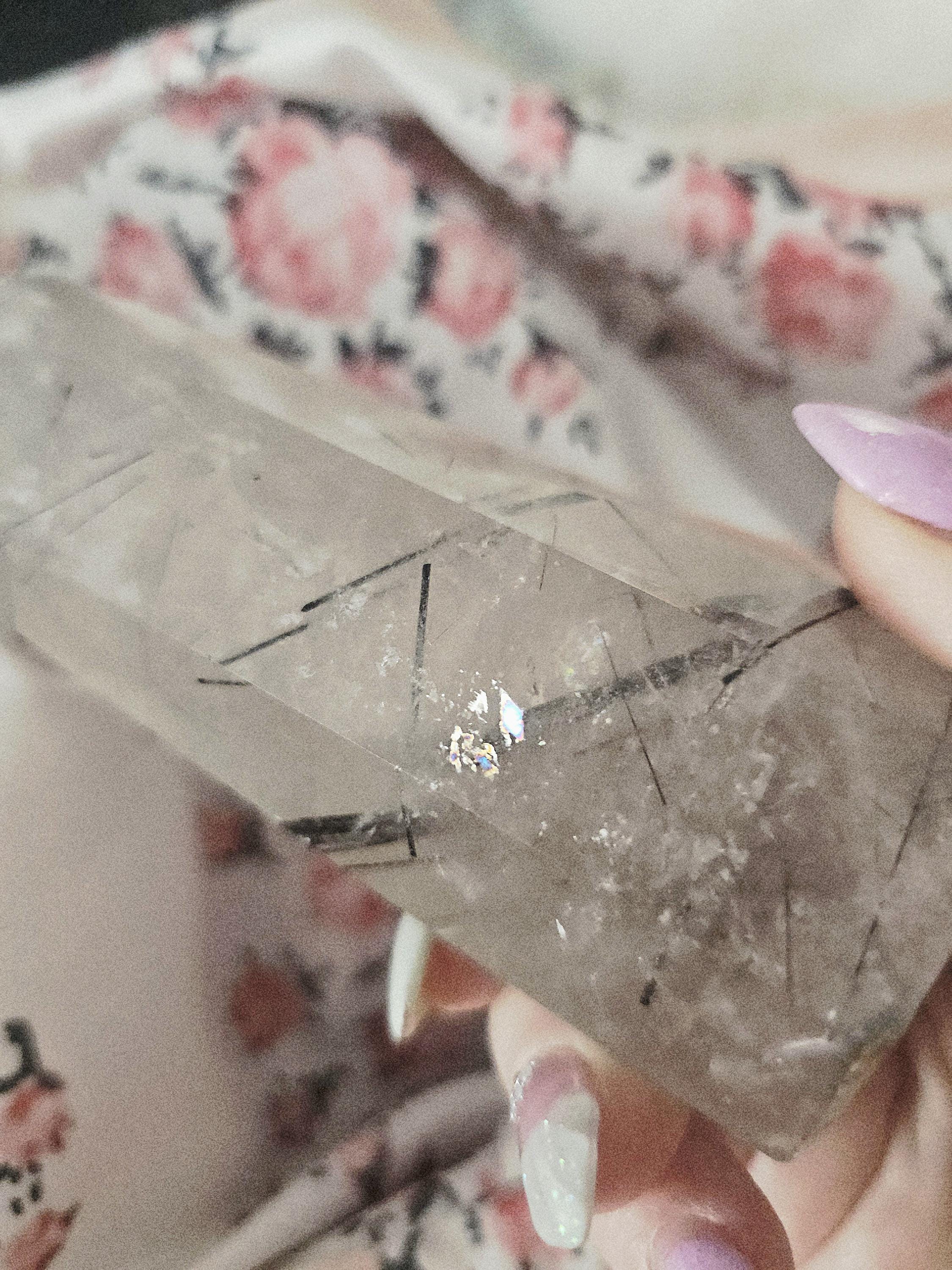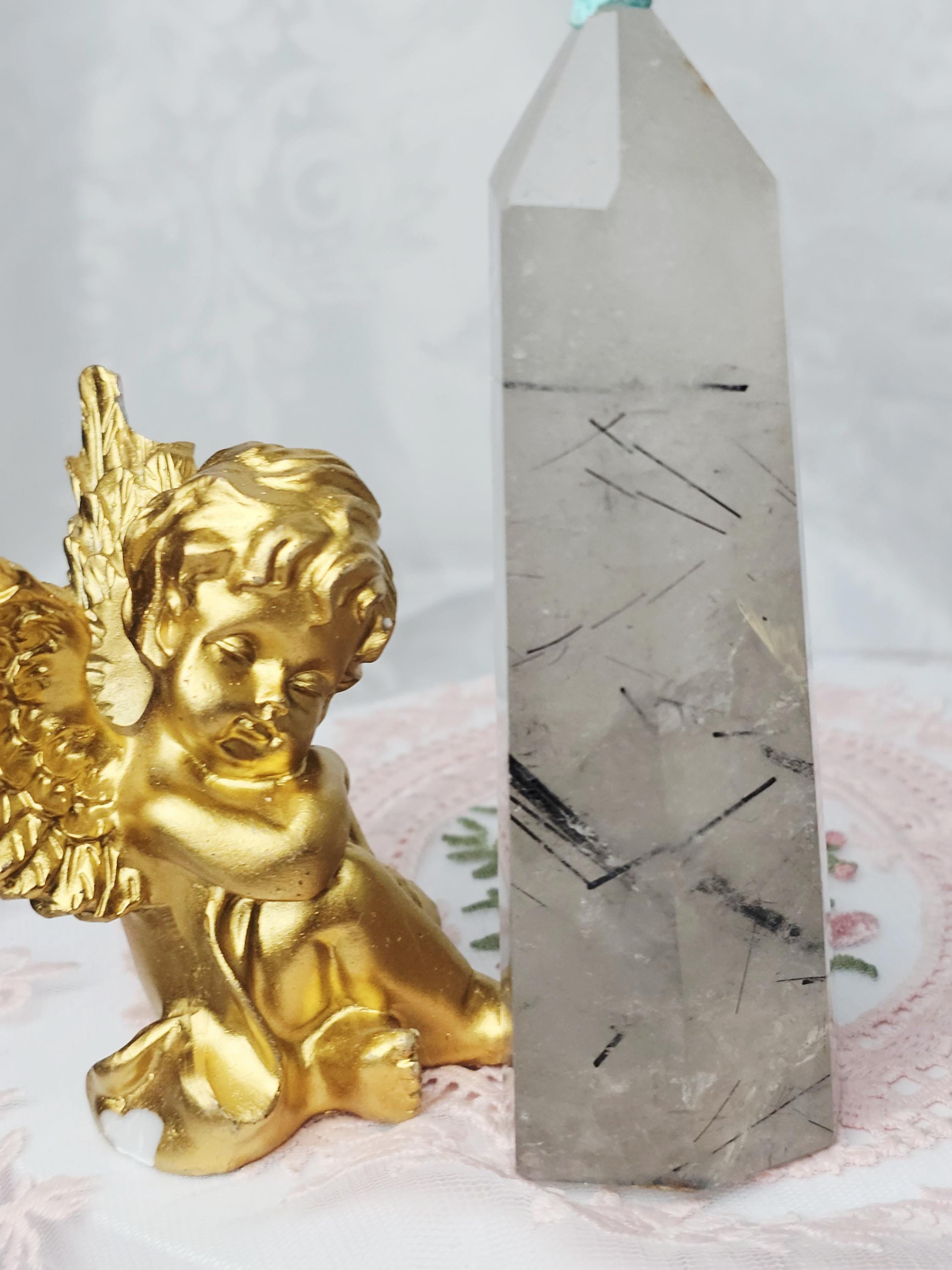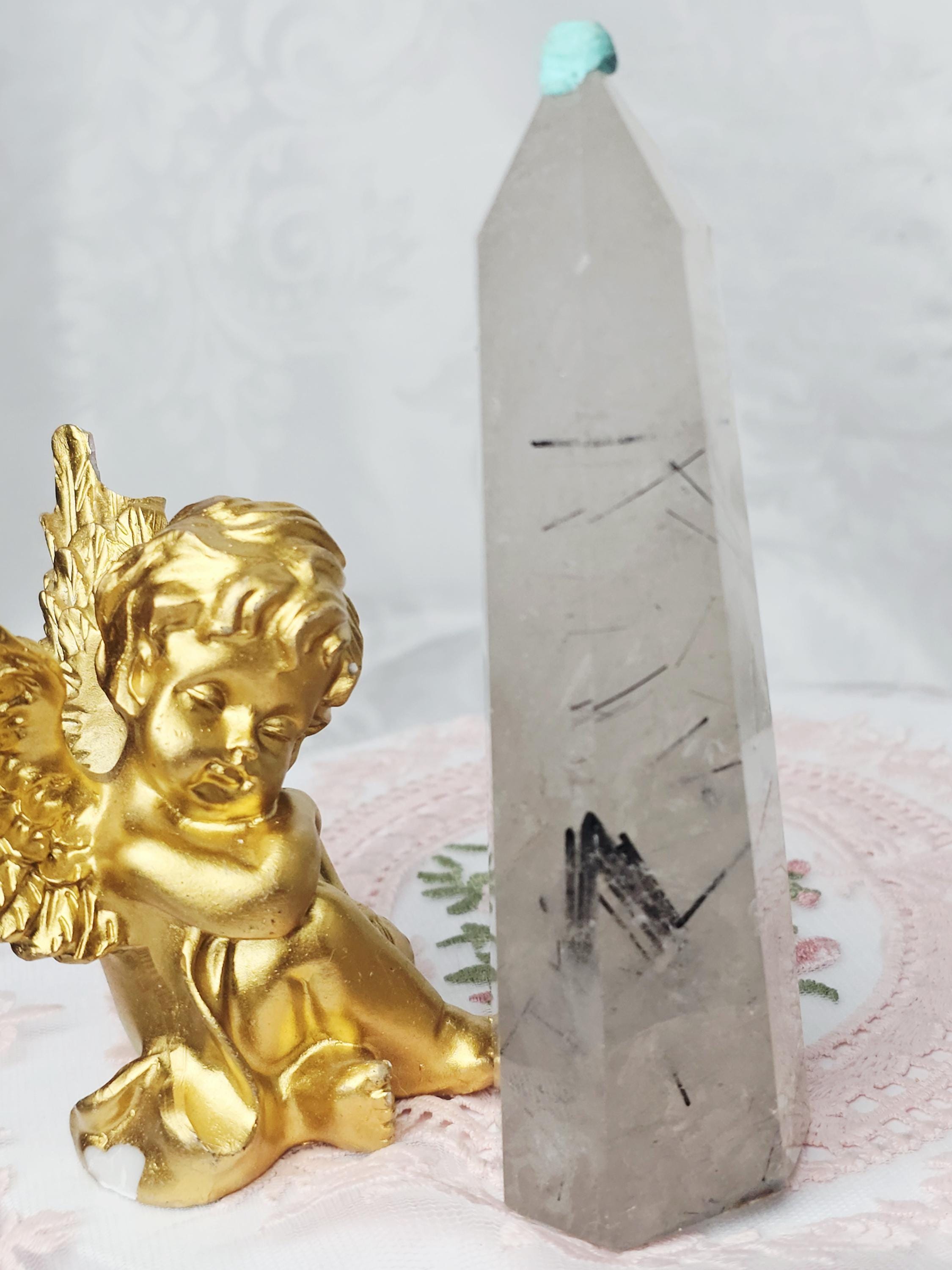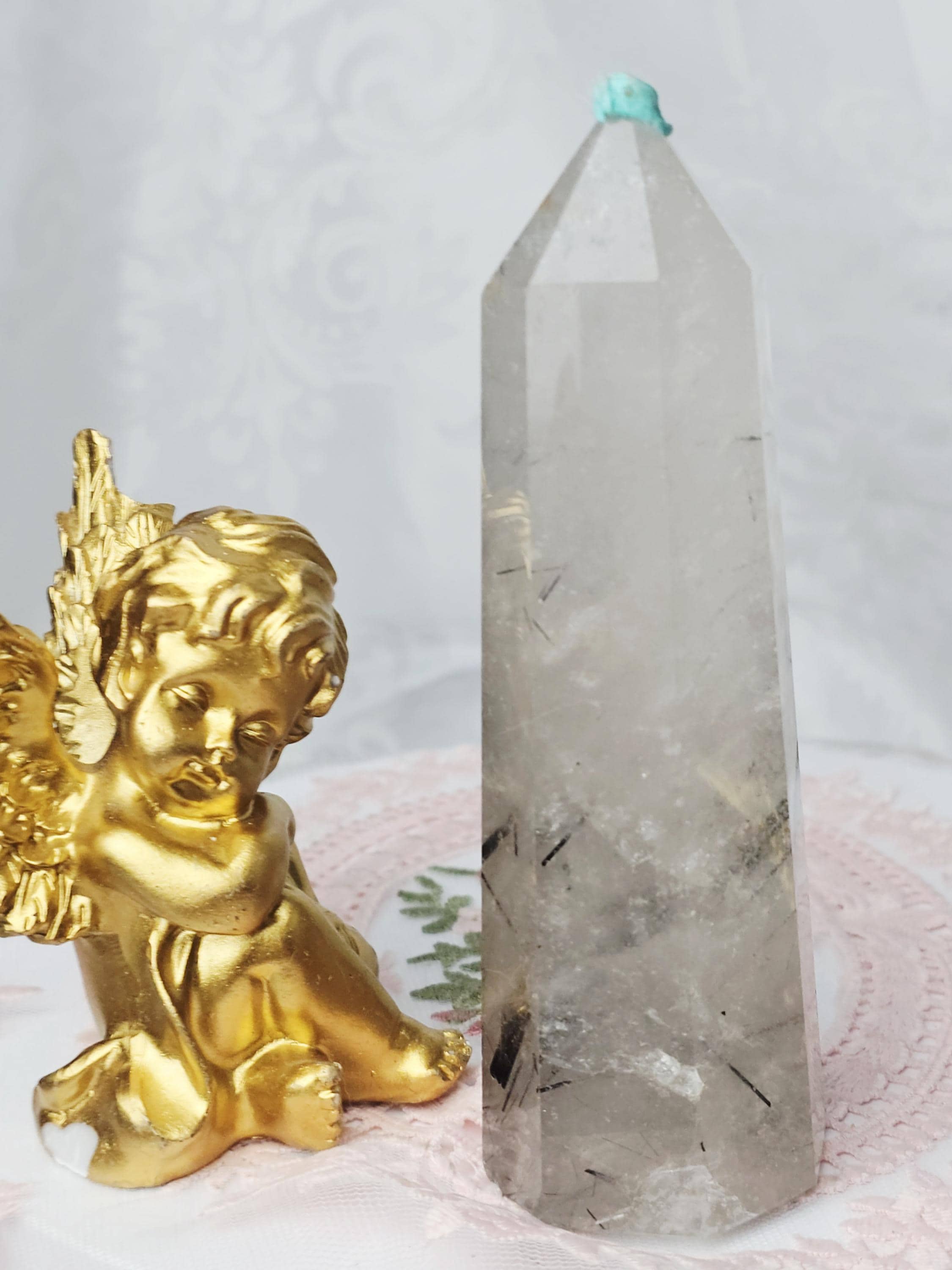 Black Tourmaline Rutilated Tower with rainbows and flash. It's a great for harmonizing, protection and abundance. The sphere is a unique find for any true crystal lover or Healer. The flashes throughout make it a perfect collectible.
