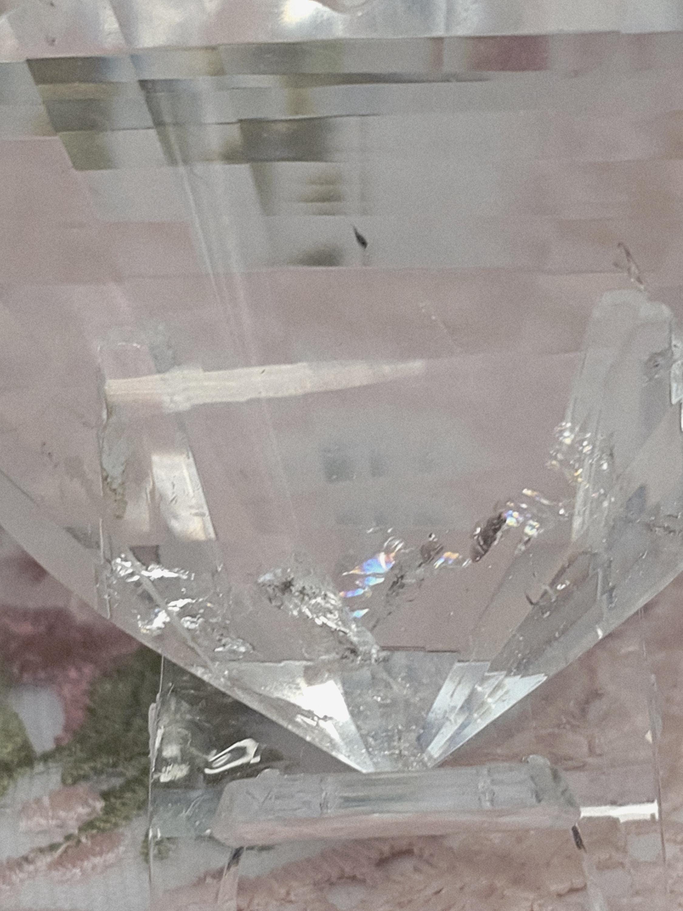 Lemurian promotes calmness and a sense of peace. Lemurians are healing tools. They are high level manifestators. This Lemurian point has several rainbows. It uses Sacred Geometry through the combination of complex carving and materials . It is thought to bring about change at a fast rate.