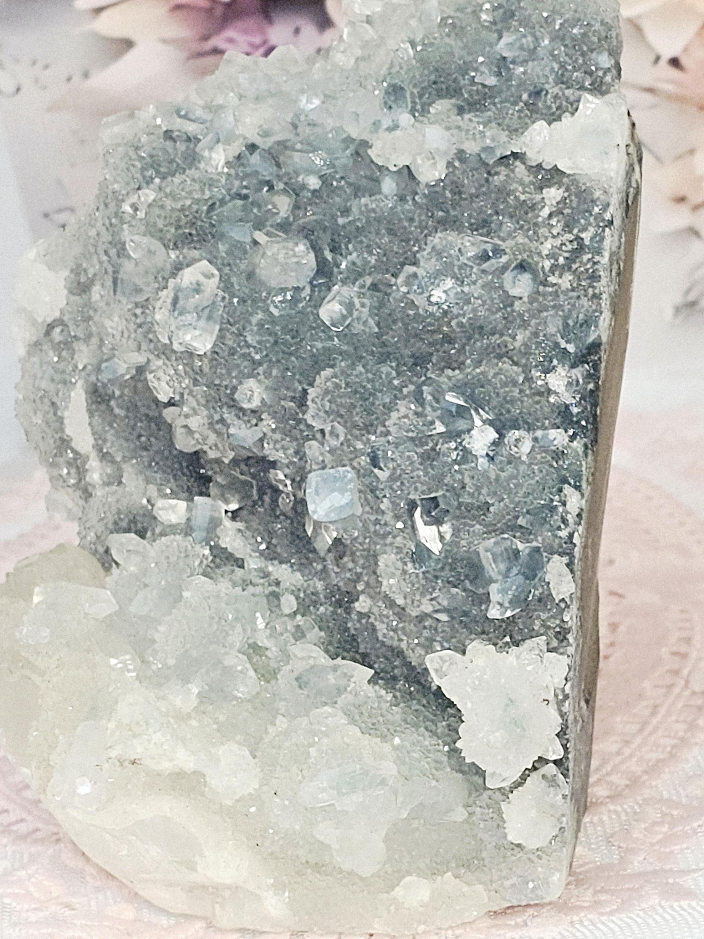 These are Divine Realm crystal lifting you to higher consciousness. It has an angelic frequency. Apophyllite is a strong conducter of enhanced spiritual communication. A very cleansing stone. Blue Apophyllite has an aquatic or oceanic vibrationn