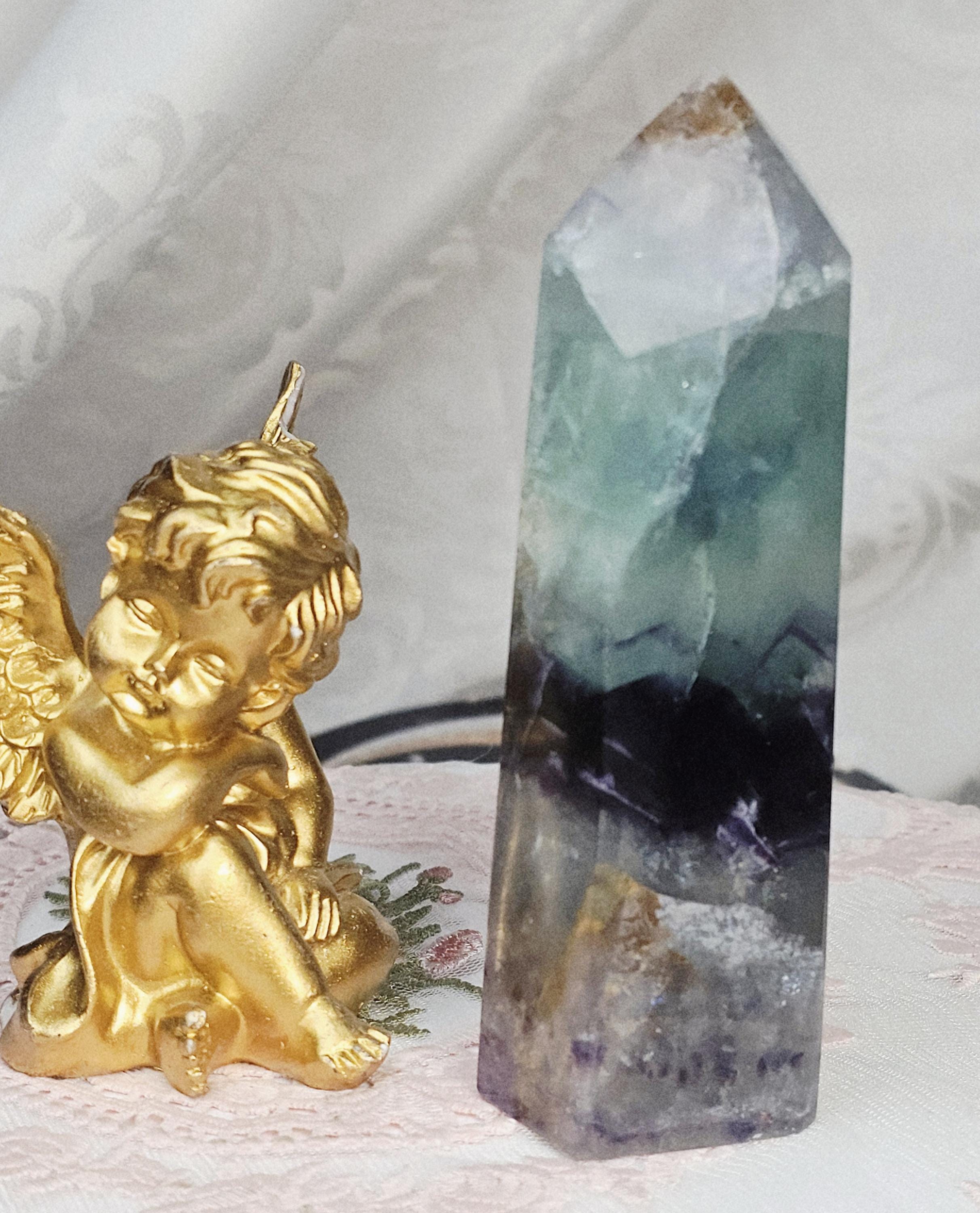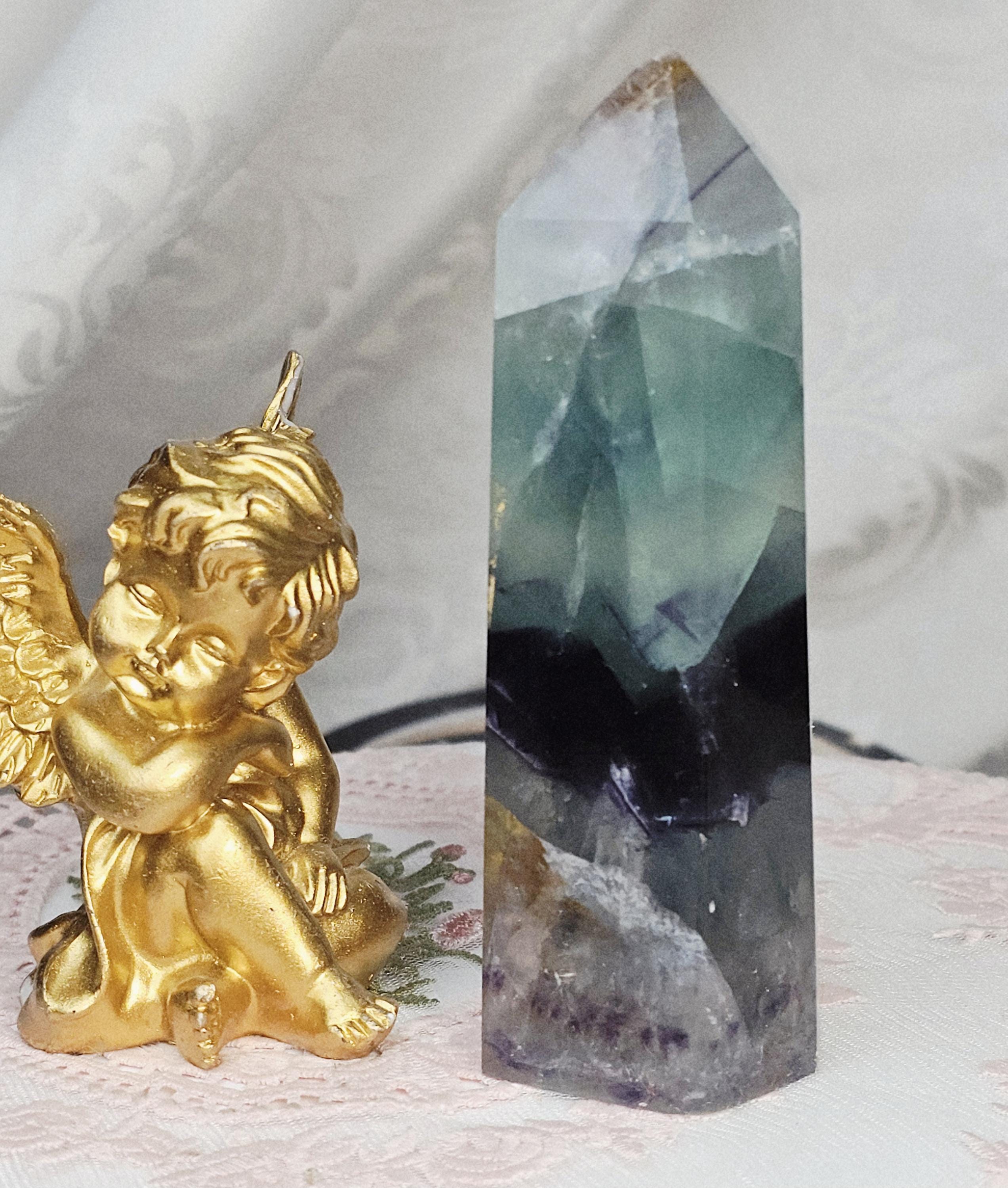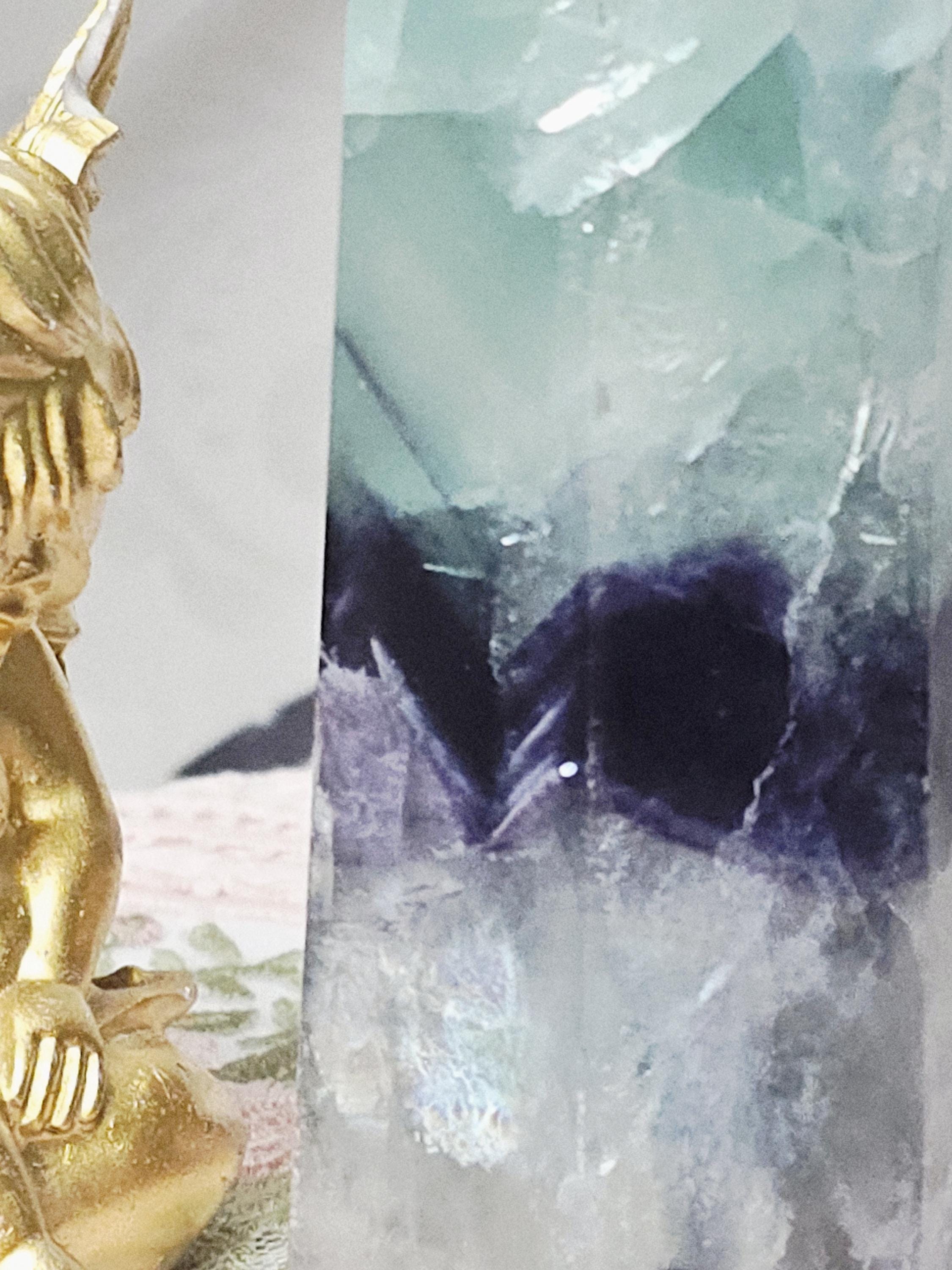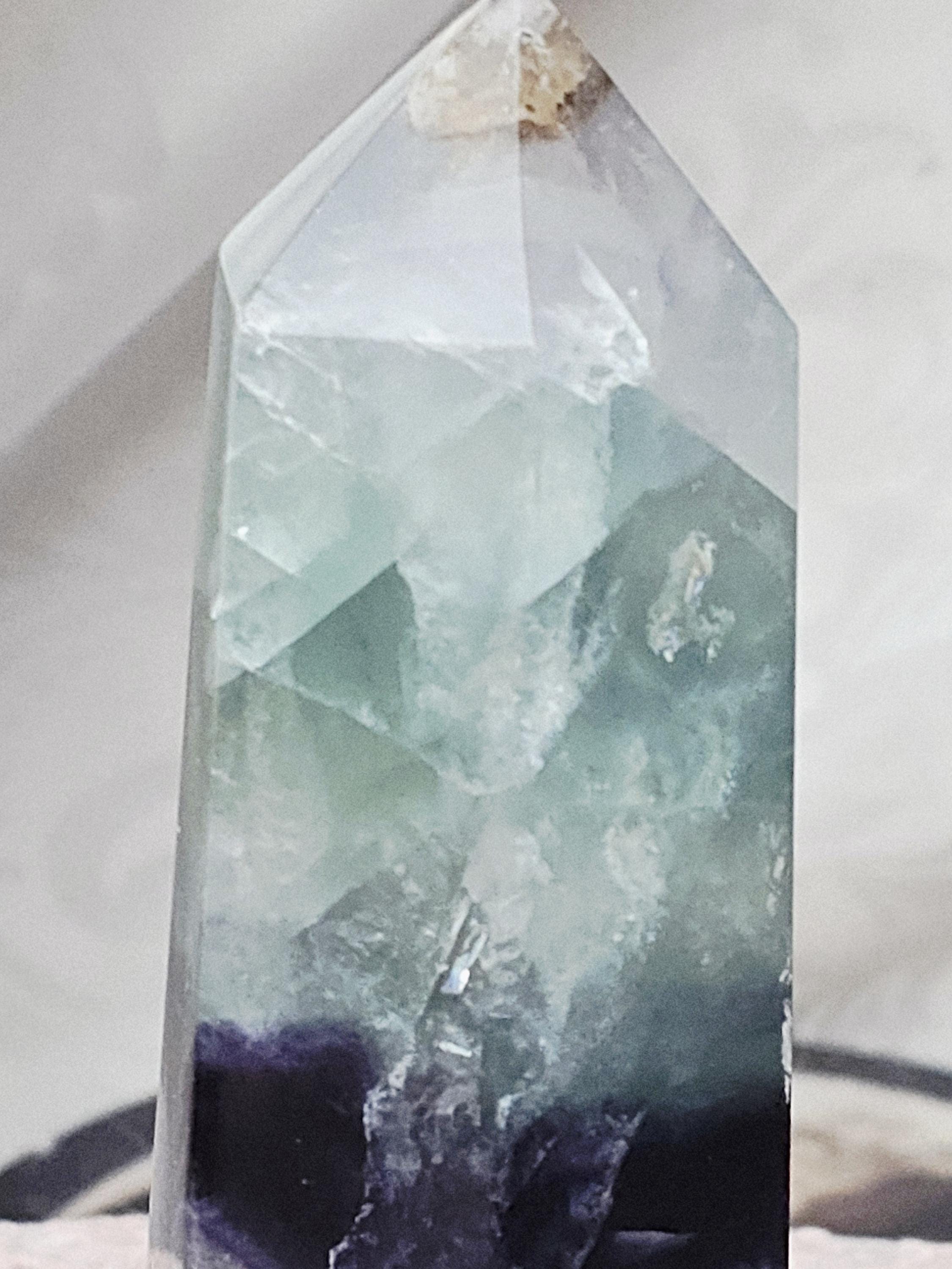 Beautiful Fluorite Turquoise Blue and Purple tower .It has windows and great banded depth. Beautiful gift for everyone on every occasion. Great patterns of oceanic blue, purple, yellow, white and green colors. Let this tower bring sunshine into your space. Perfect for any Fluorite or crystal lover. This beauty is a nice statement piece Fluorite at a great price.